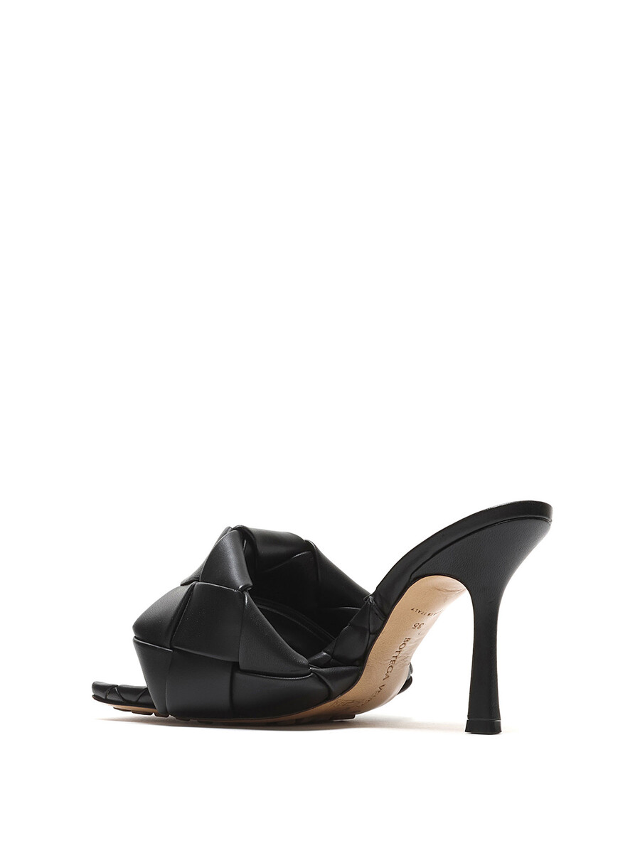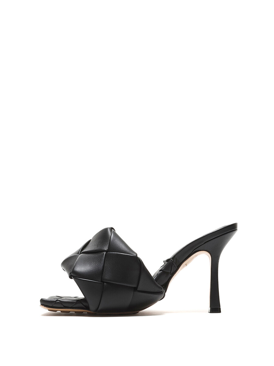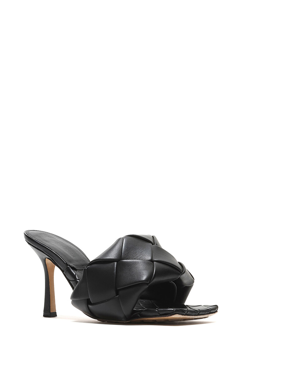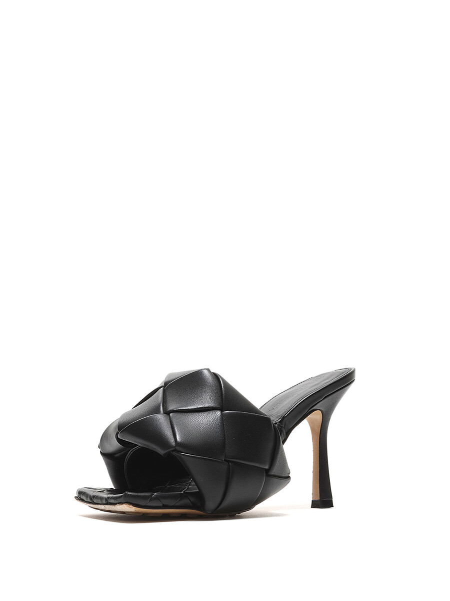 Leather heeled sandals in black with Intrecciato quilted detailing. Slip-on style. Square toe design. Rubber sole.