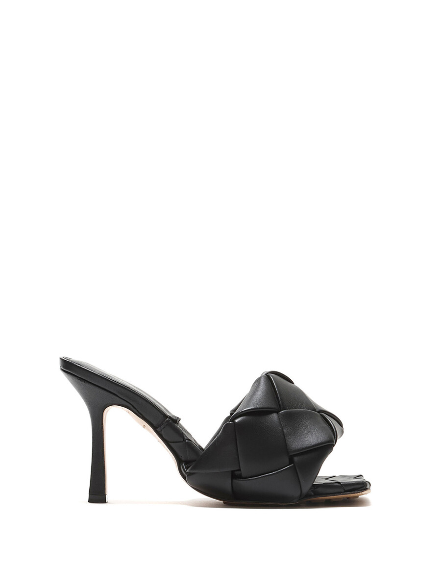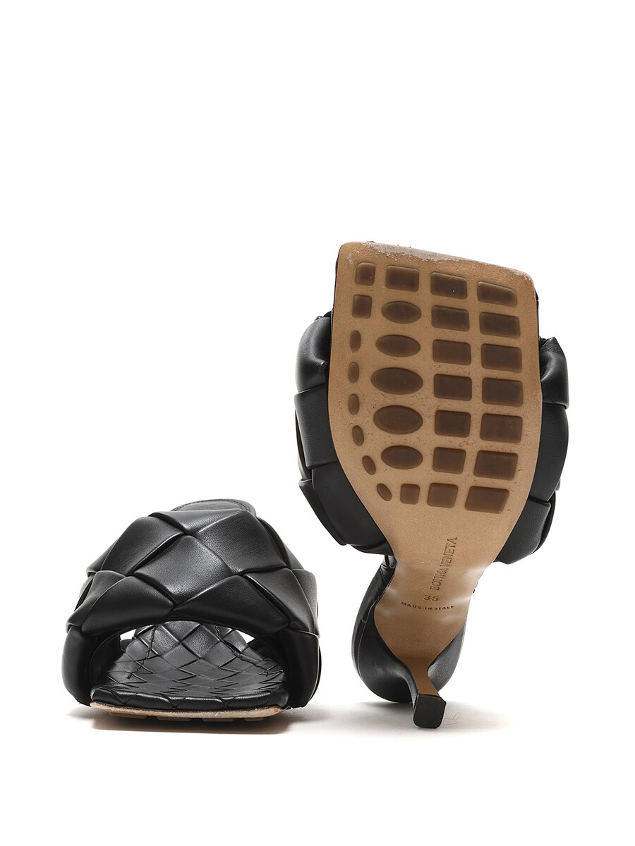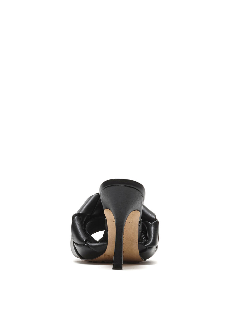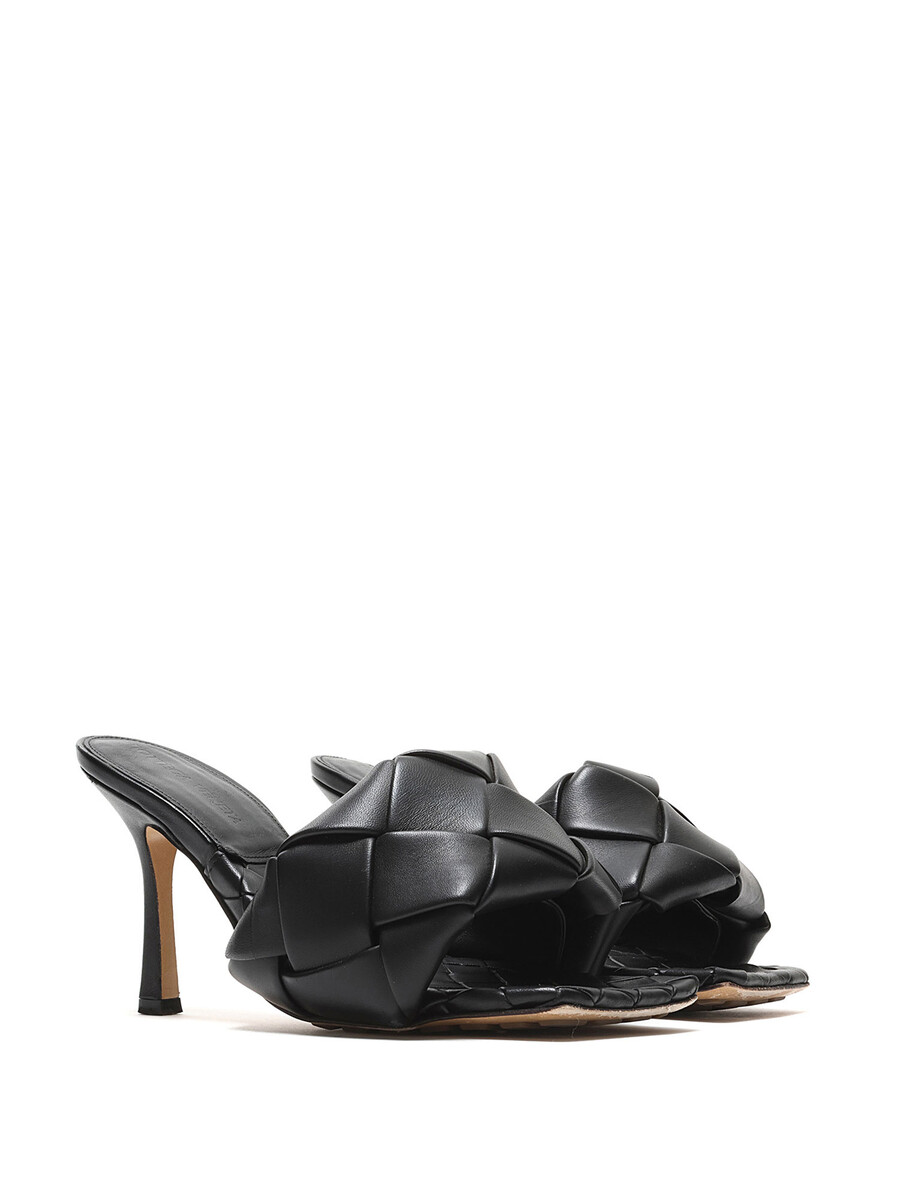 Leather heeled sandals in black with Intrecciato quilted detailing. Slip-on style. Square toe design. Rubber sole.