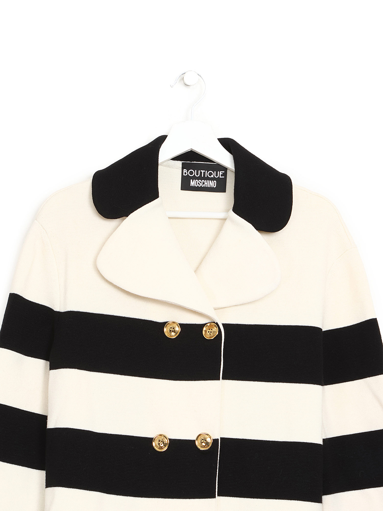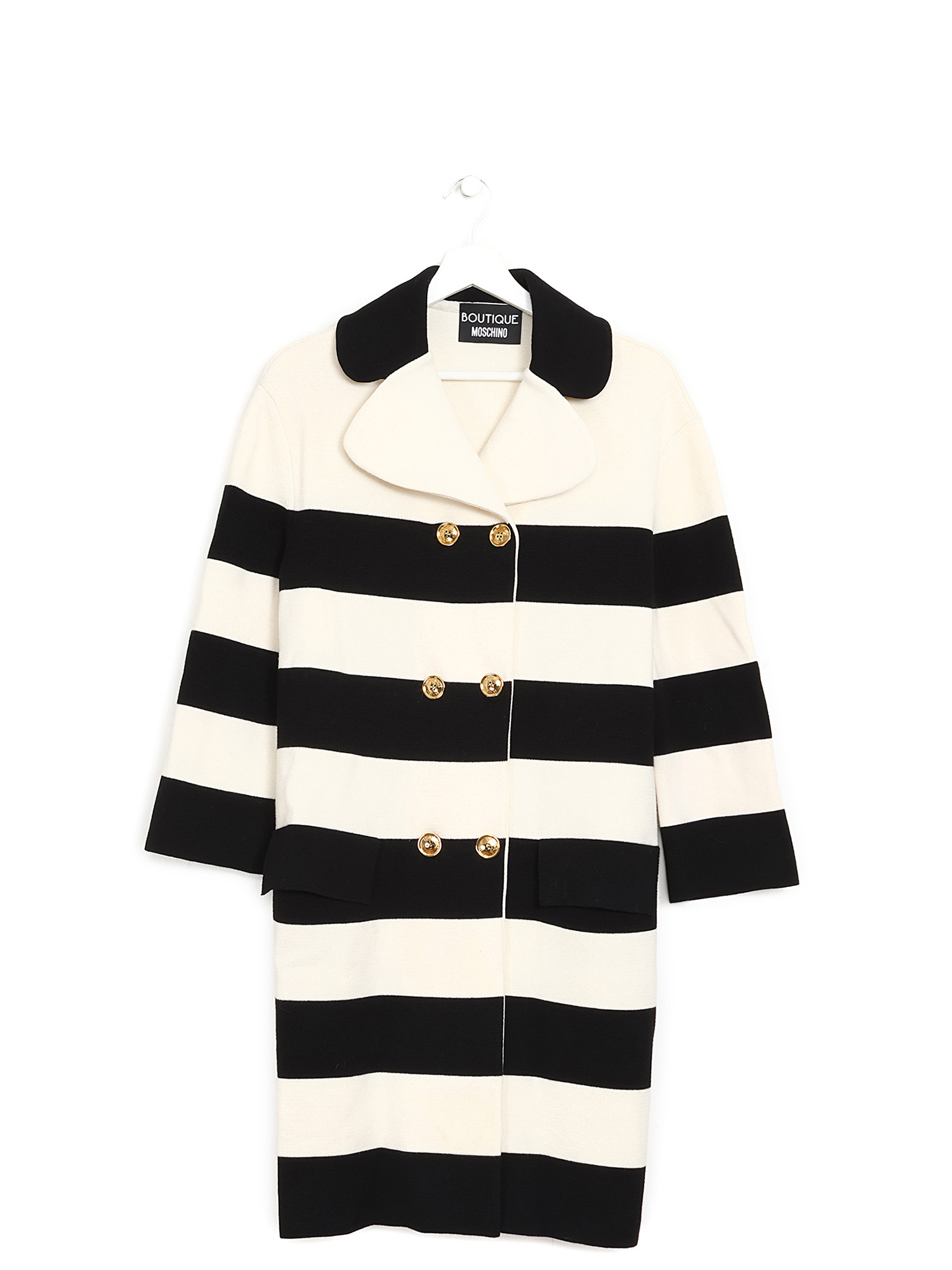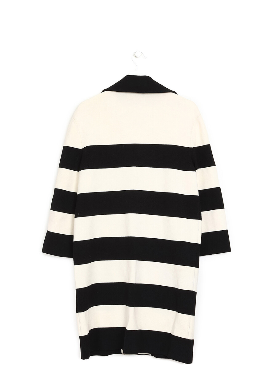Long sleeve coat with black and white striped pattern. Button closure with gold finish. Shirt collar.