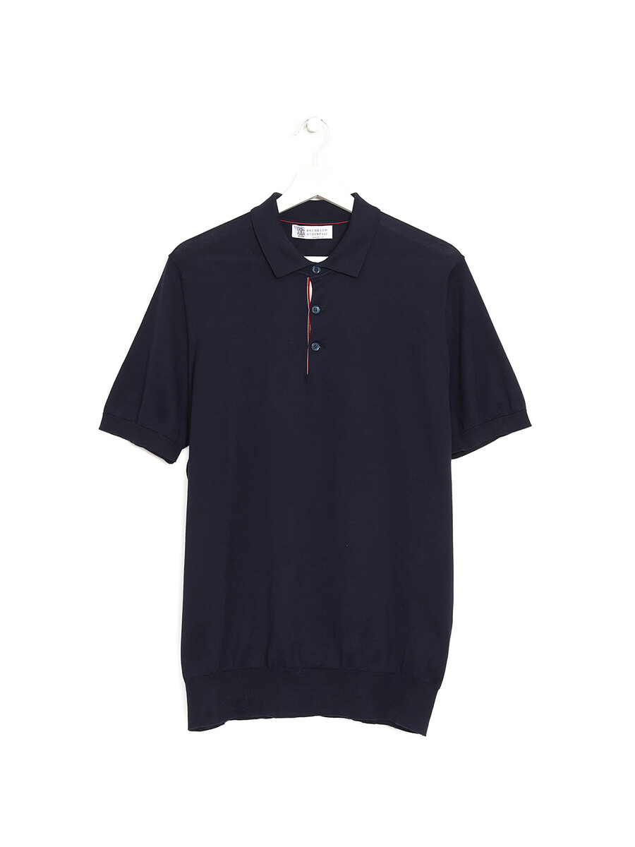 Navy blue short-sleeve cotton knit polo shirt. Classic collar. Lightweight knit construction.