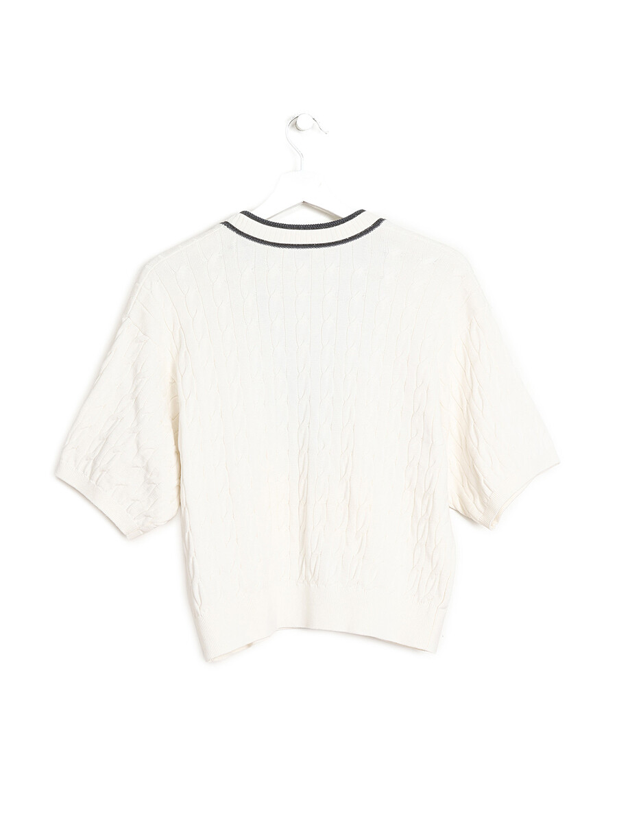 Cable knit short-sleeve cardigan in white with contrasting grey trims. Button closure at front.