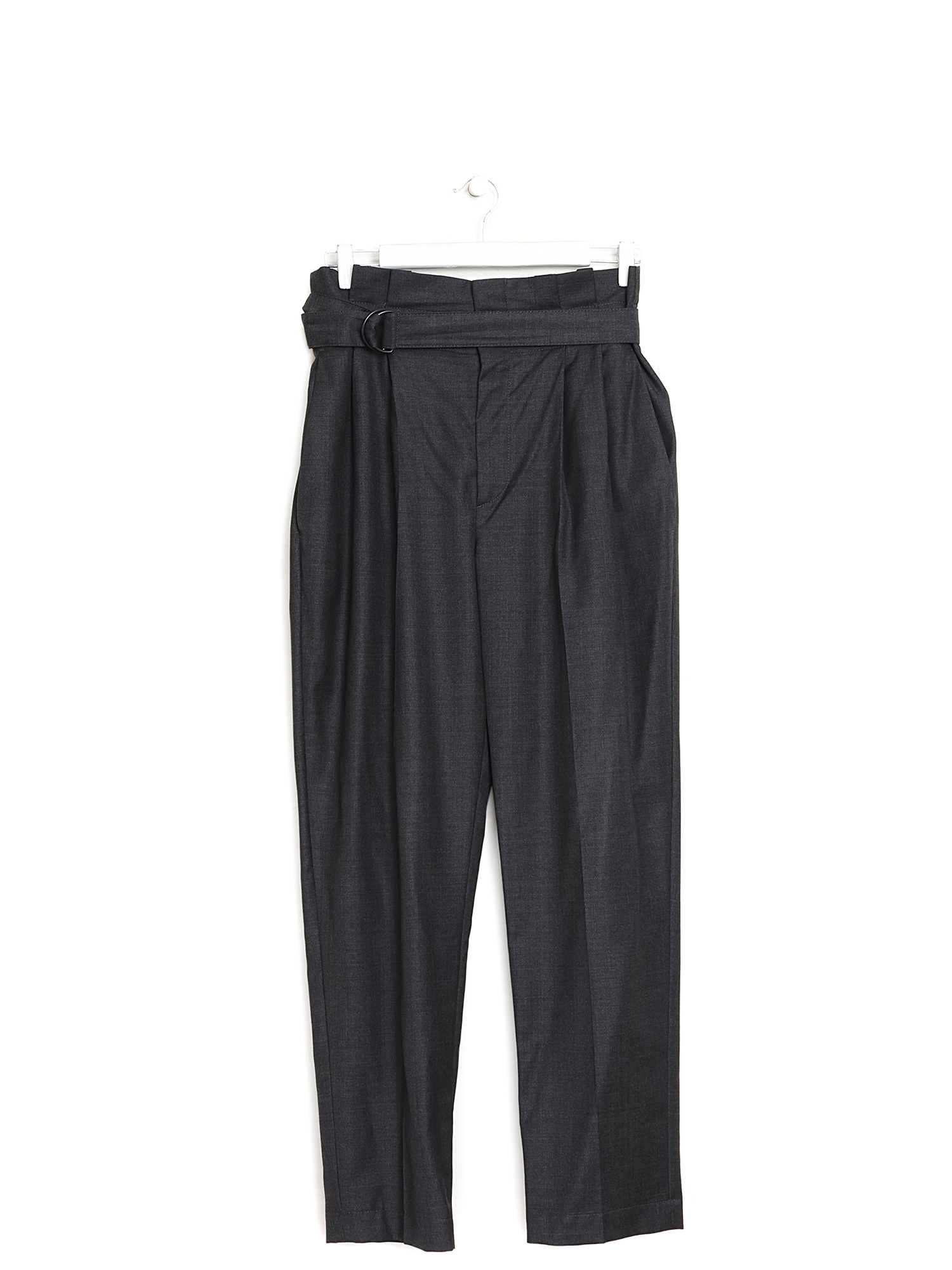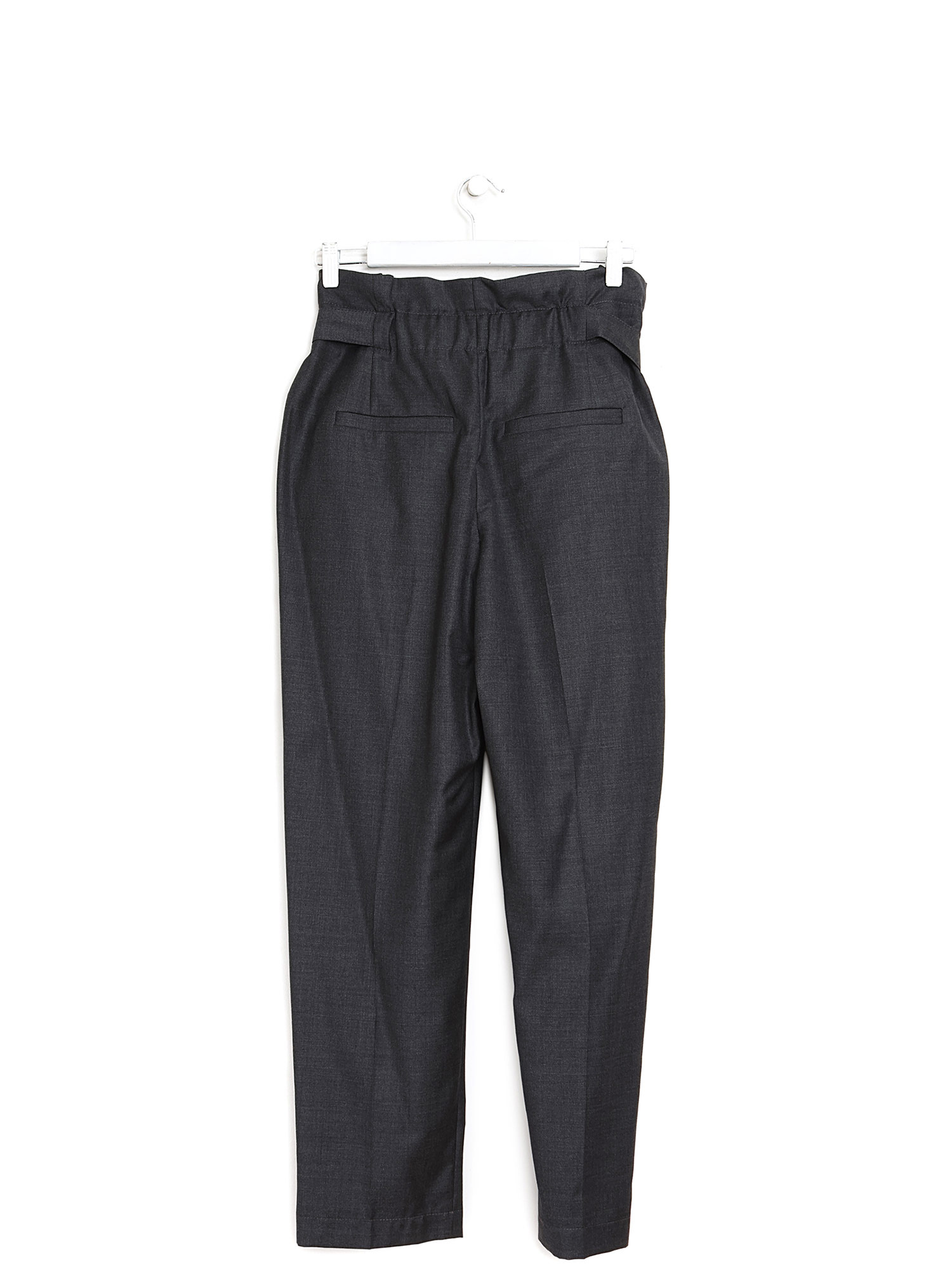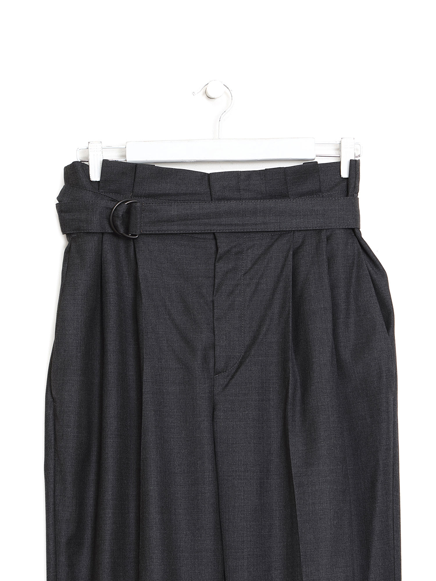 Grey wool trousers with a tailored fit. Zip and button closure at the front. Pleated detailing along the legs.