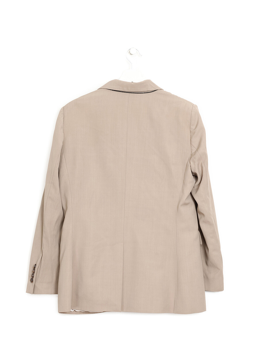 Double-breasted beige jacket featuring a notch lapel collar, button closure, and two front flap pockets.