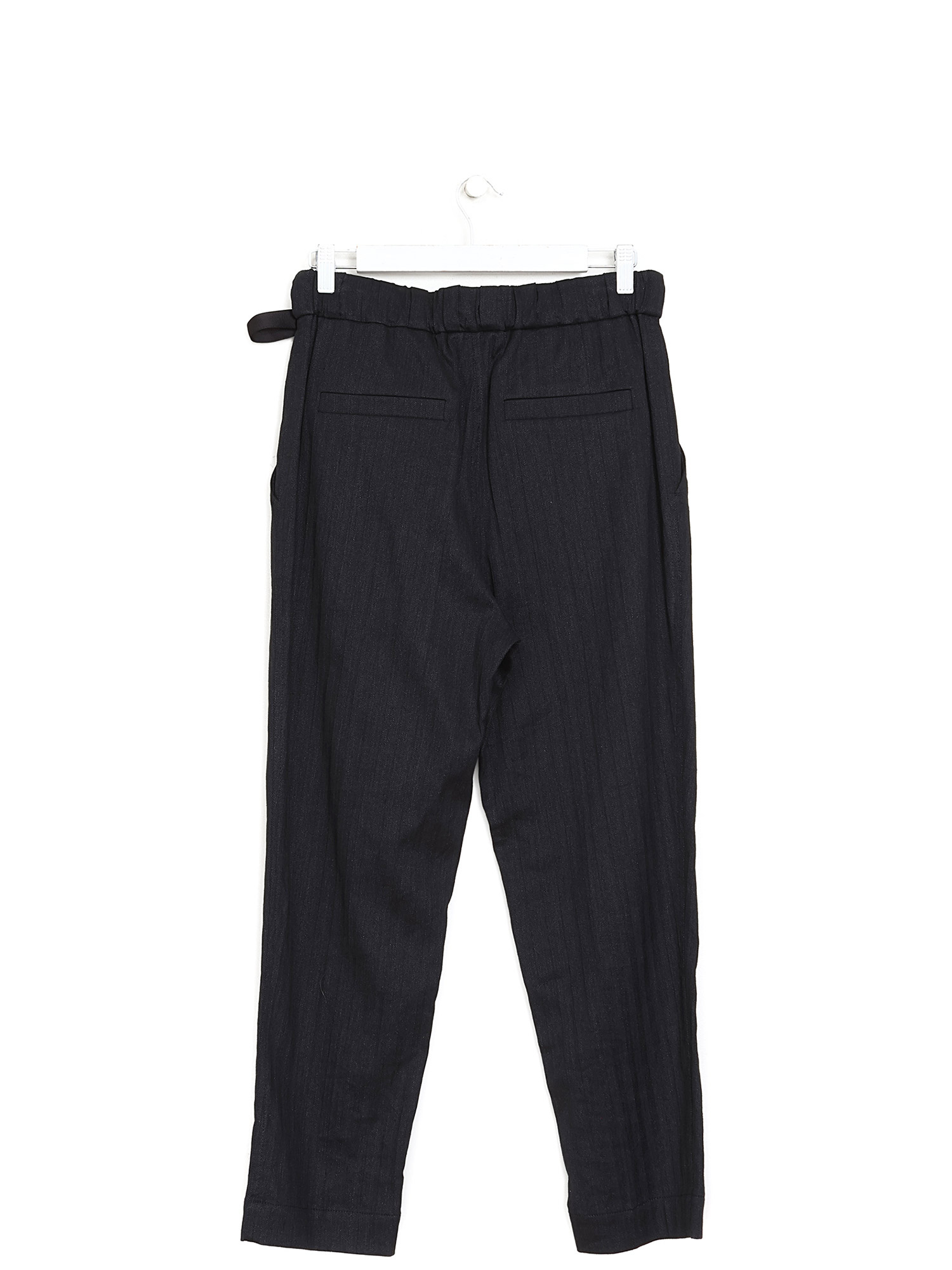 Slim-fit black trousers featuring an elastic waistband.