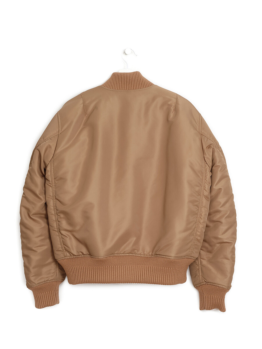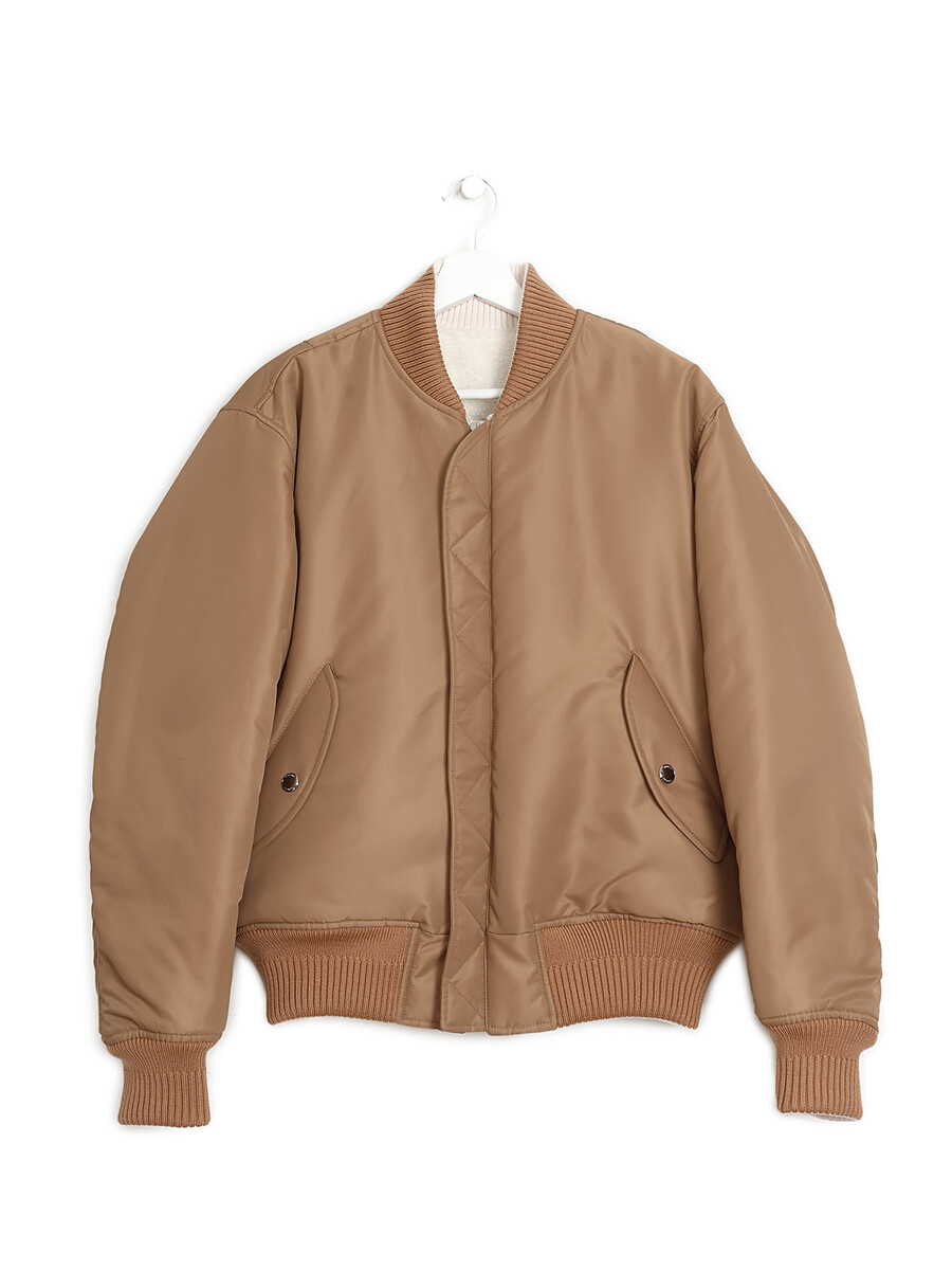 Long sleeve bomber jacket in synthetic white shearling and brown nylon. Ribbed collar. Zip closure. Zippered pocket on the sleeve and flap pockets at the front.
