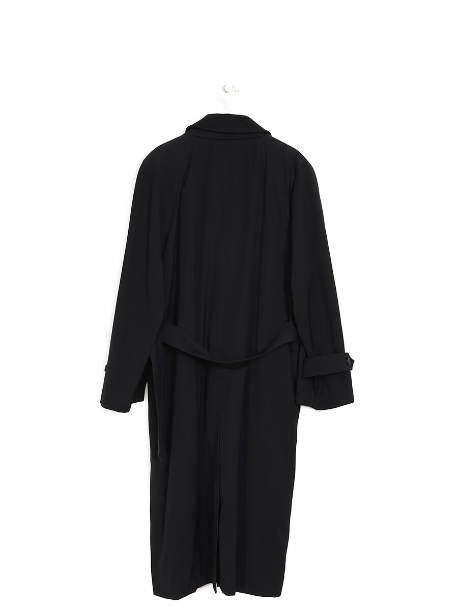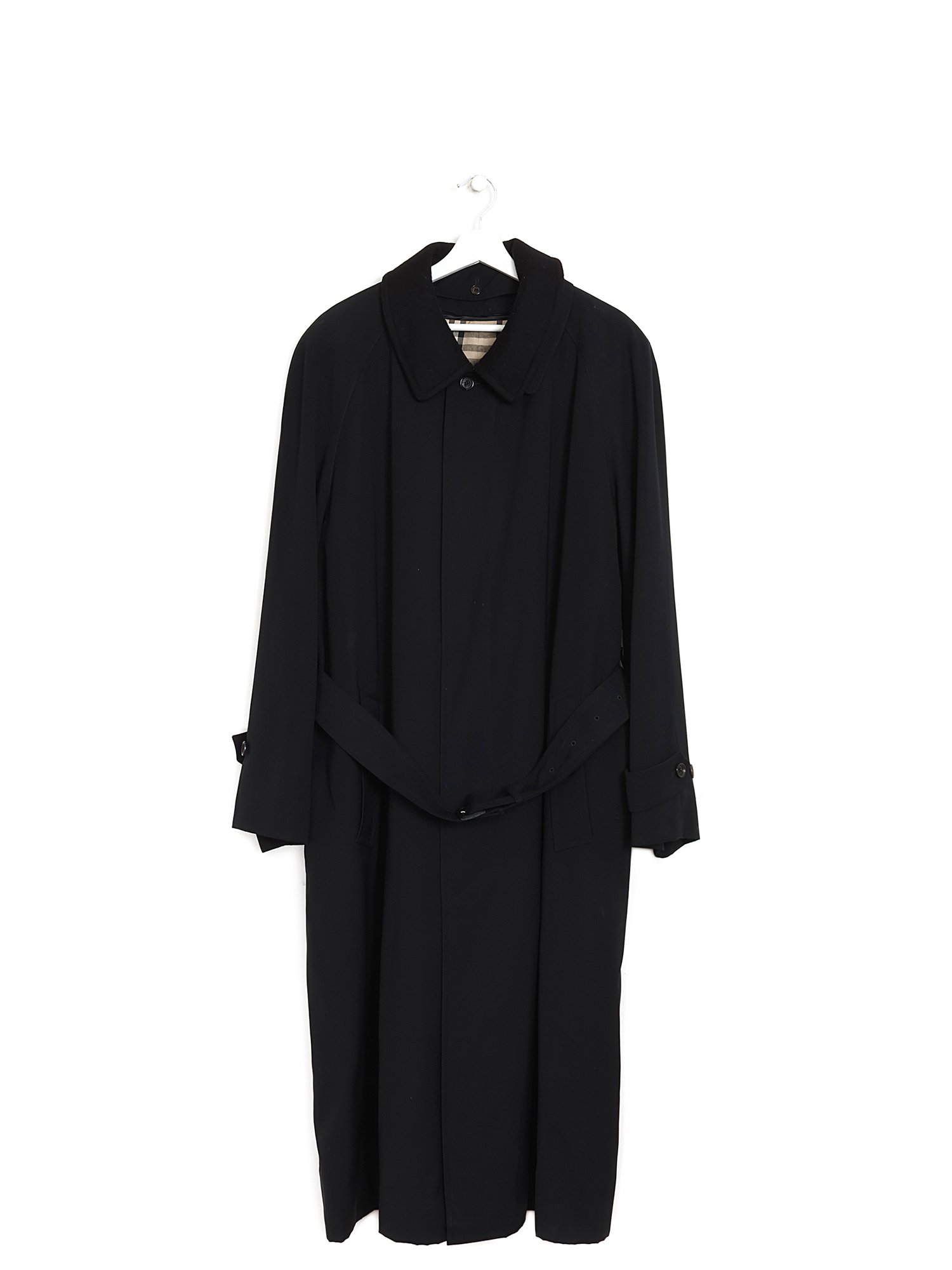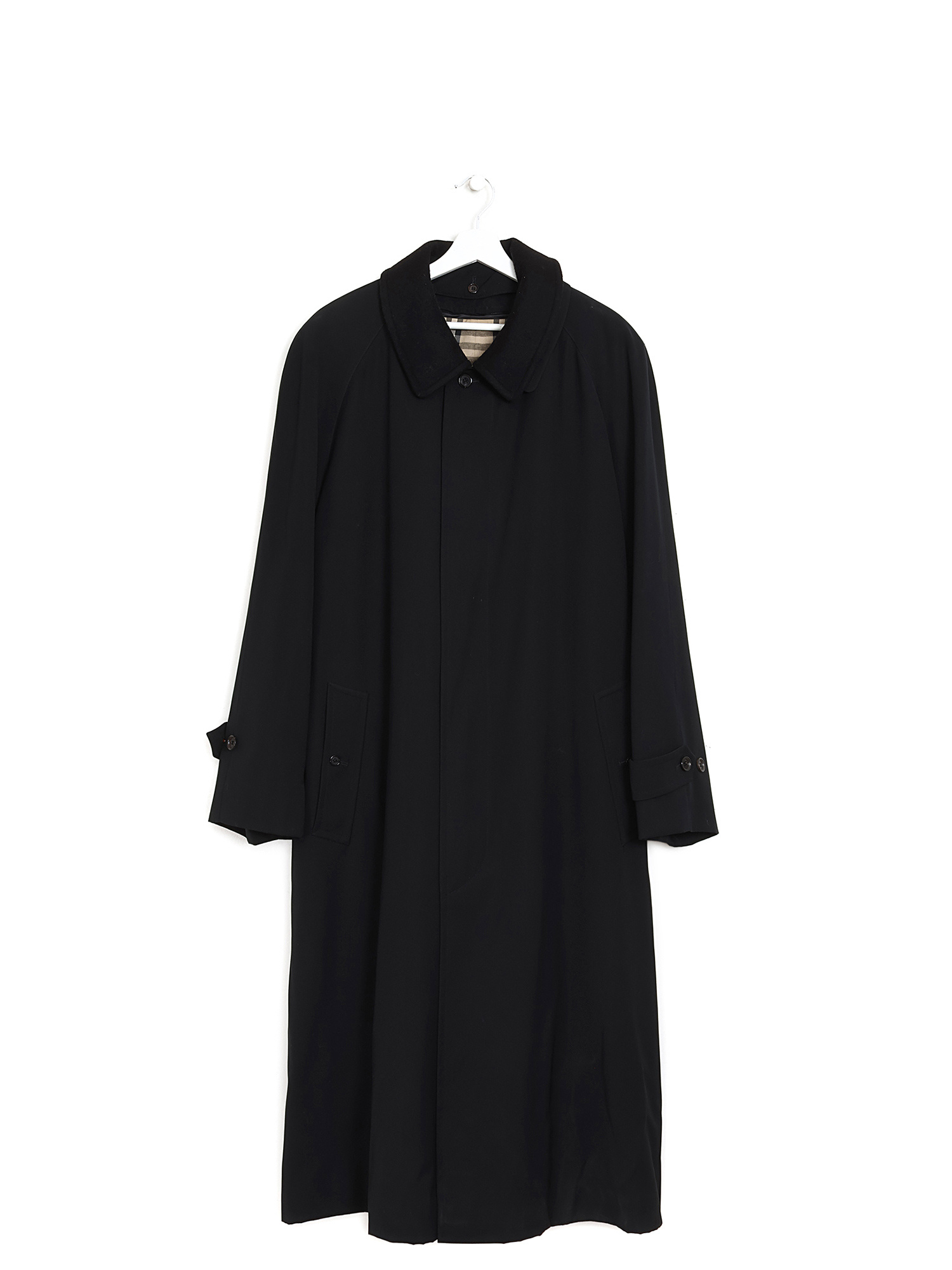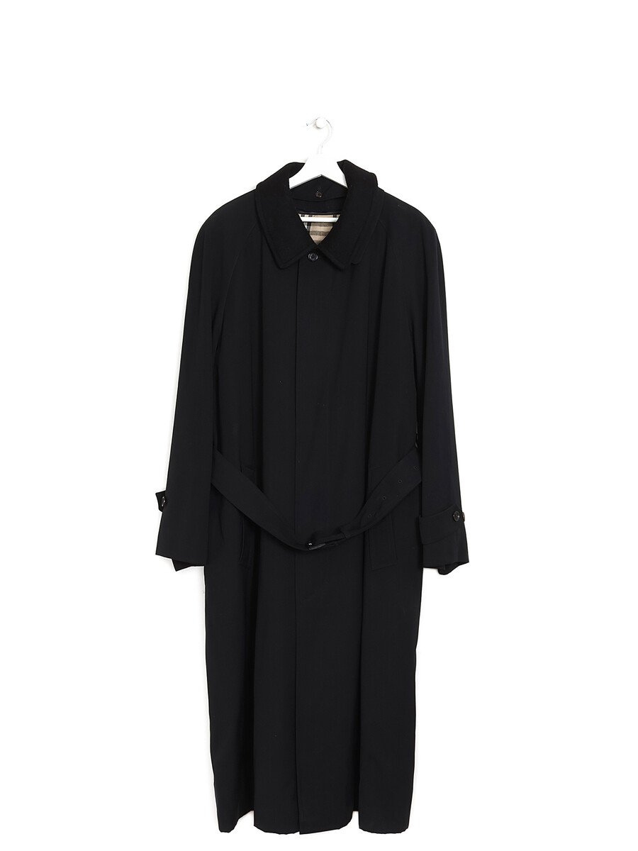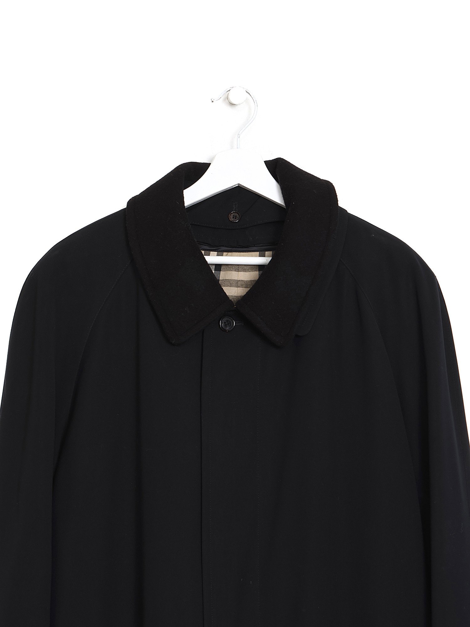 Long-sleeved coat with button closure in front and shirt collar. Black polyester exterior with removable black wool lining featuring classic Burberry check pattern.