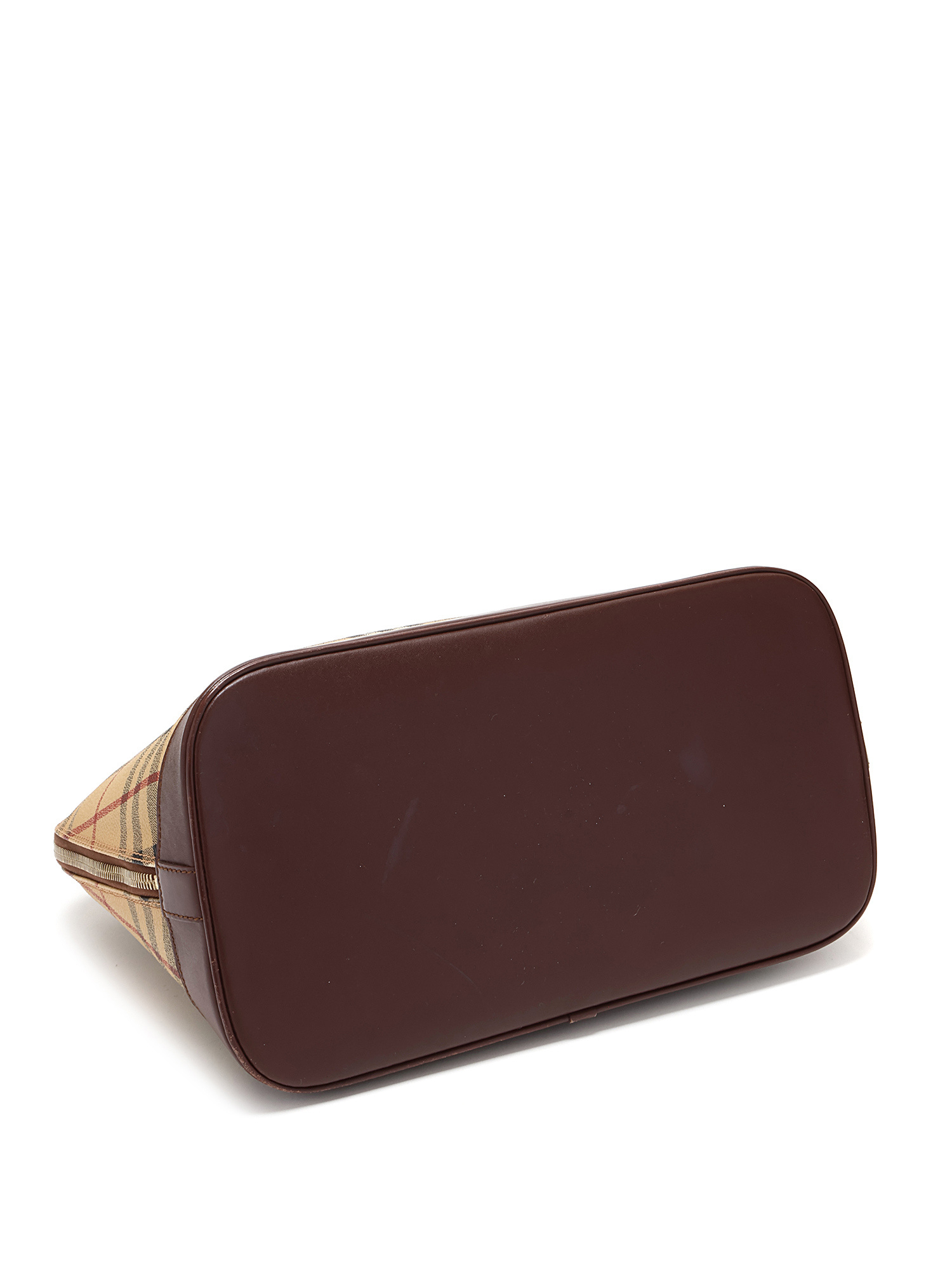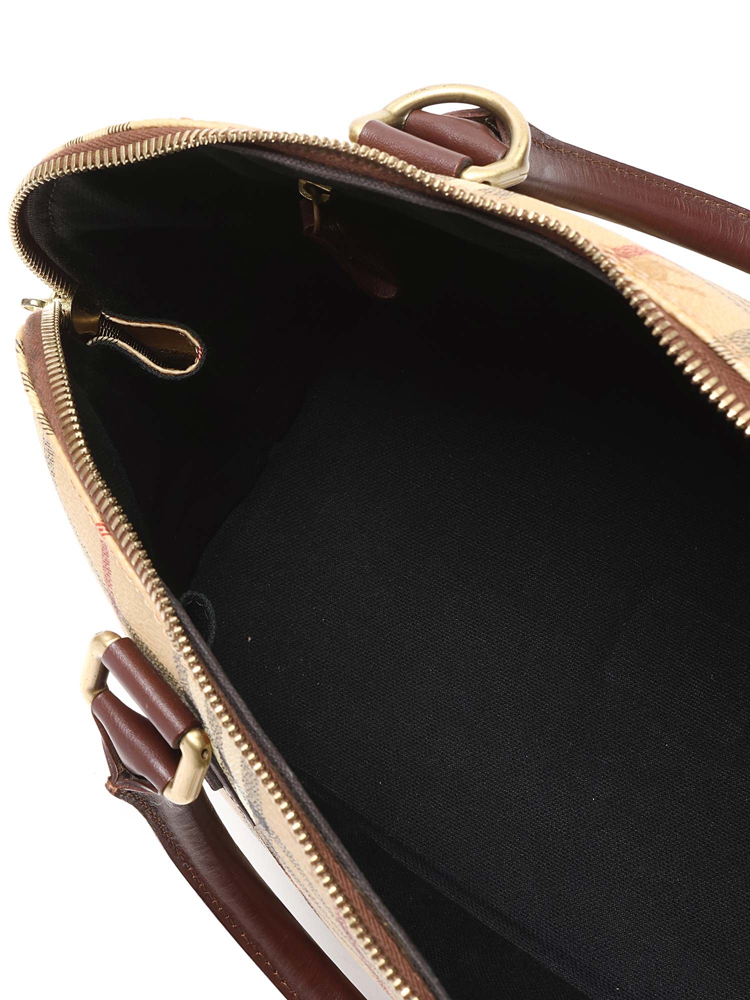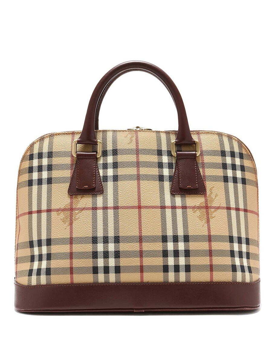 Coated canvas tote bag with plaid pattern. Brown leather trim. Zipper closure with lock detail. Two handles with adjustable shoulder strap.