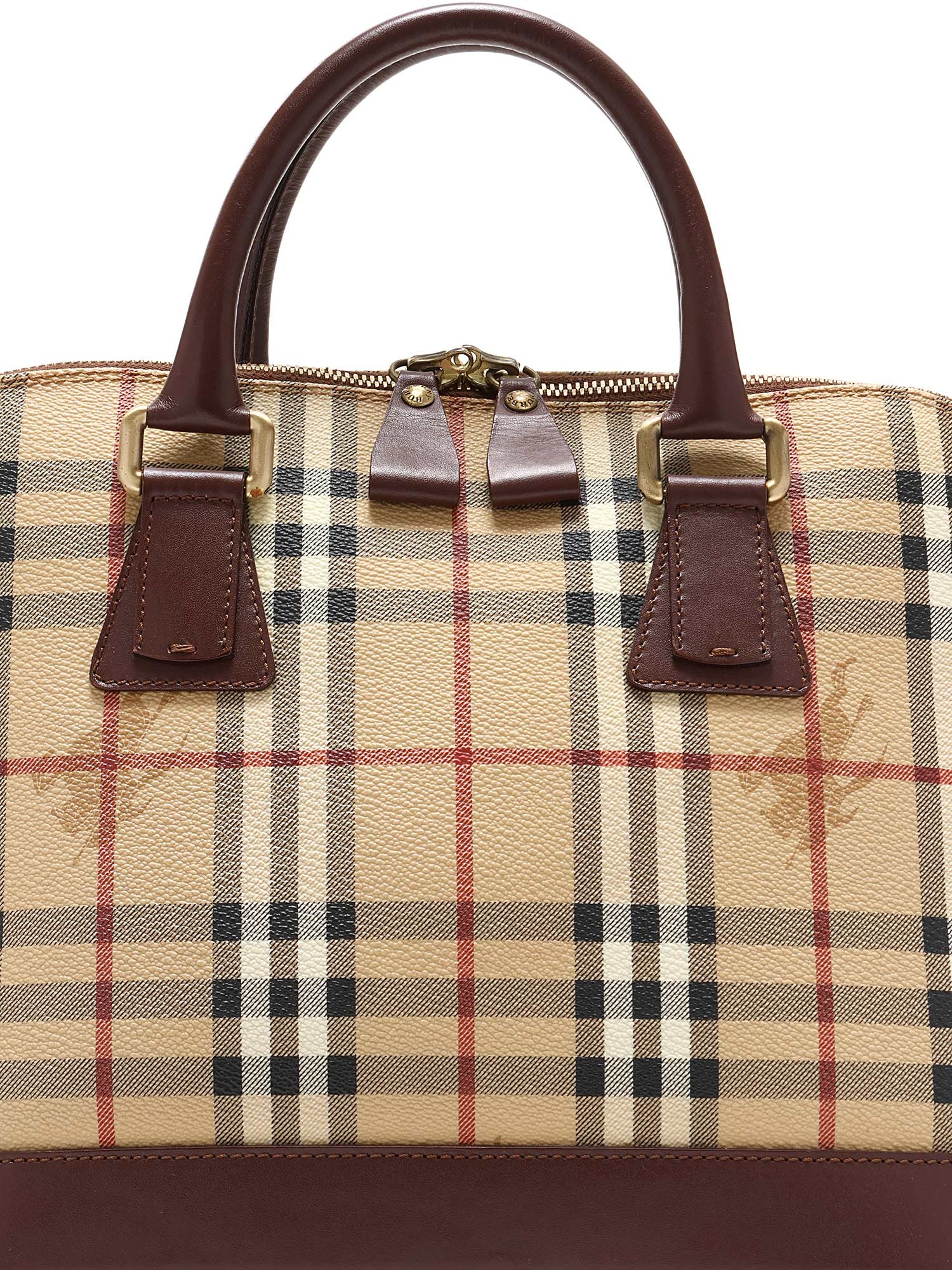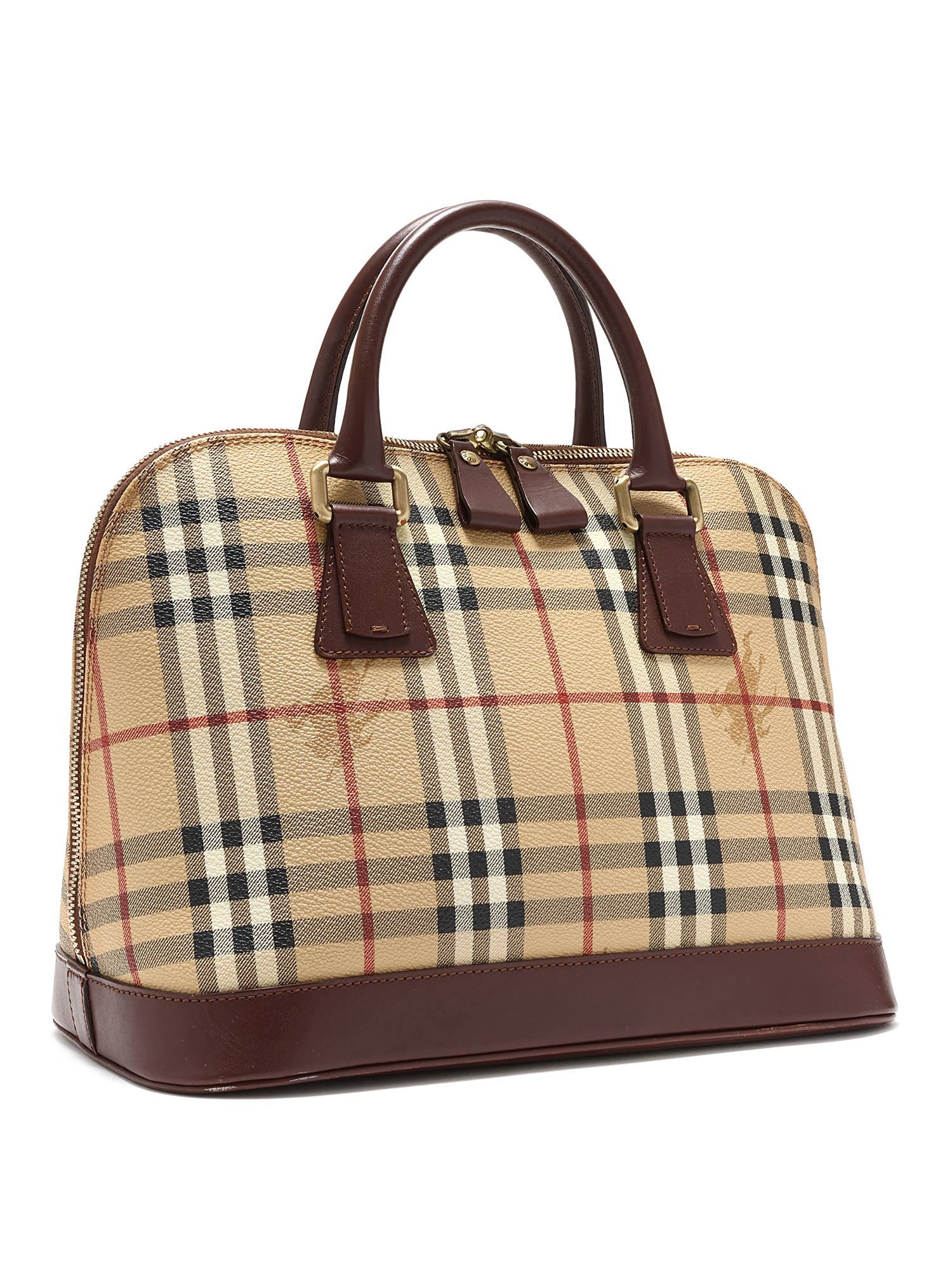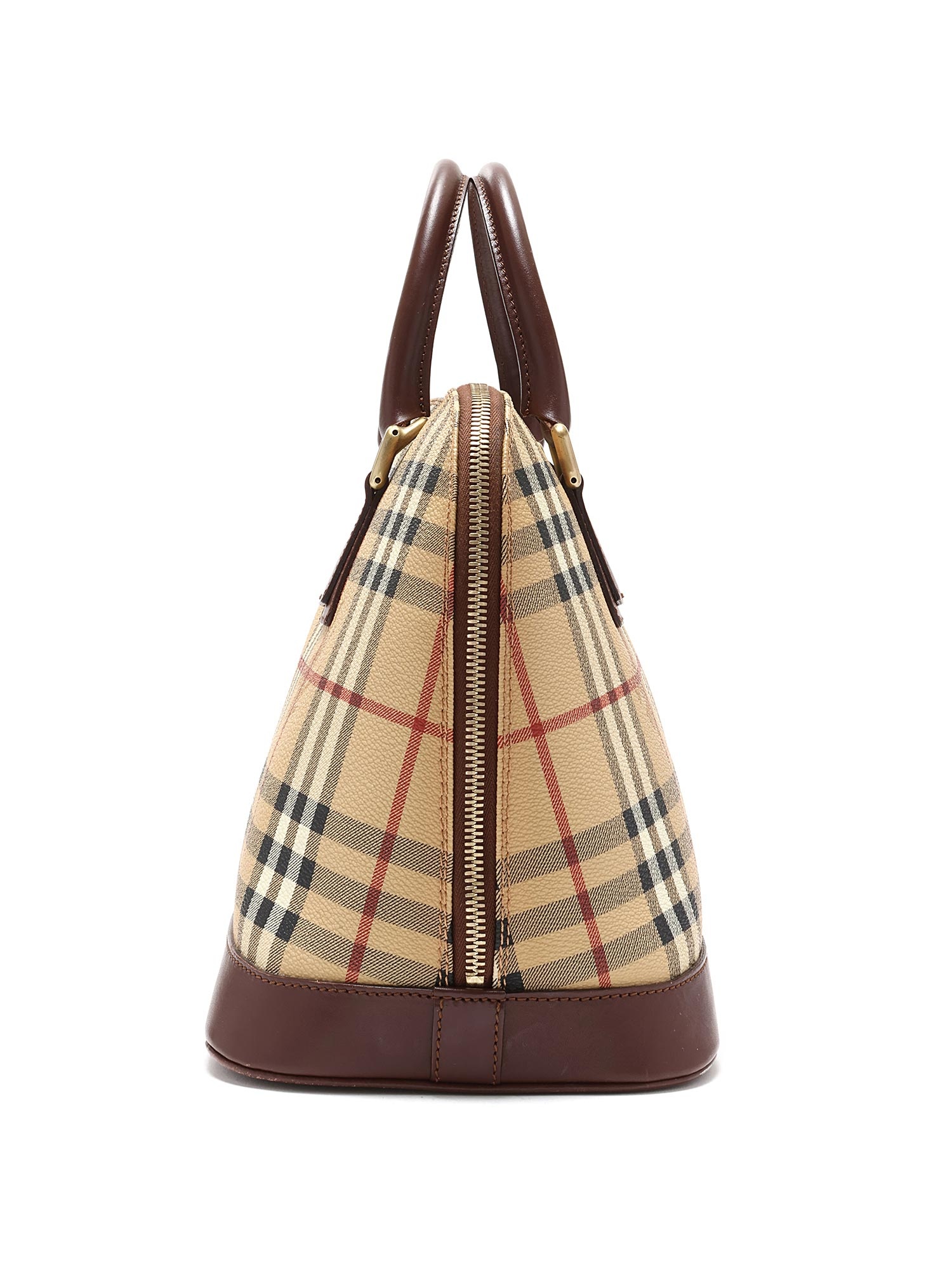 Coated canvas tote bag with plaid pattern. Brown leather trim. Zipper closure with lock detail. Two handles with adjustable shoulder strap.