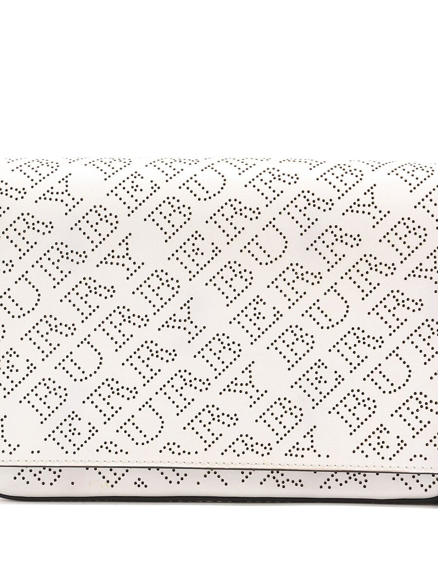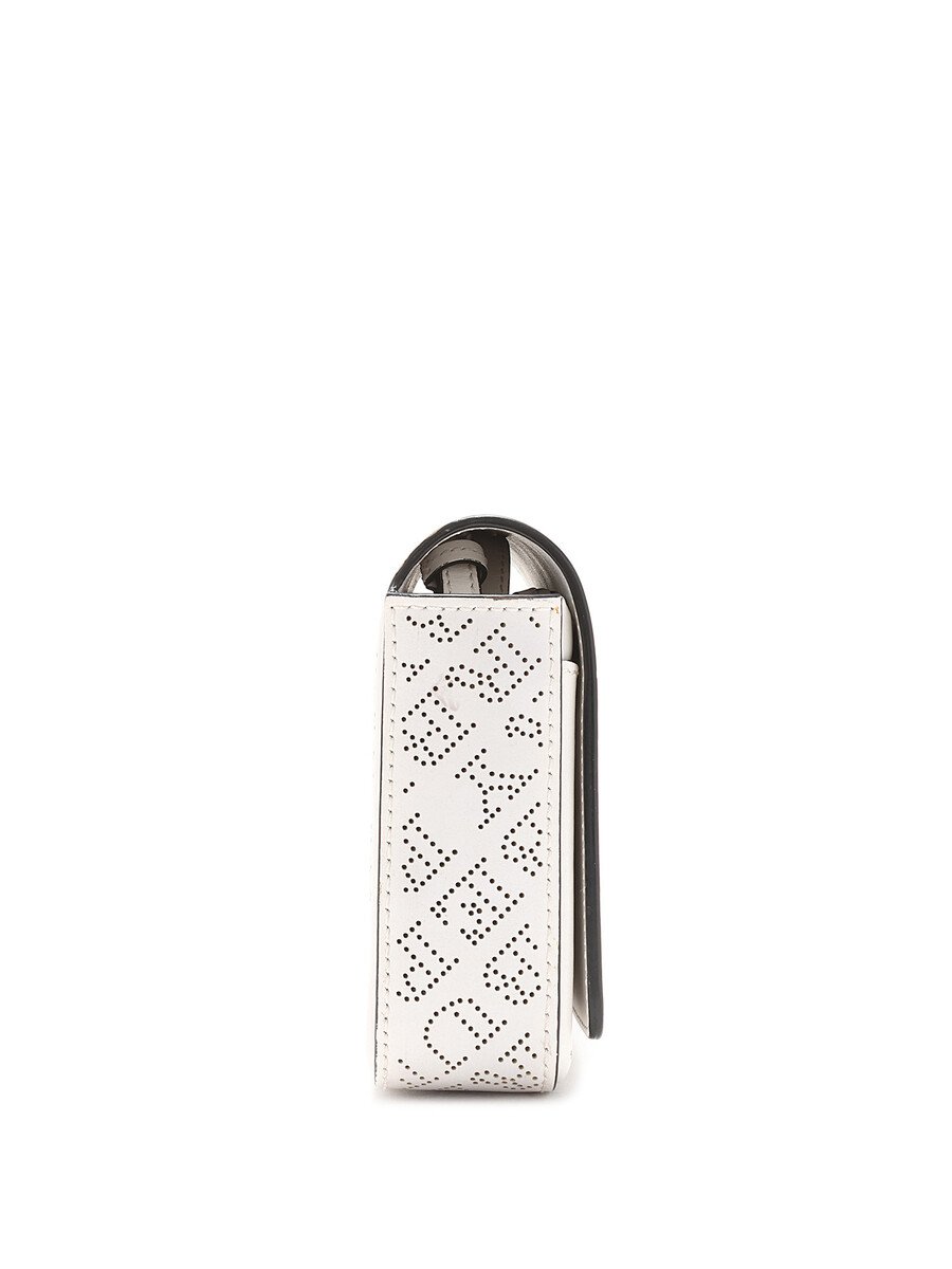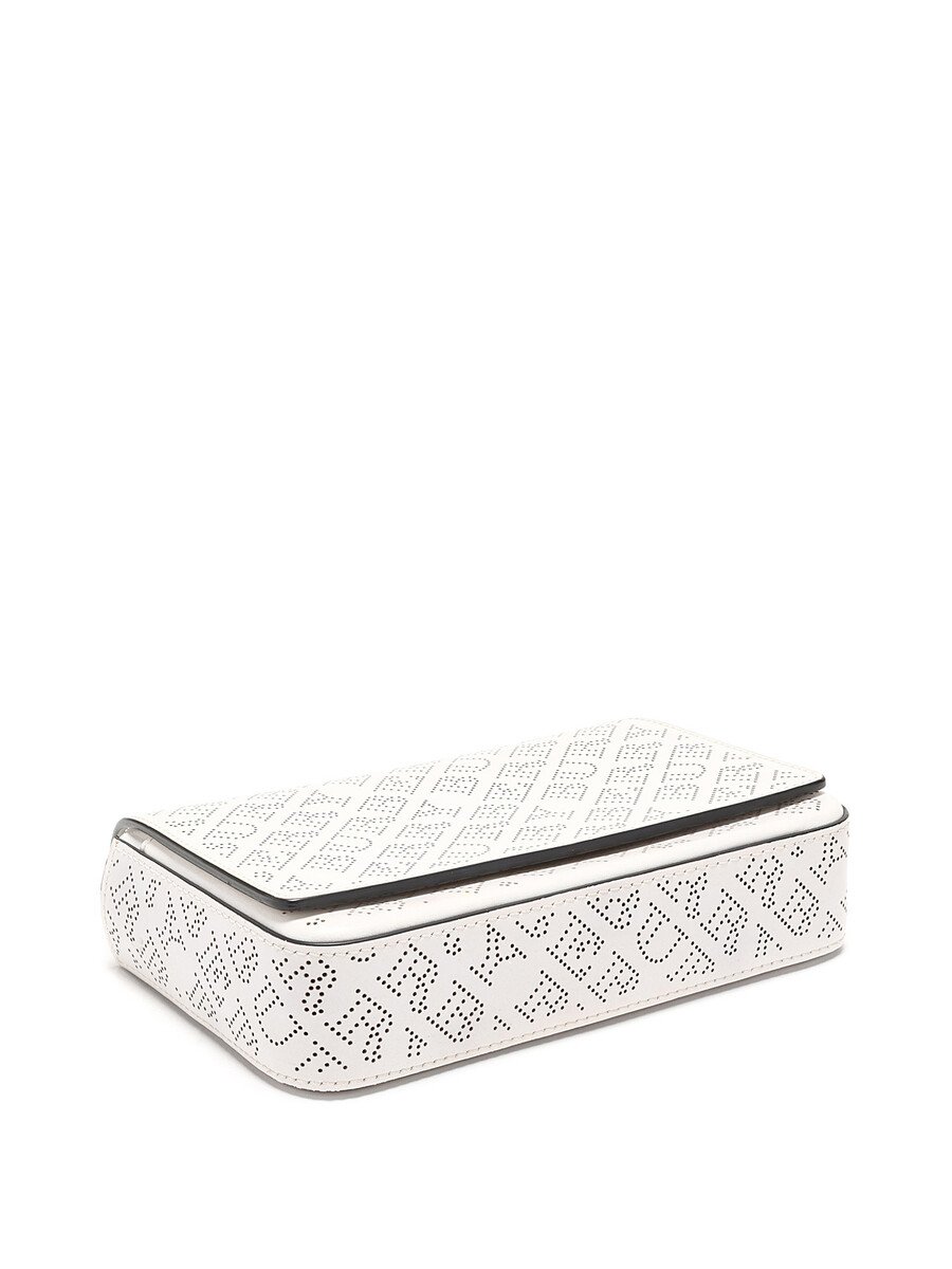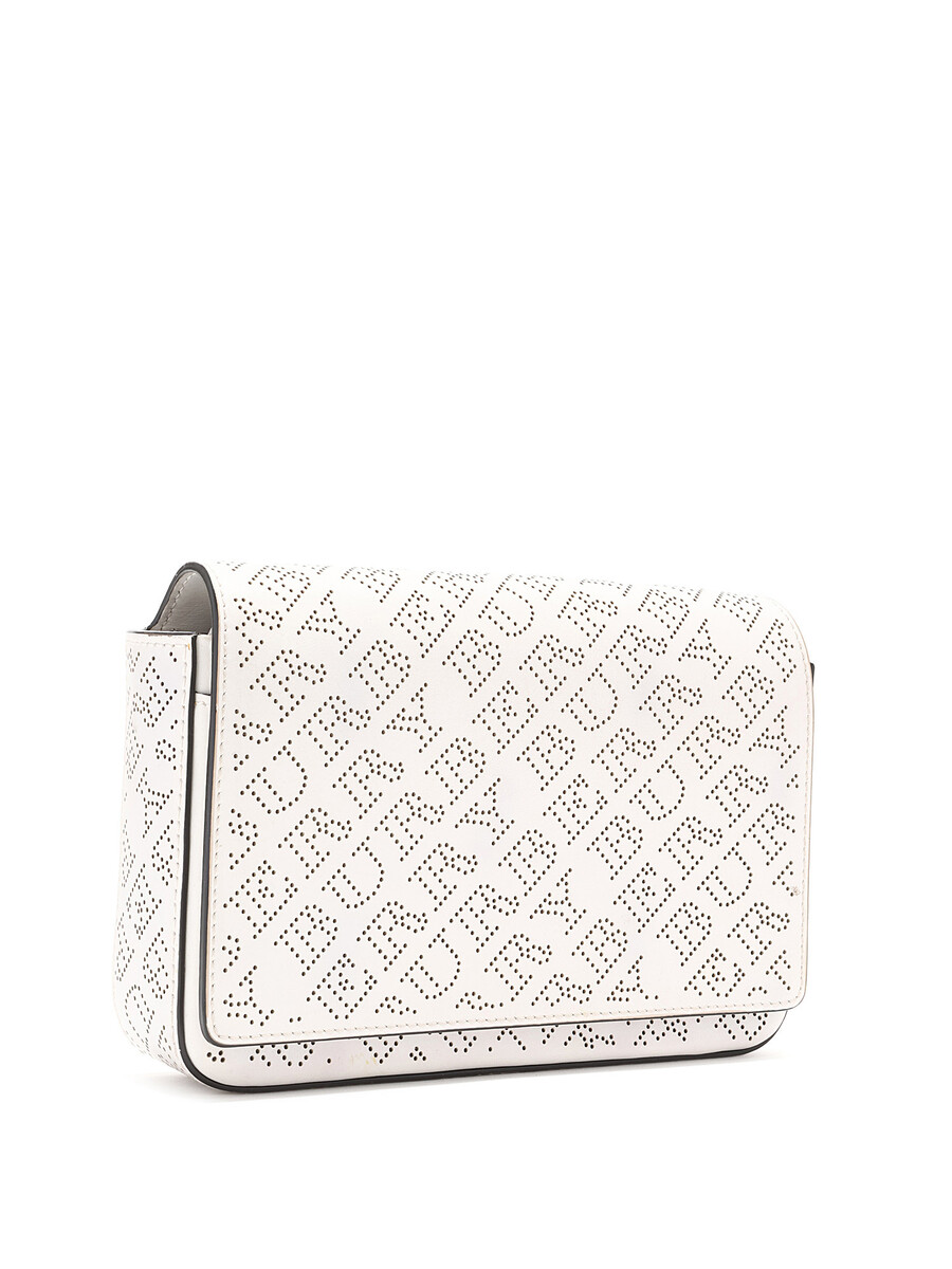 White perforated monogram leather crossbody bag with embossed logo. Magnetic closure and adjustable leather shoulder strap. Silver-tone hardware.