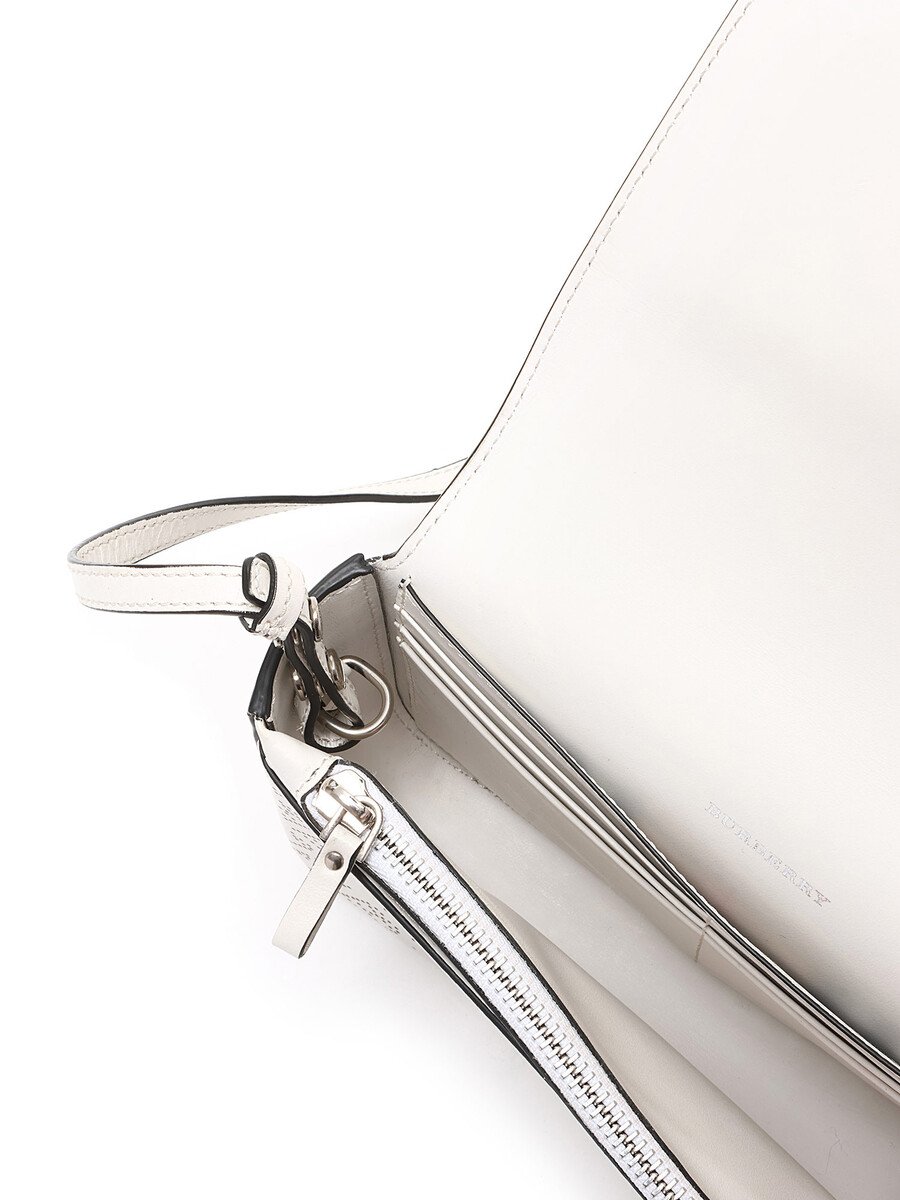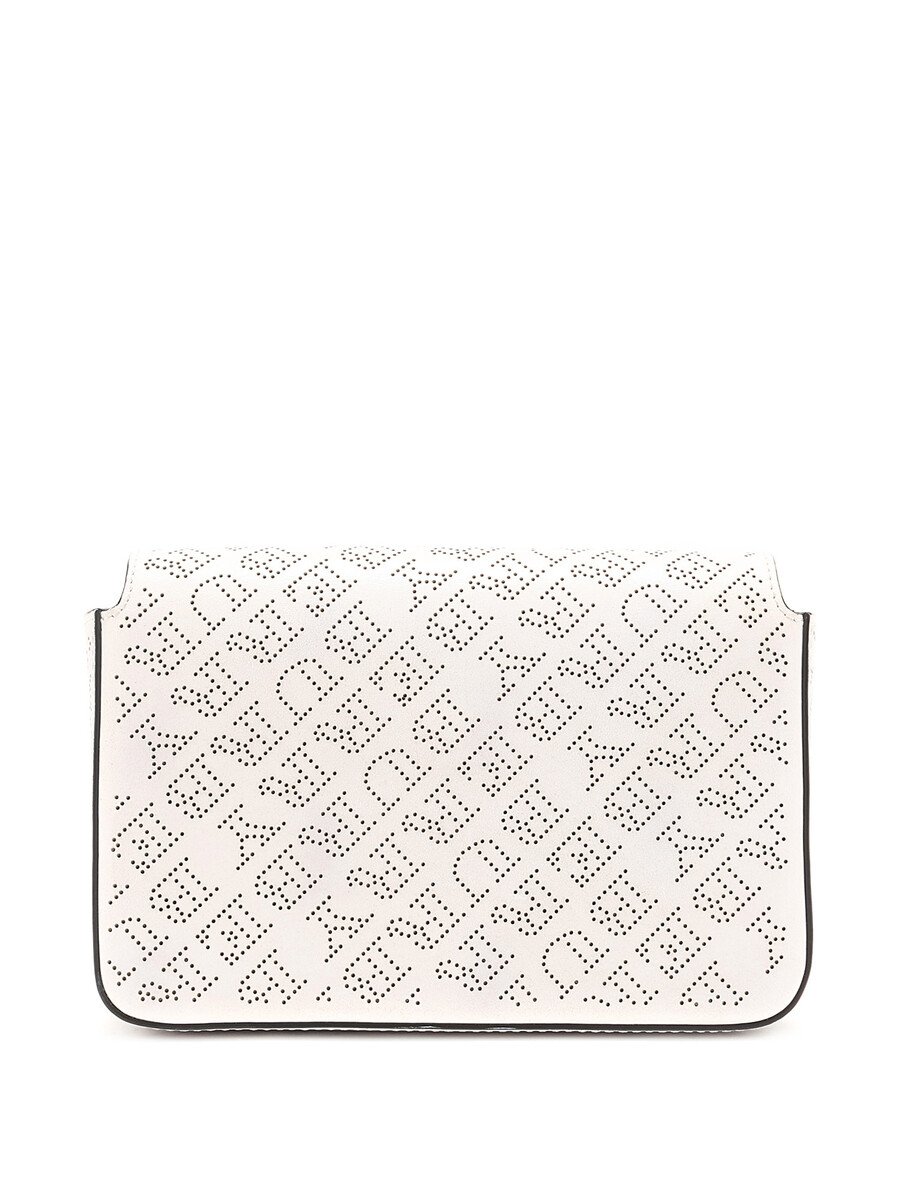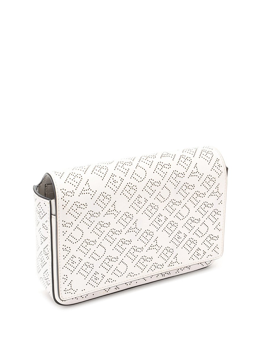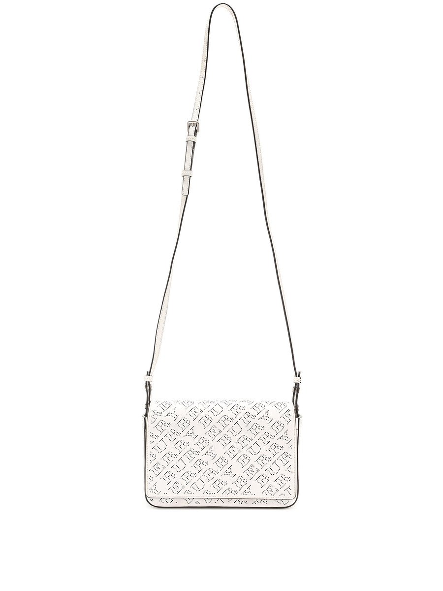 White perforated monogram leather crossbody bag with embossed logo. Magnetic closure and adjustable leather shoulder strap. Silver-tone hardware.