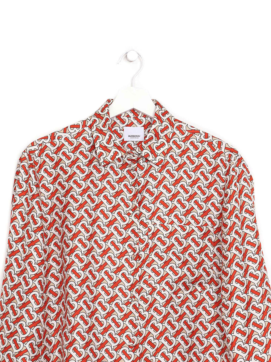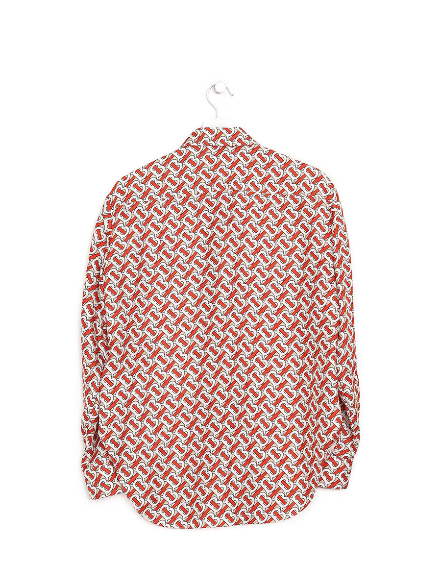 Silk shirt featuring an all-over orange and white monogram pattern. Classic collar with button closure.