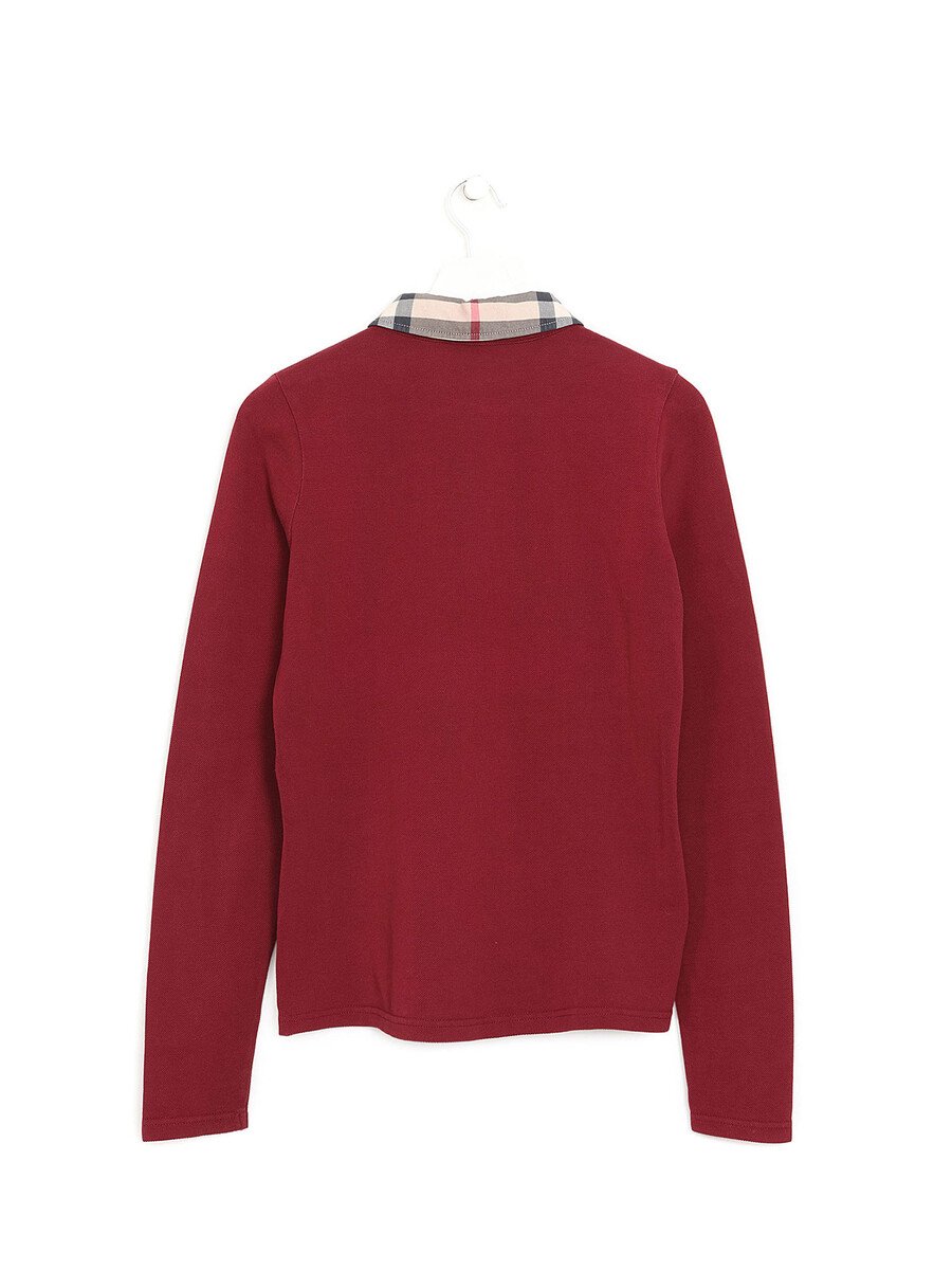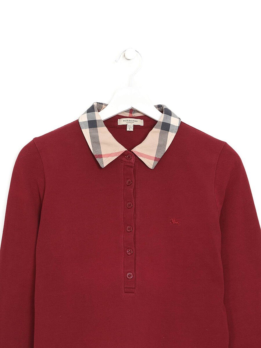 Long sleeve cotton polo shirt with plaid collar. Front button closure.
