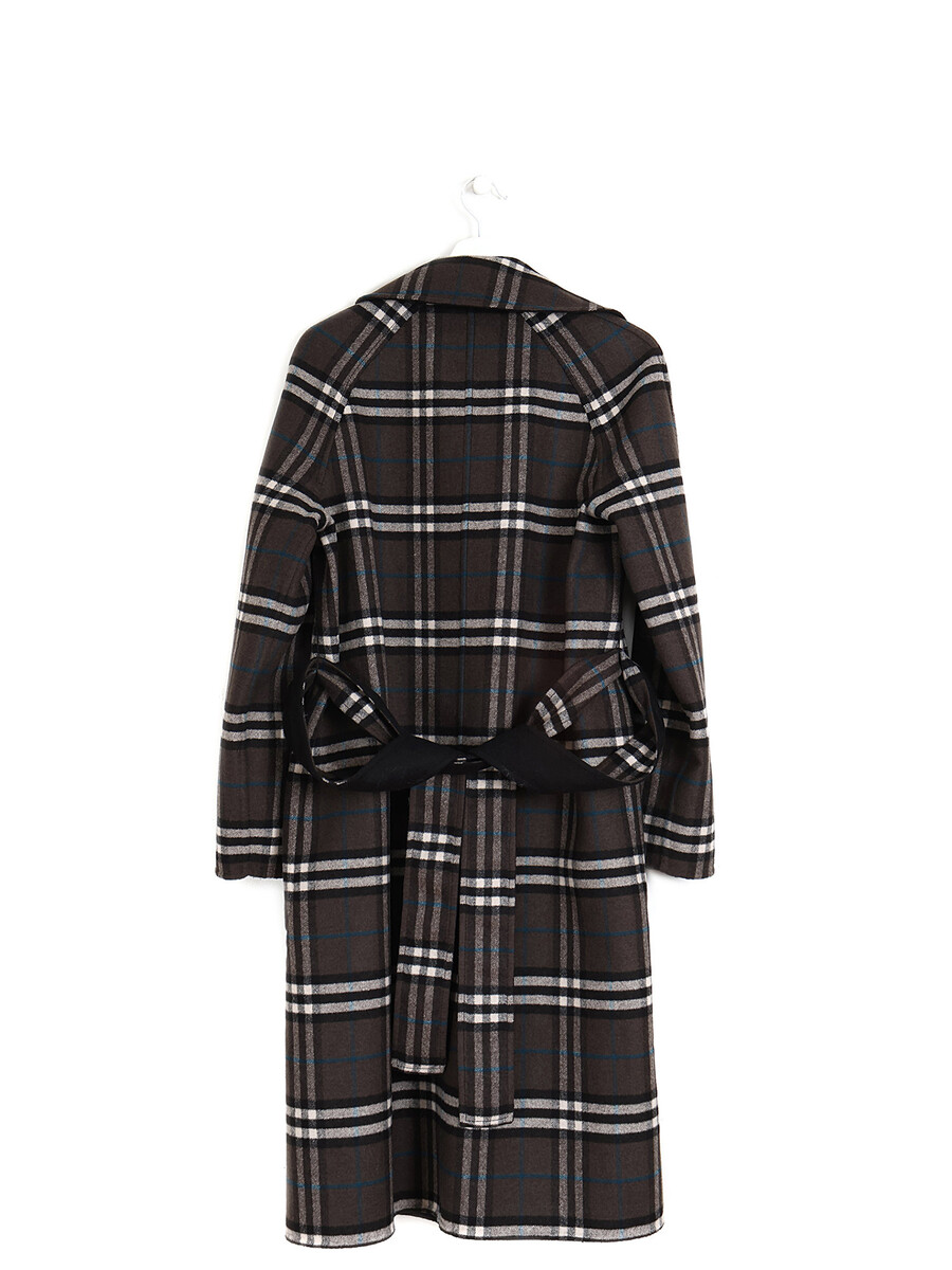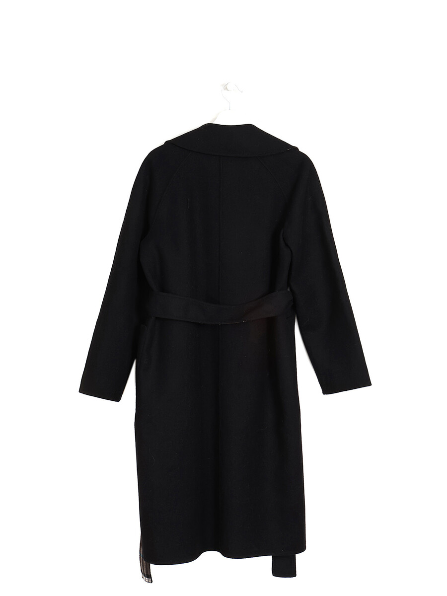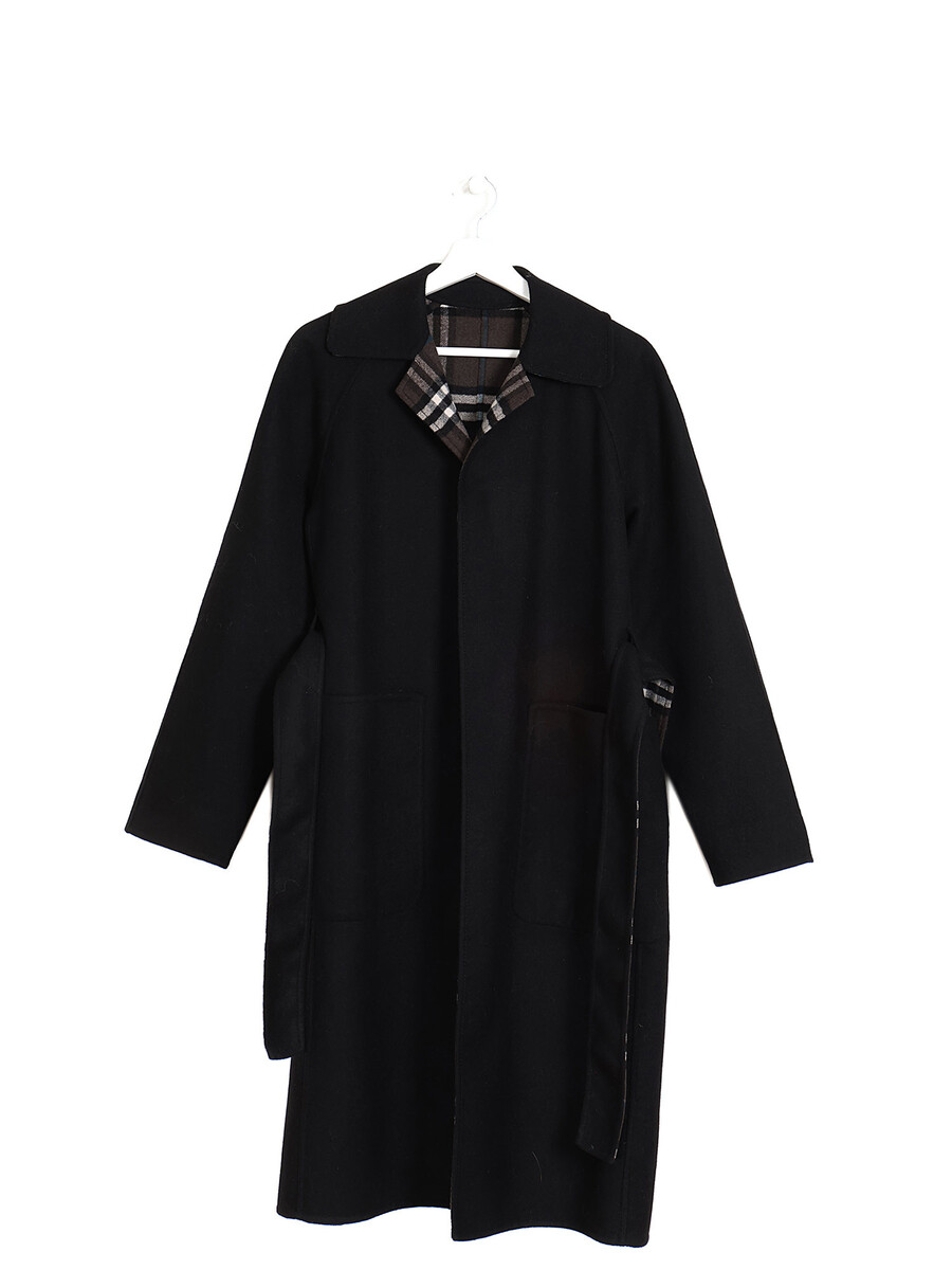 Open long wool coat in midnight blue. Classic collar. Self-tie belt at waist with belt loops. Patch pockets at face.