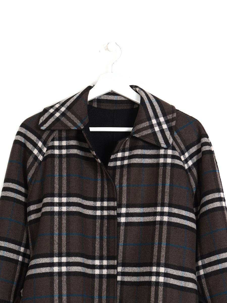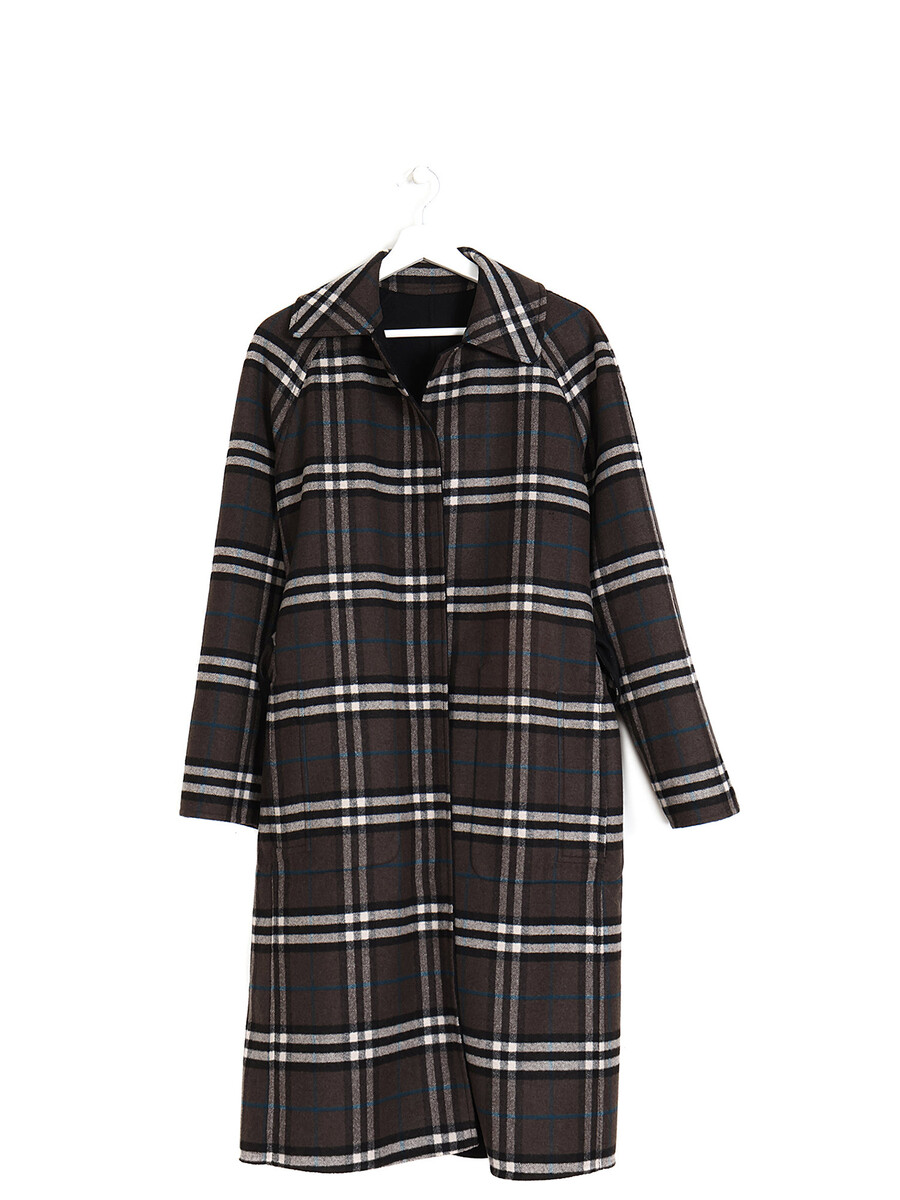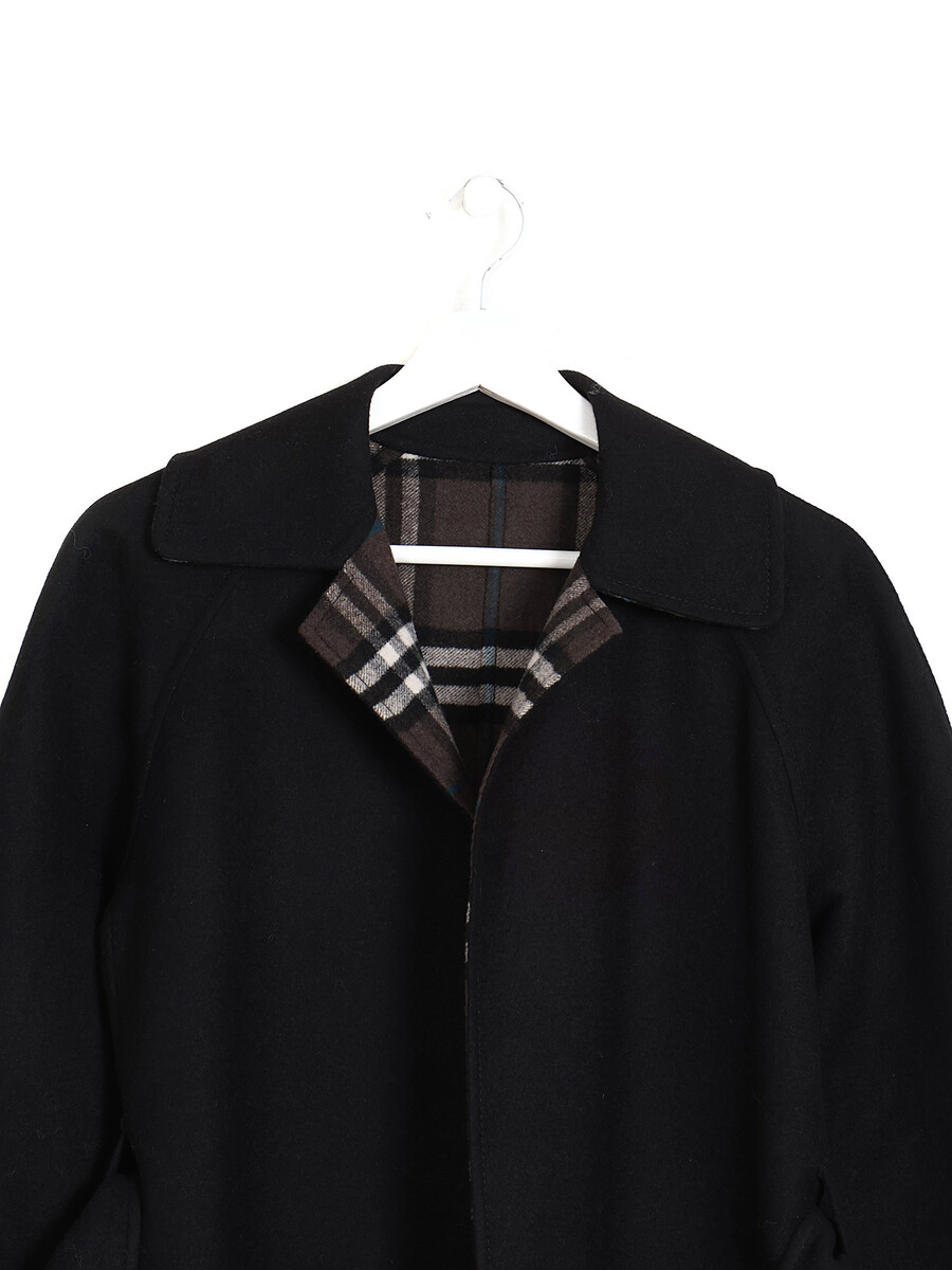 Open long wool coat in midnight blue. Classic collar. Self-tie belt at waist with belt loops. Patch pockets at face.