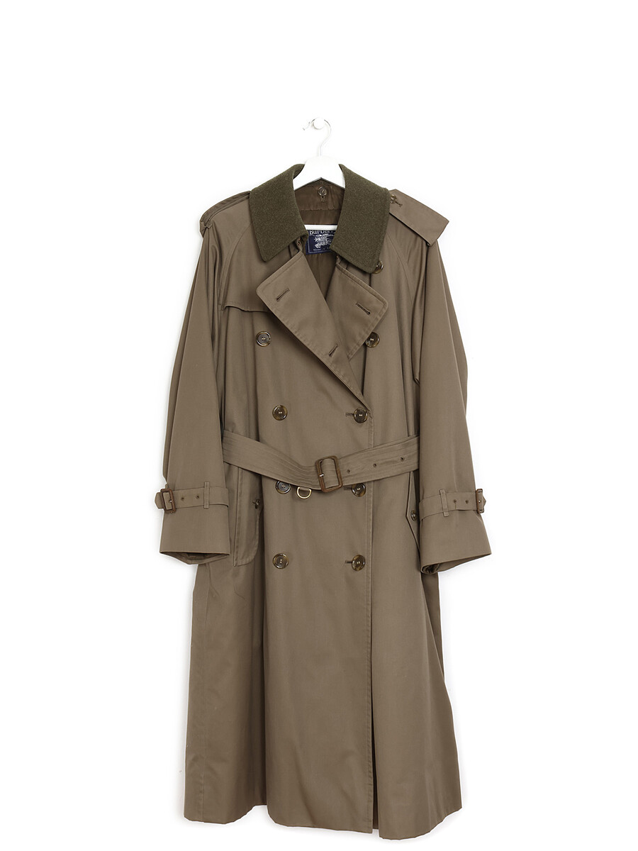 Long sleeve trench coat in khaki. Button closure at front with matching buttons. Wool lining. Two front pockets. Waist belt.