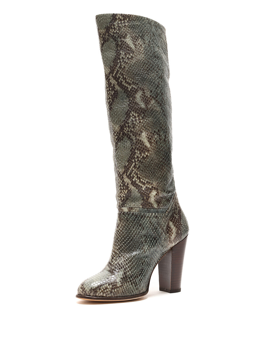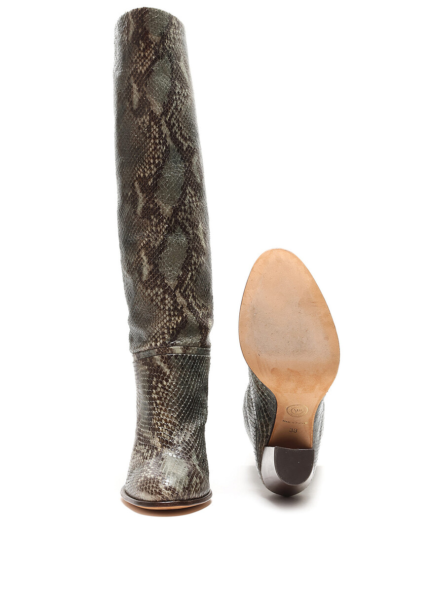 Reptile-textured knee-high leather boots in beige and blue tones. Round toe. Wooden block heel. Leather sole.