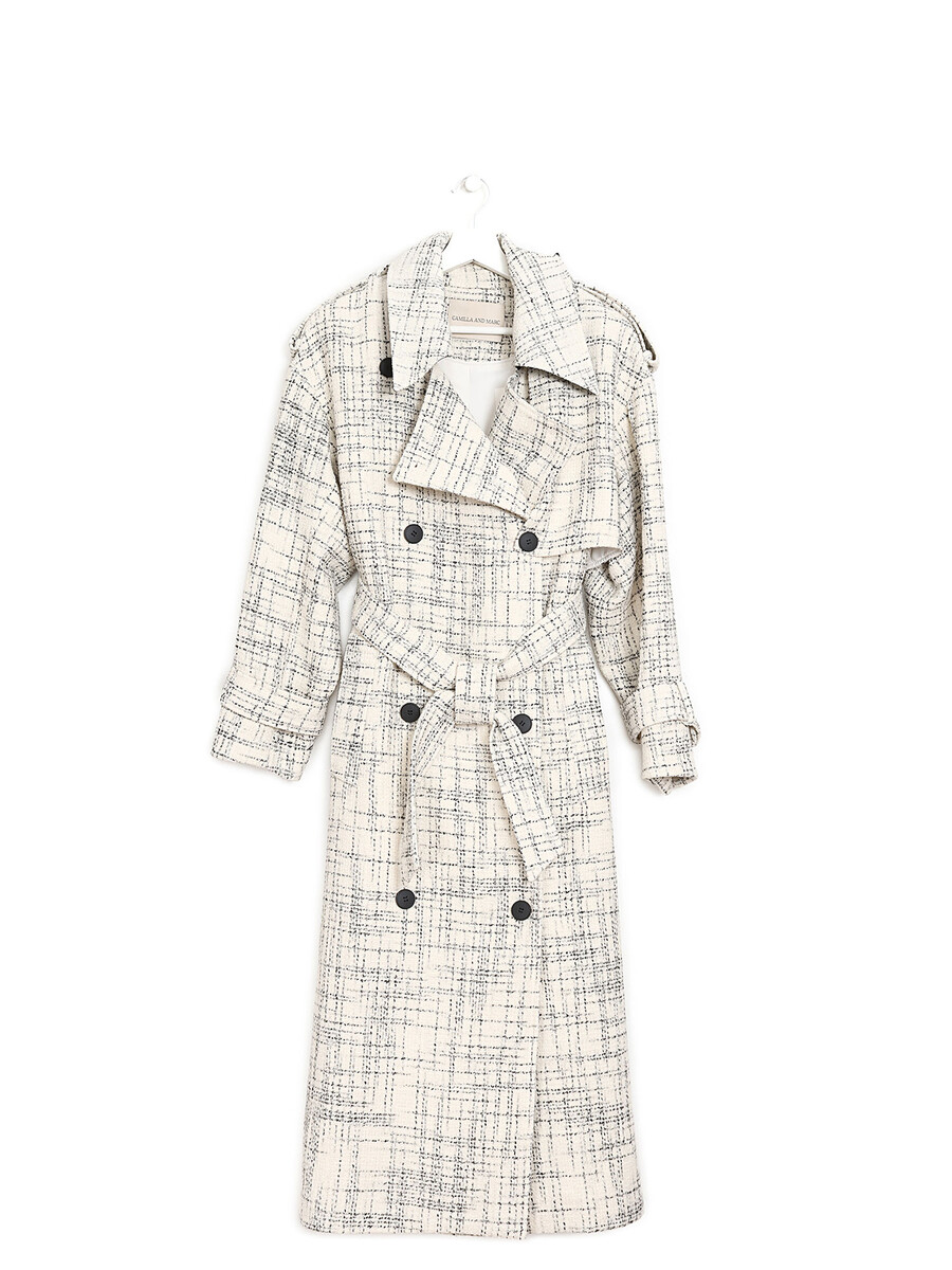 Plaid trench coat in cream with a belted waist and large collar. Button front closure. 82% Cotton, 10% Polyester, 8% Acrylic