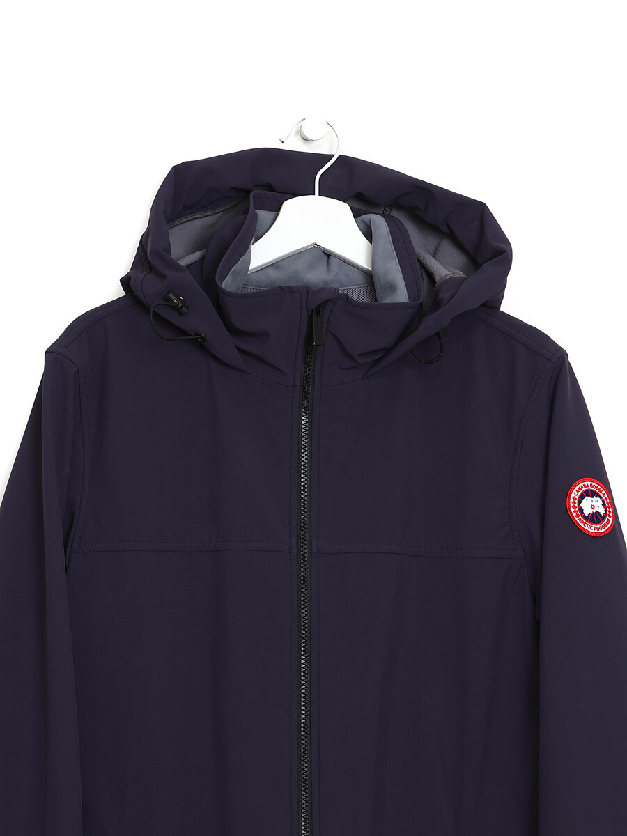 Lightweight jacket with a sleek silhouette in navy. Features a high collar, tonal zip closure, and subtle logo on the sleeve.