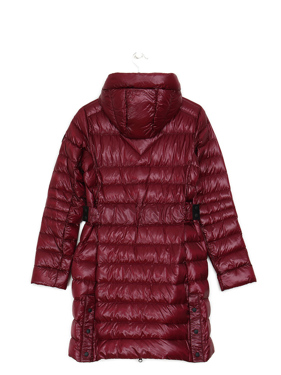 Mid-length padded packable jacket in burgundy. Zipper front closure. Black logo patch at sleeve. Two front pockets. Back slit.