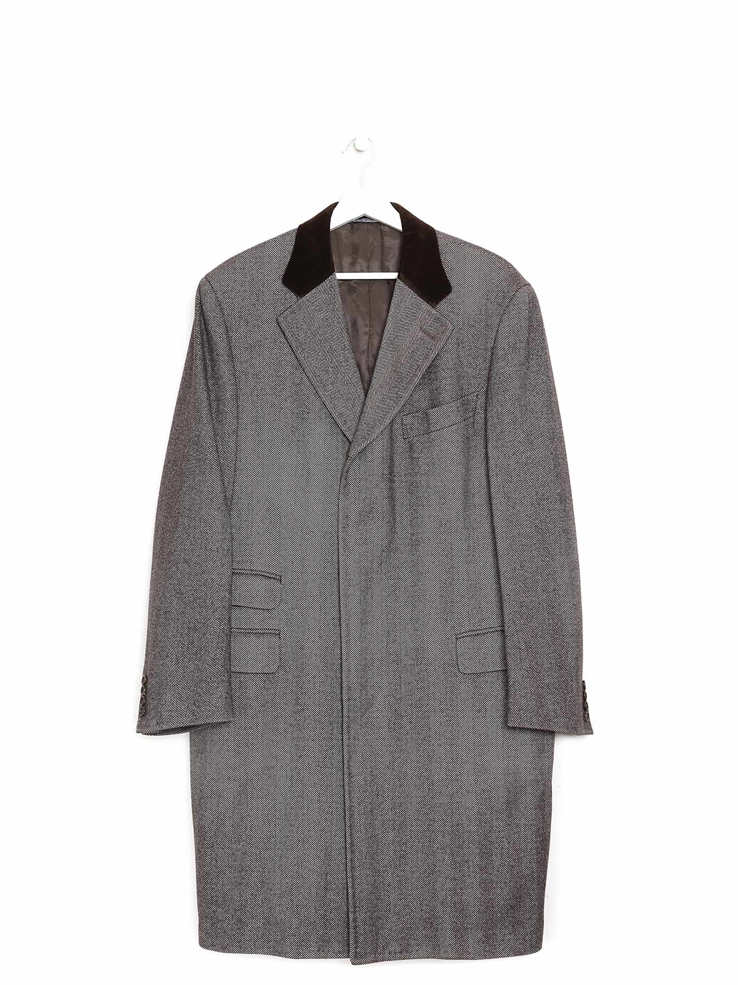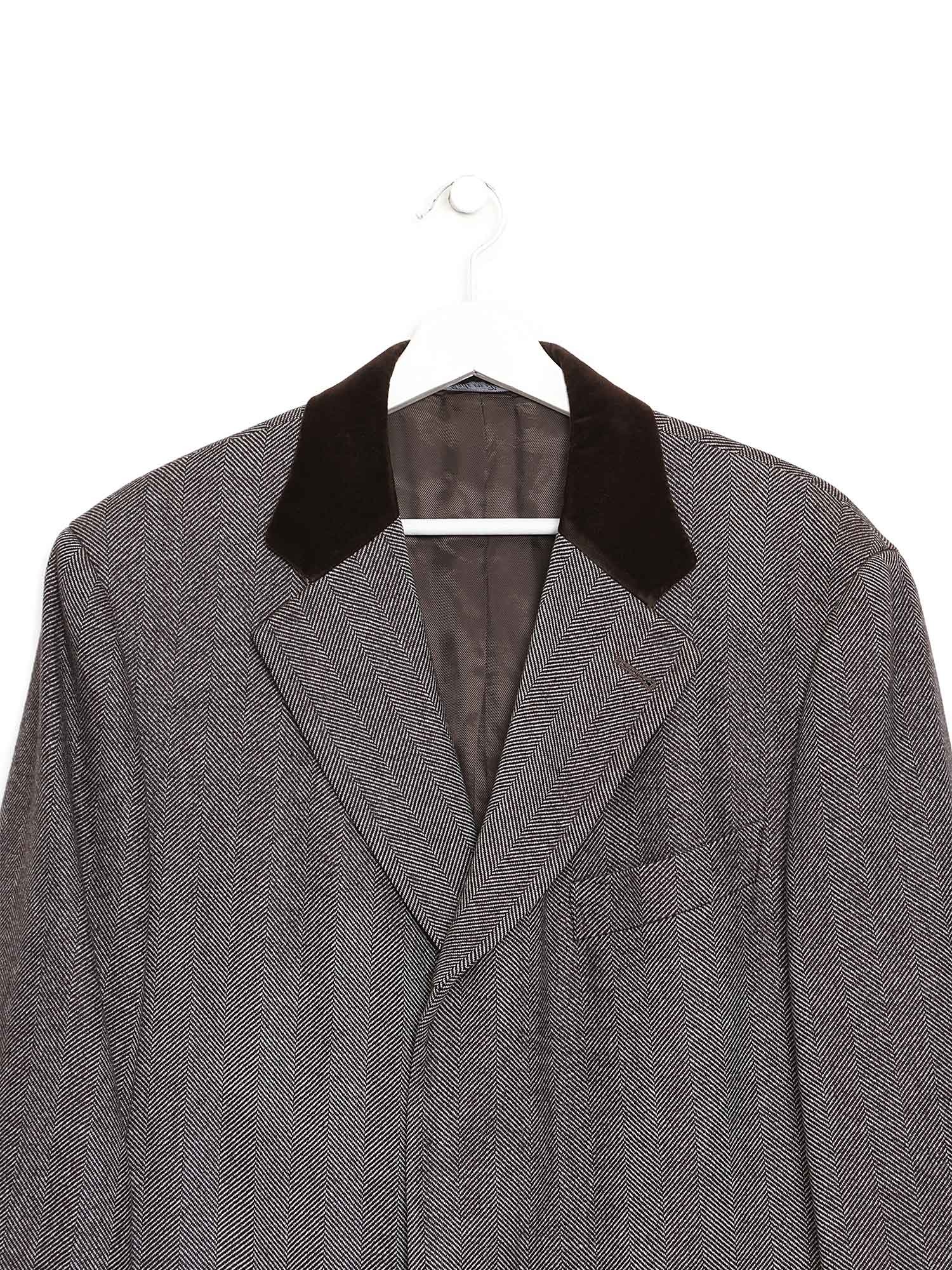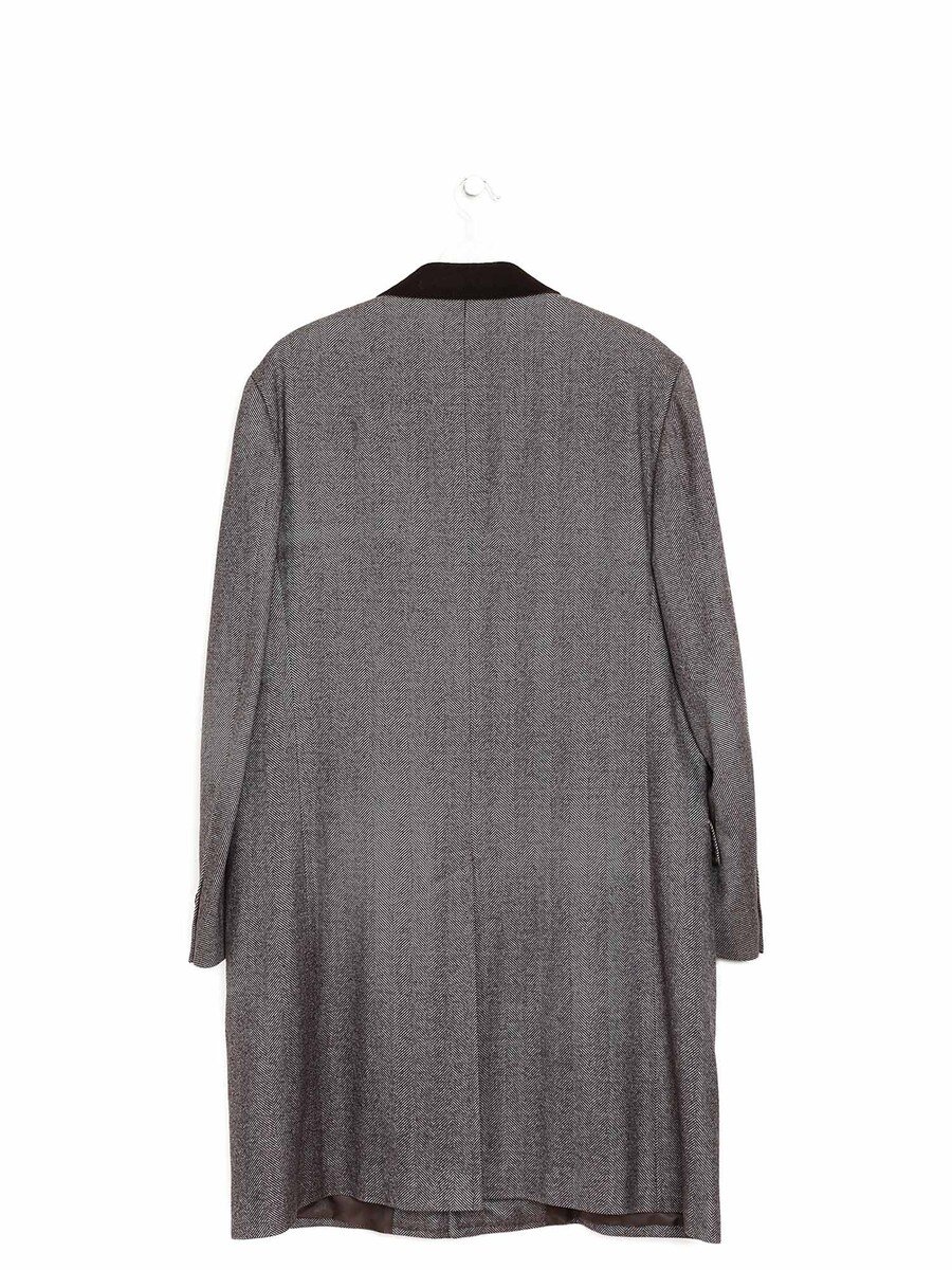 Long sleeve coat in plaid and check pattern. Features a button front closure and notched lapel collar. Flap pockets at the front.