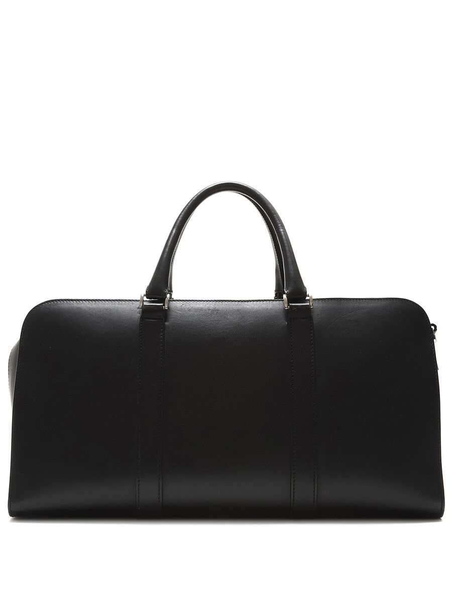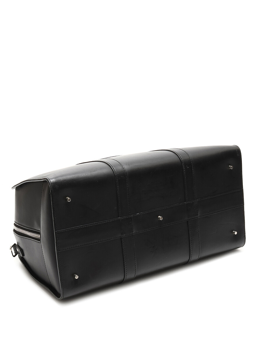 Structured leather duffle bag in black with contrast orange lining. Features zipper closure, dual leather handles, and silver-tone hardware. Protective metal feet at the bottom.