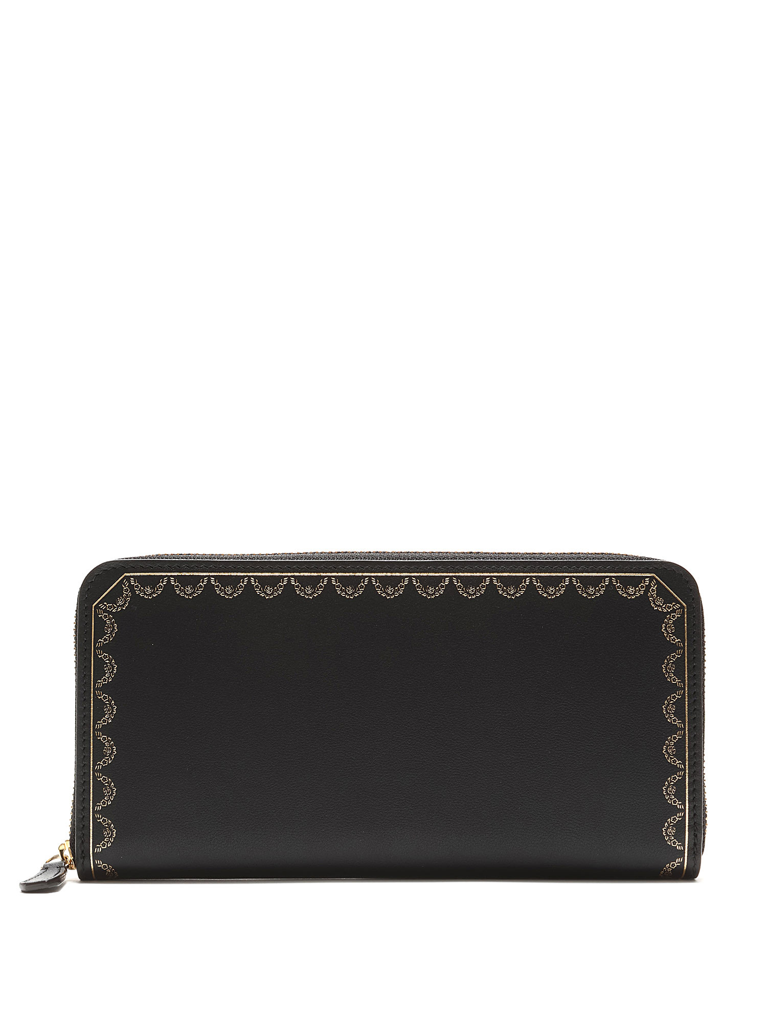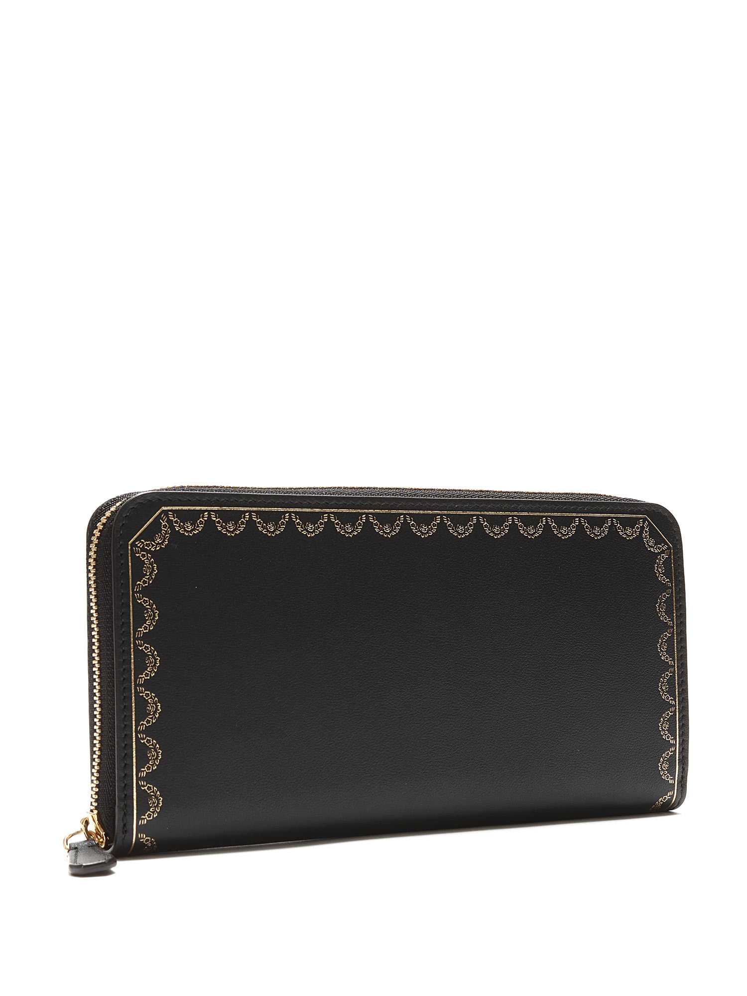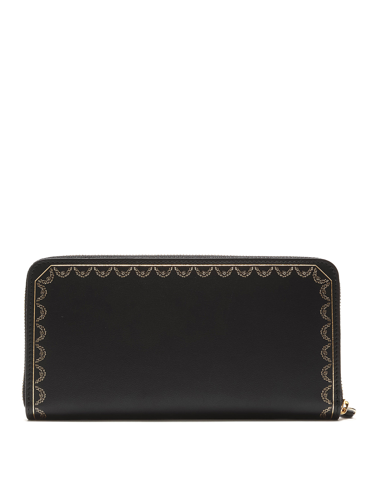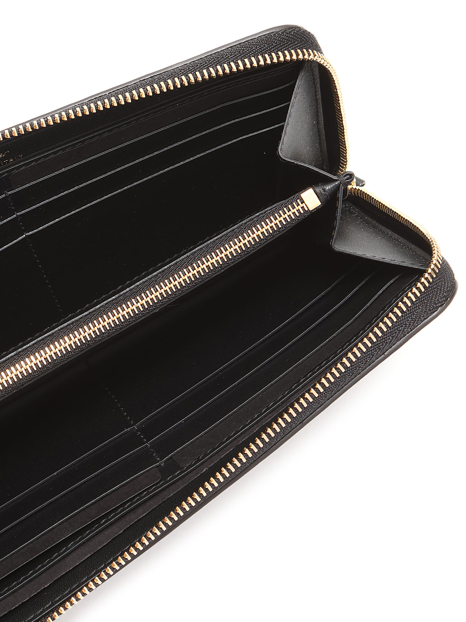 Black leather continental wallet featuring a gold scallop motif. Gold-tone zipper closure with logo. Interior includes multiple card slots, bill compartments, and a zippered coin pocket.