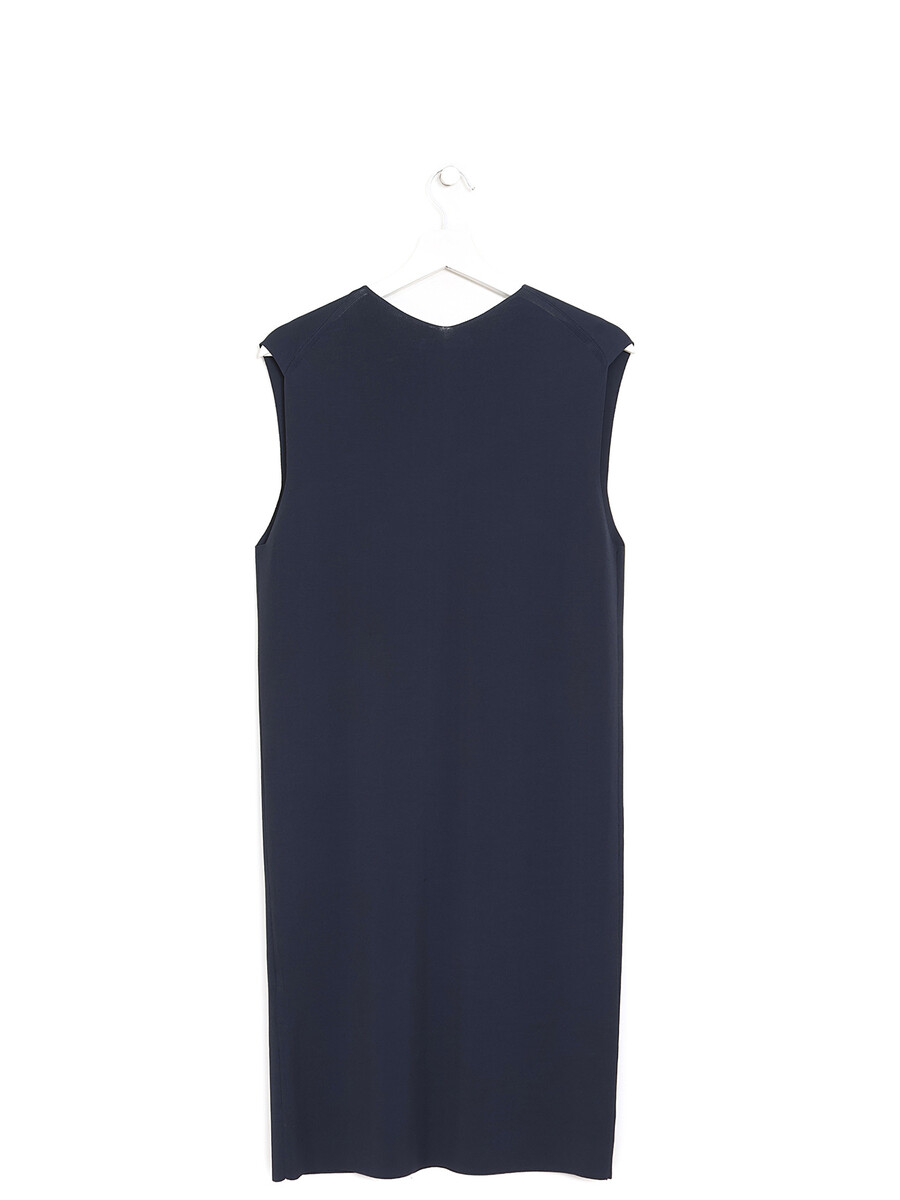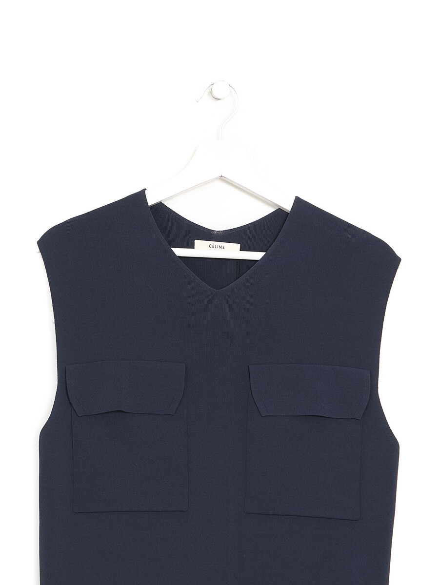 Sleeveless navy dress with dual pocket detailing. Round neckline.