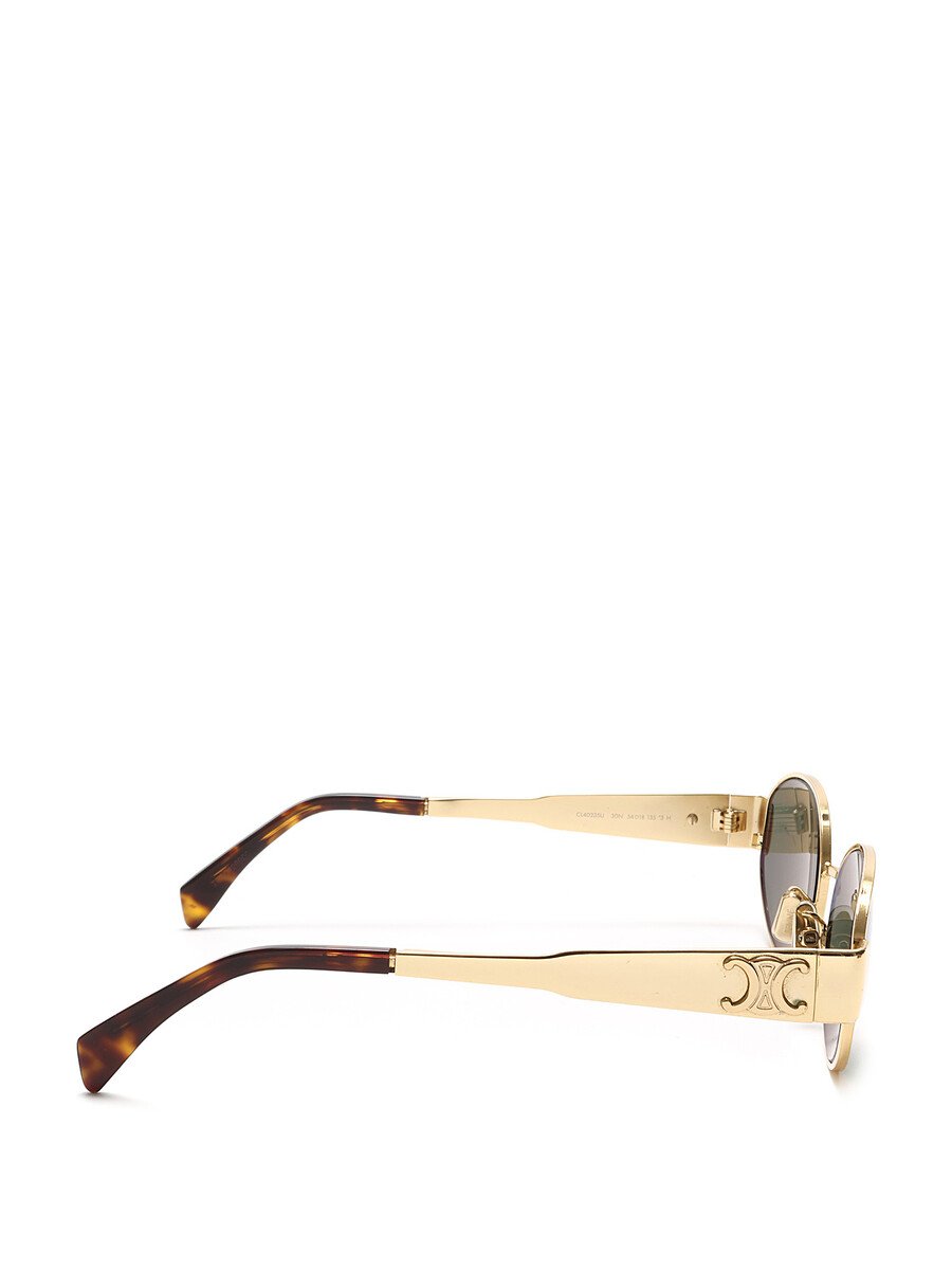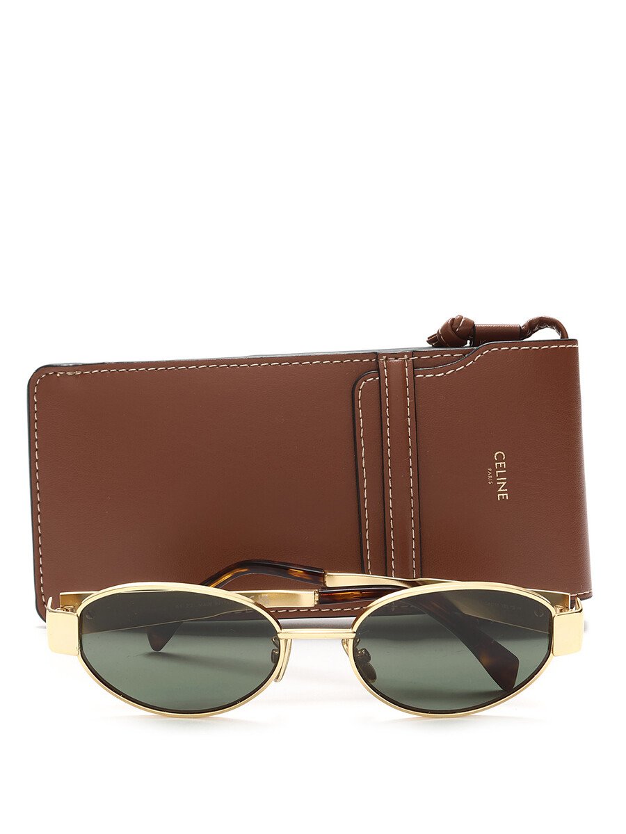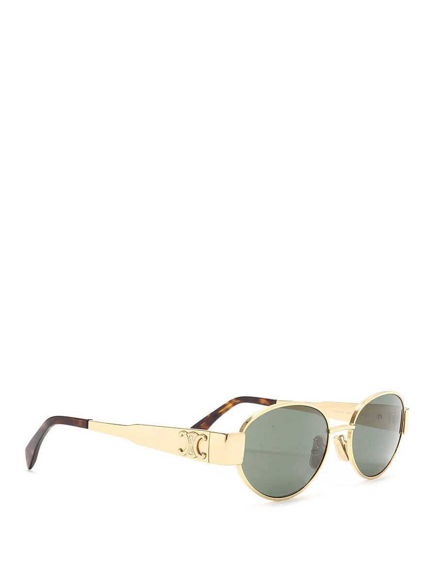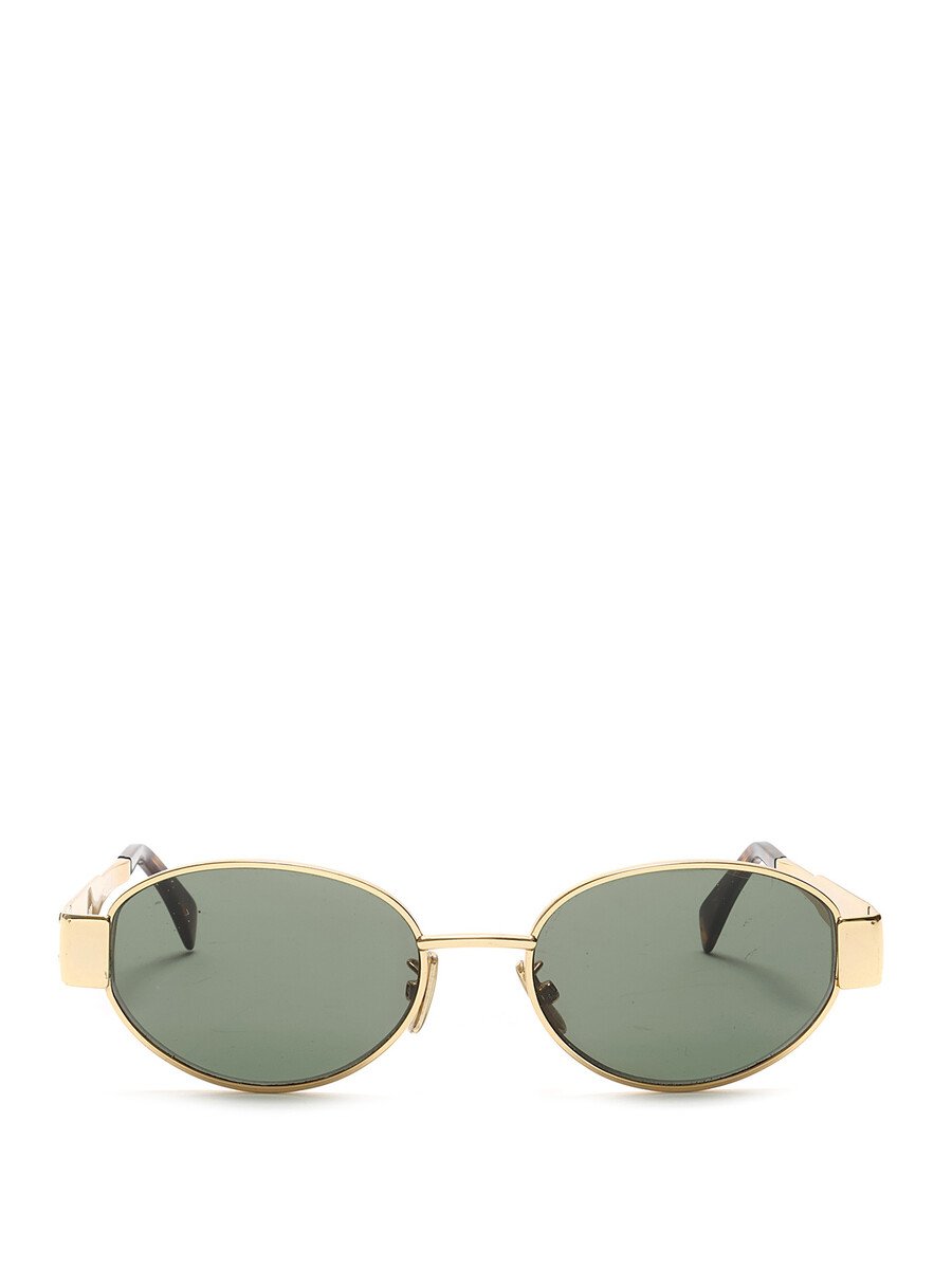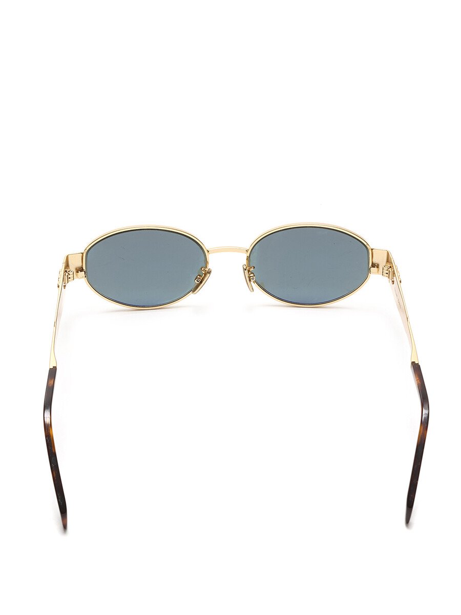 Gold frame oval sunglasses with grey lenses. Gold-tone metal, featuring engraved logo on temples. Includes dustbag.