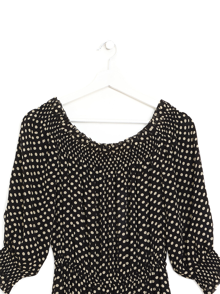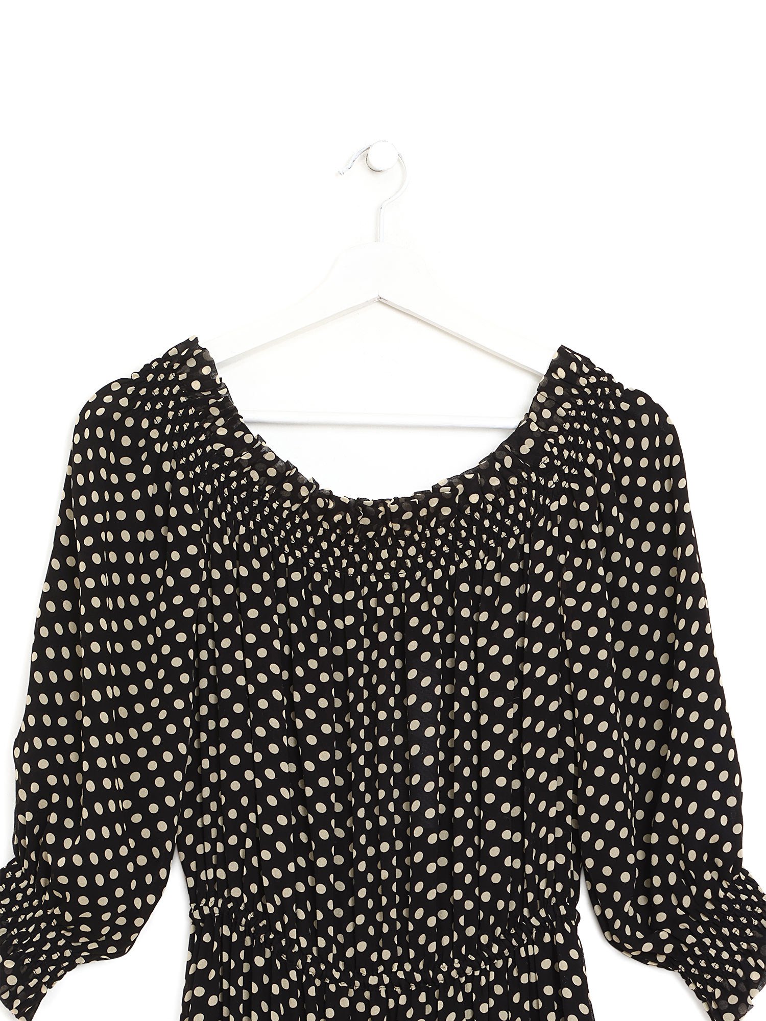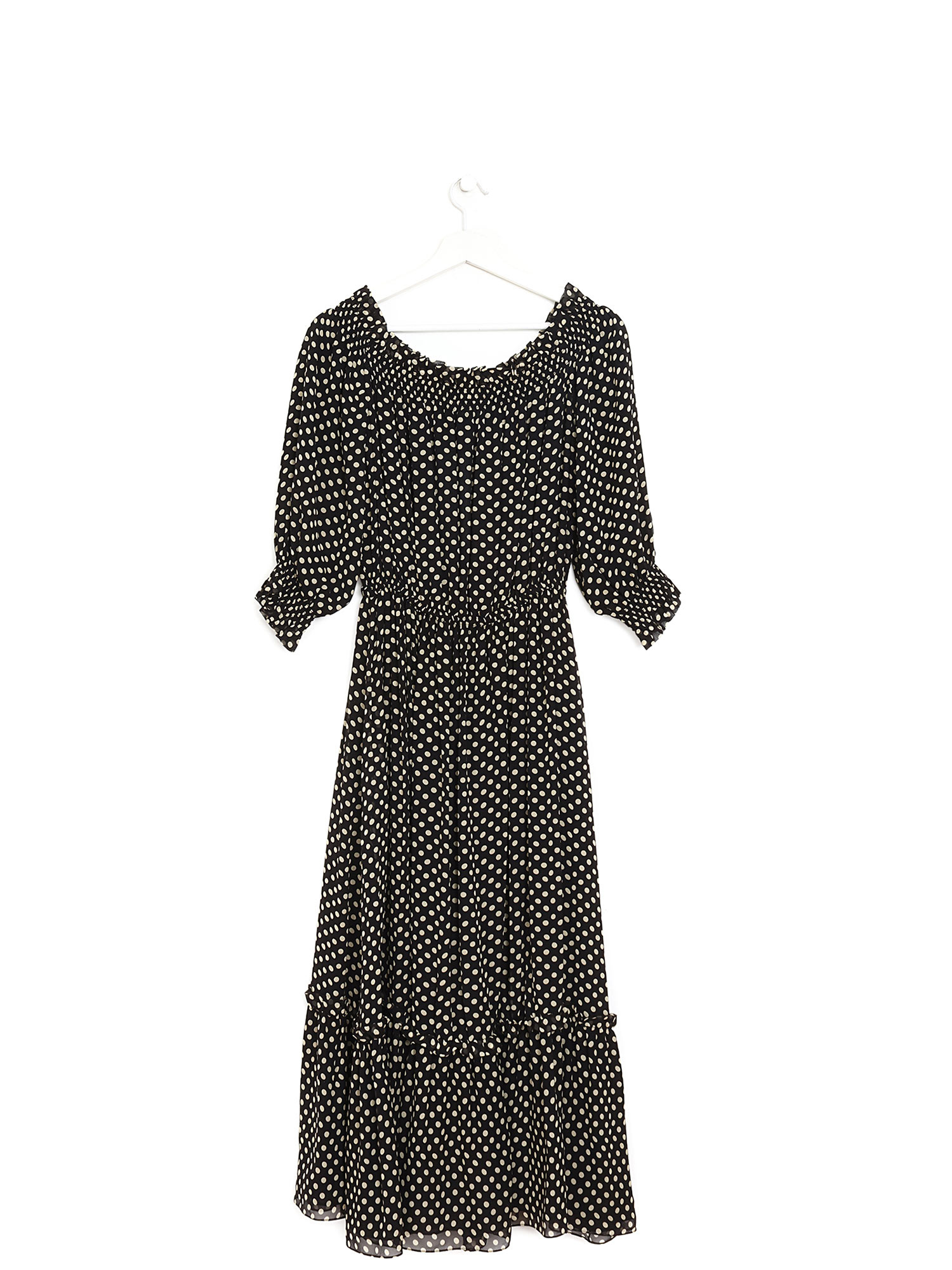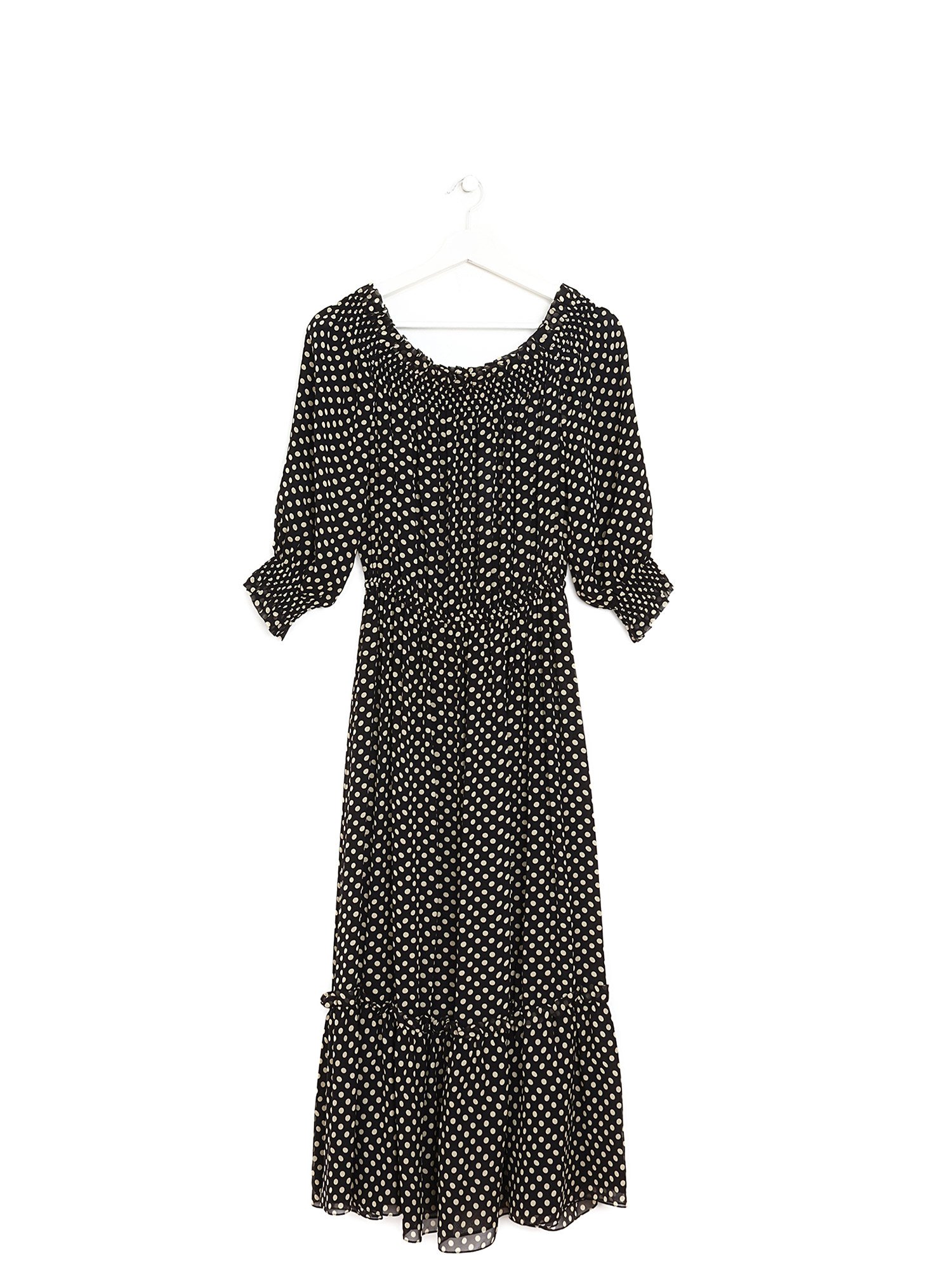 Silk off-the-shoulder maxi dress featuring a polka dot pattern in black and white. Flowy silhouette with an elegant drape.