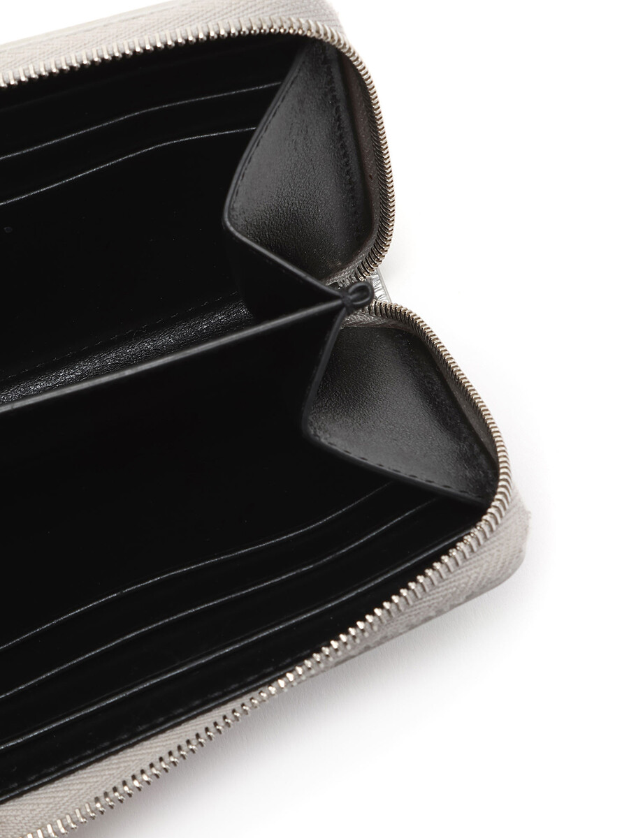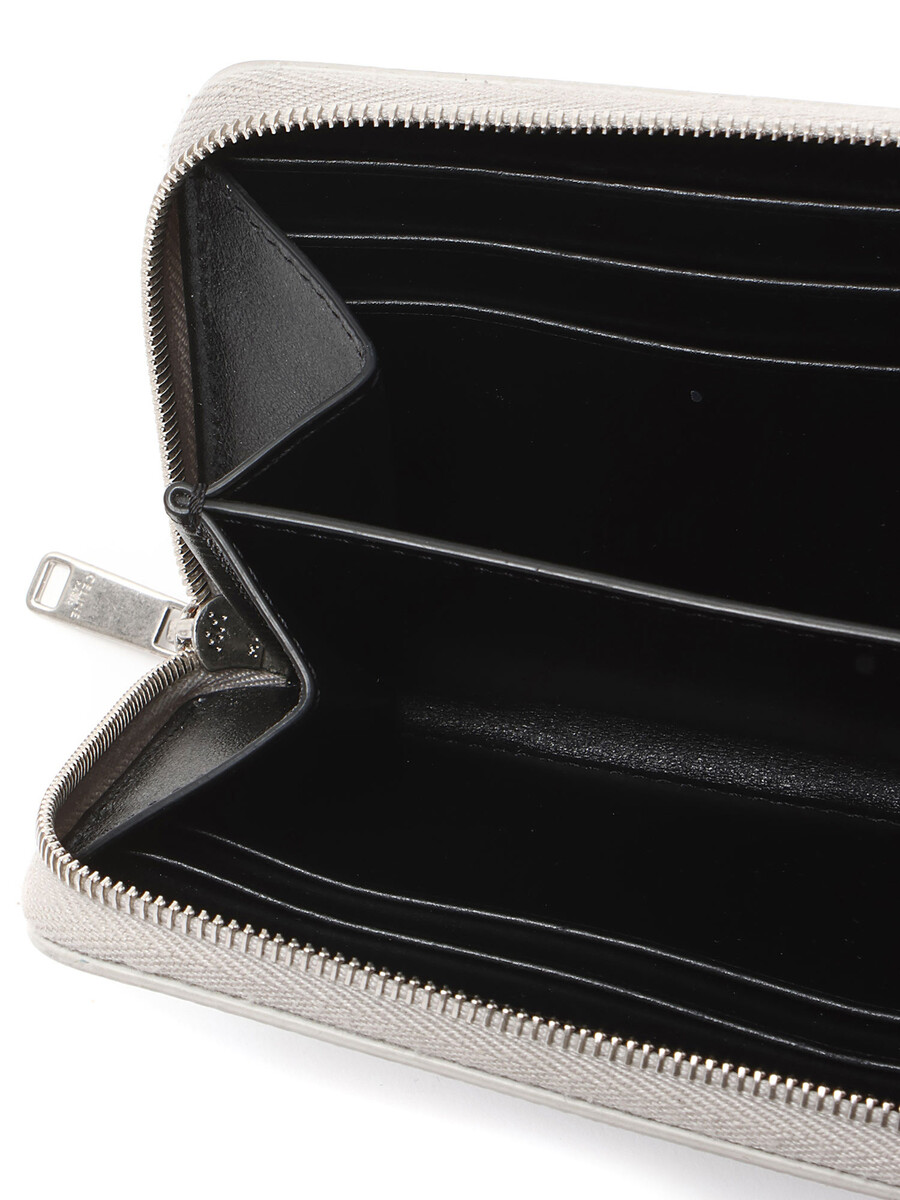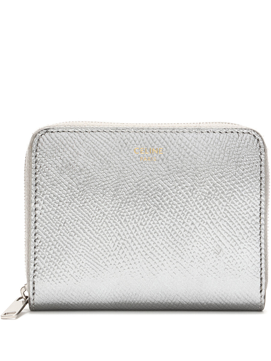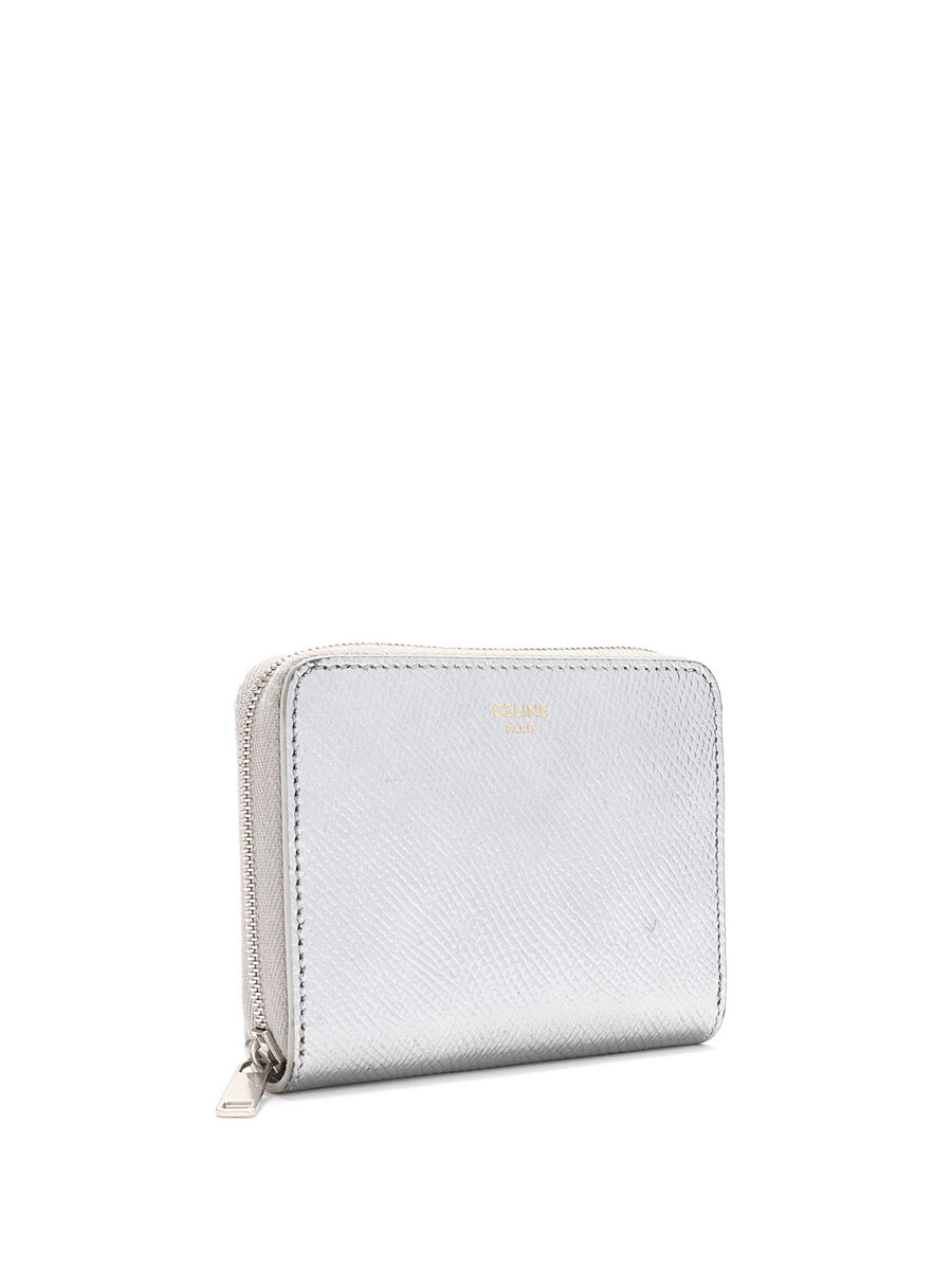 Compact zip-around wallet in grained leather with a textured finish in metallic silver. Zip-around closure. Silver-tone hardware.