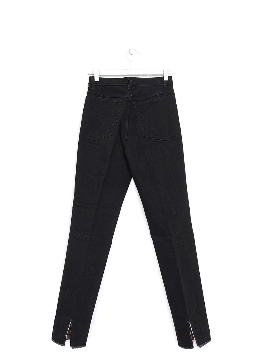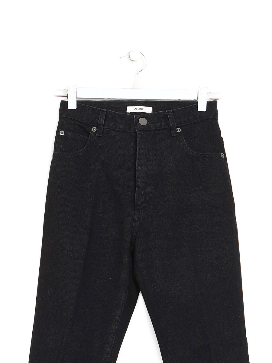 Slim leg black denim jeans with a button front closure.