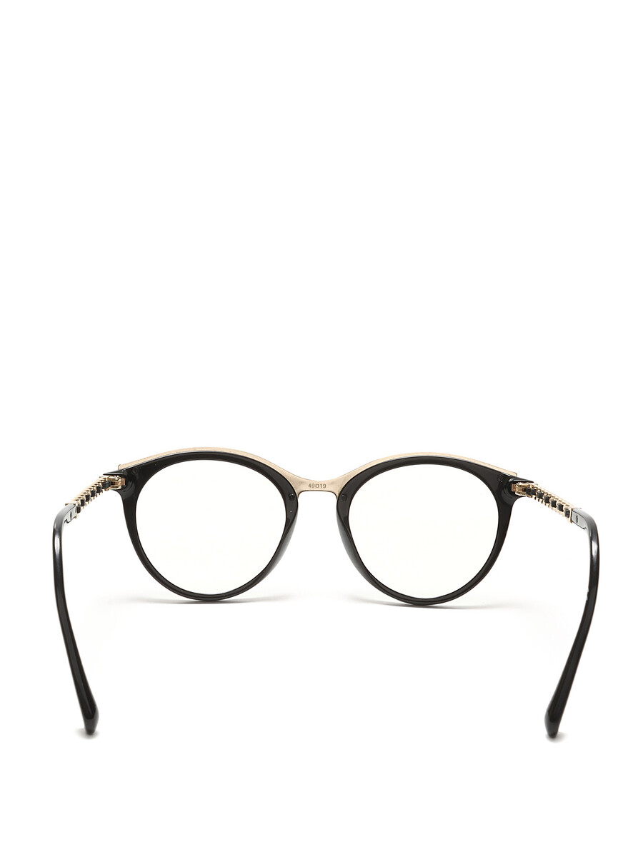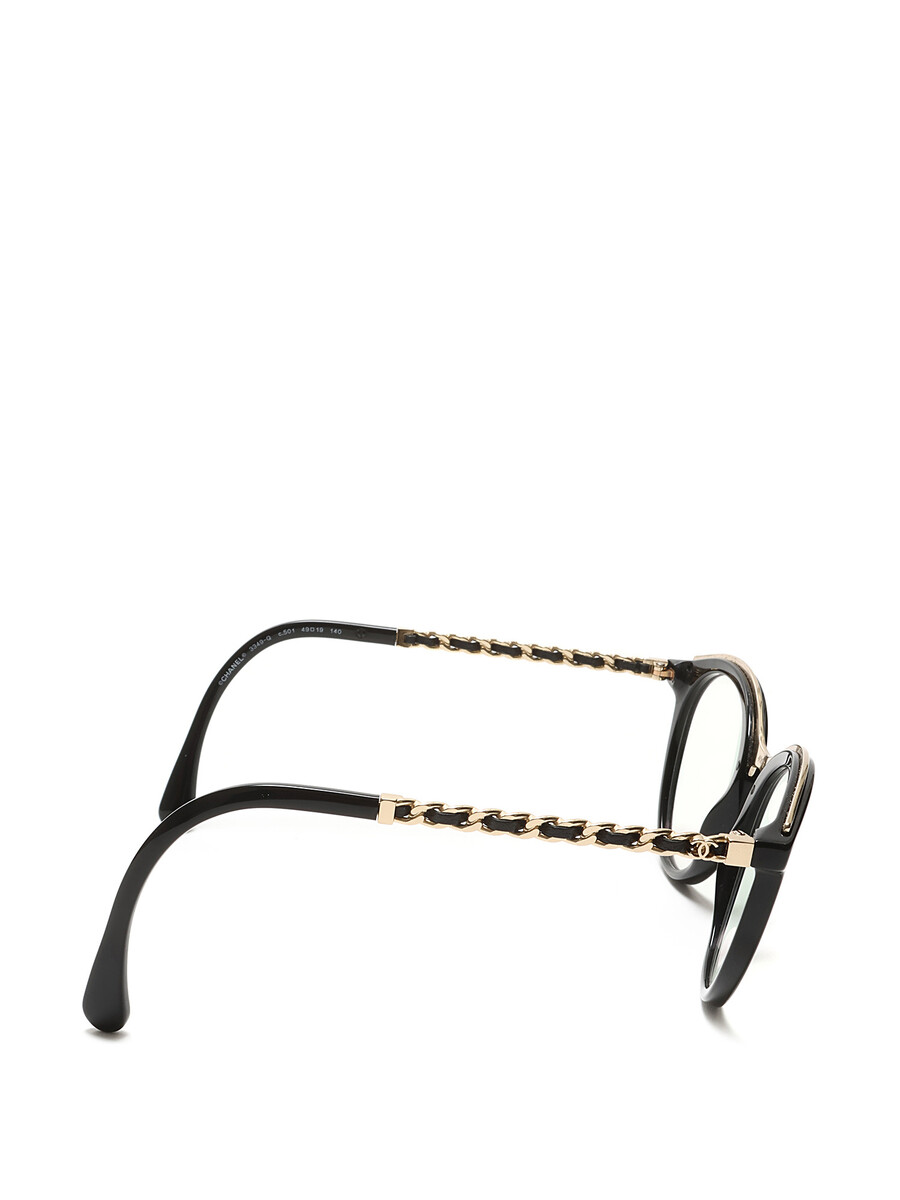 Acetate eyeglasses with braided detailing, featuring black frames and gold-tone metal accents. Classic Chanel sophistication with a modern twist.