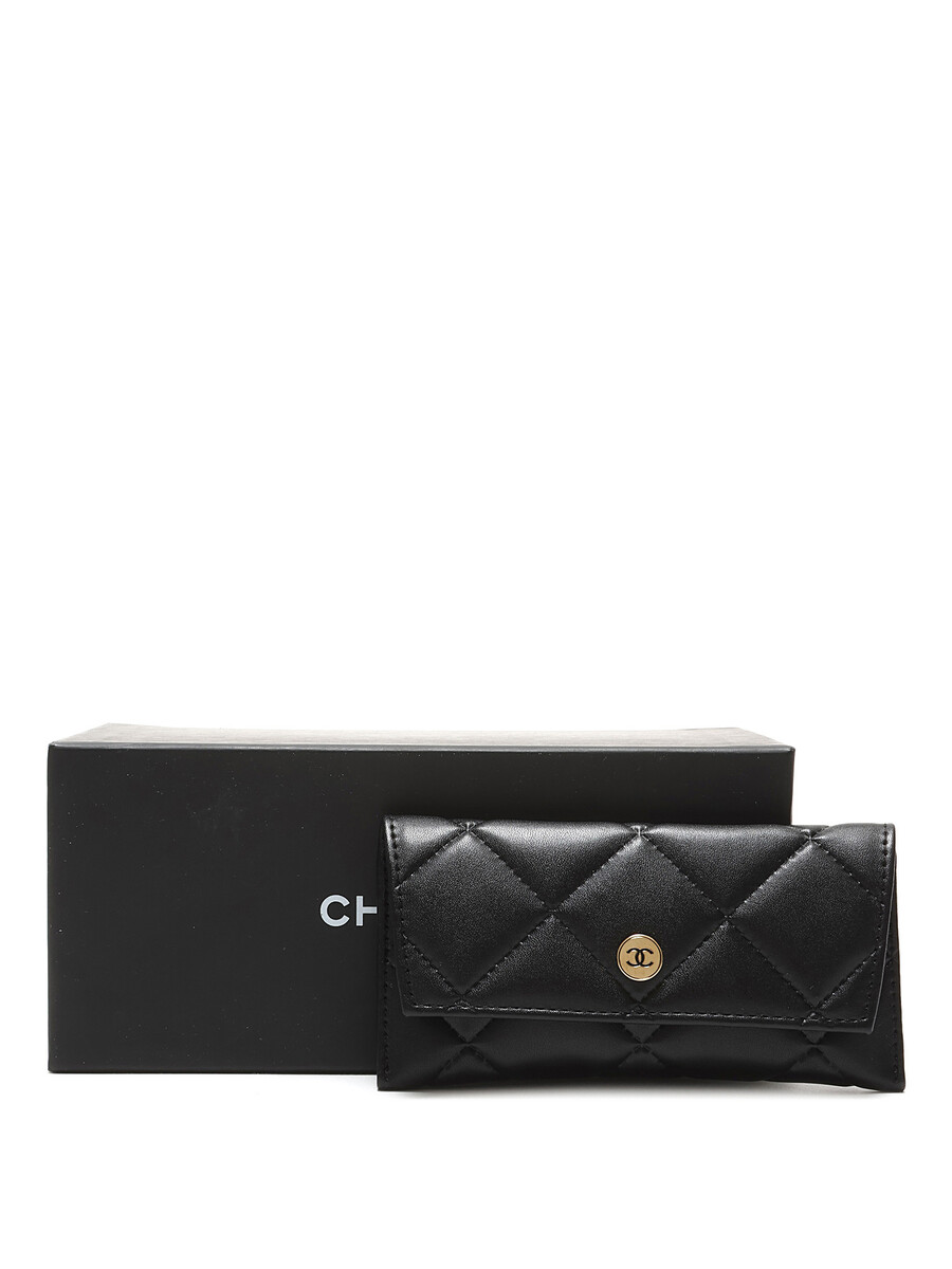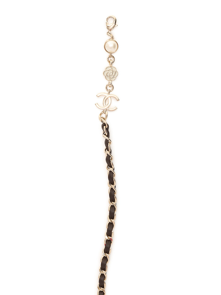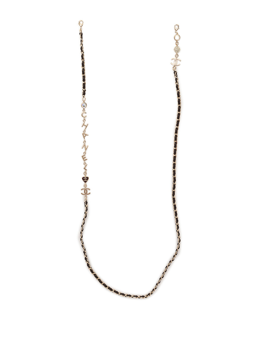 Intertwined chain strap sunglasses lanyard with logo charms. Comes with a quilted black pouch. Silver-tone hardware and snap closure. With box.