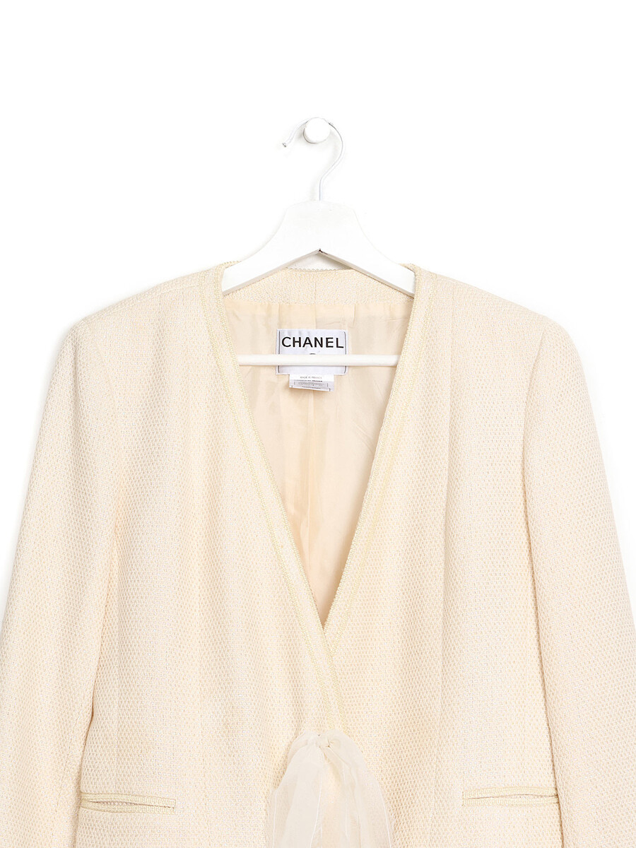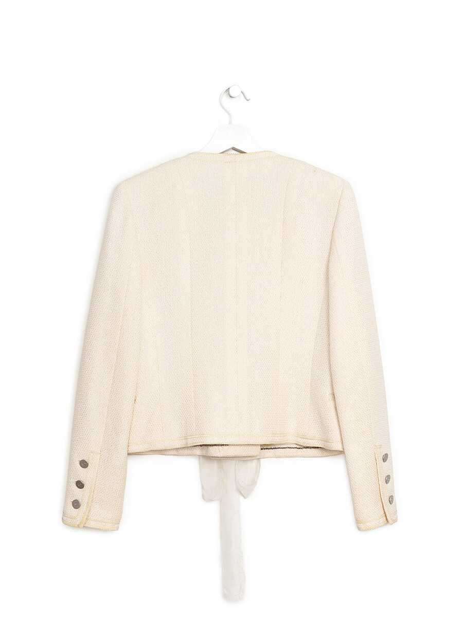 Classic long sleeve blazer in cream tweed with a V neckline and ribbon closure. Features silver metal buttons on the cuffs and two front pockets.