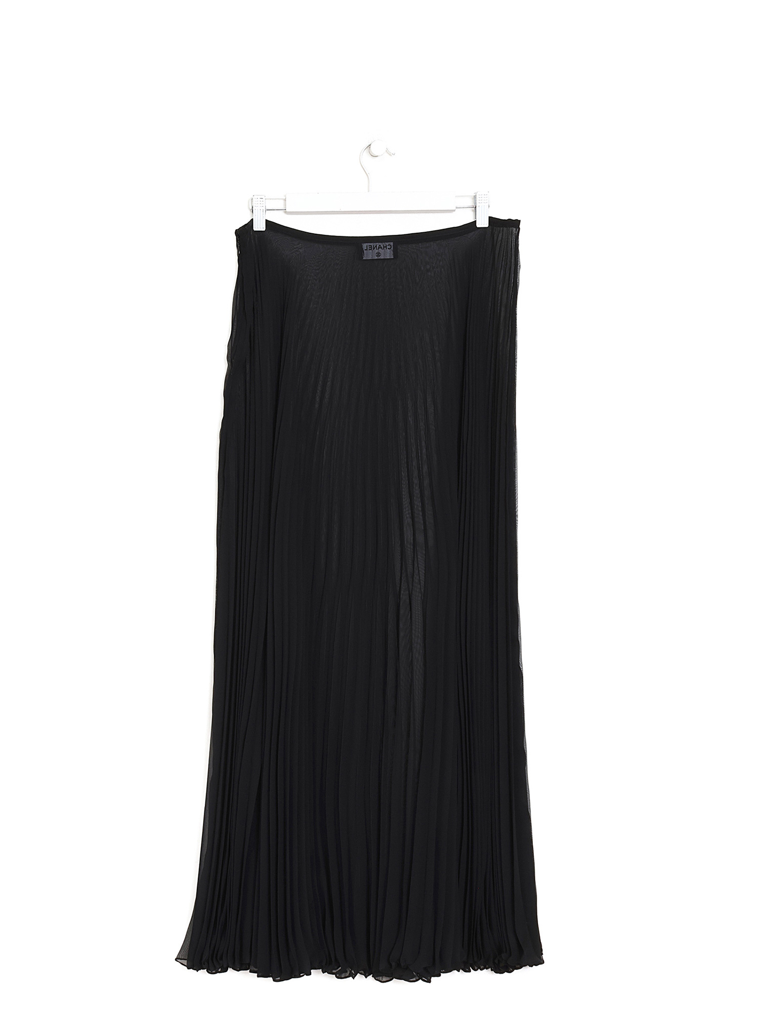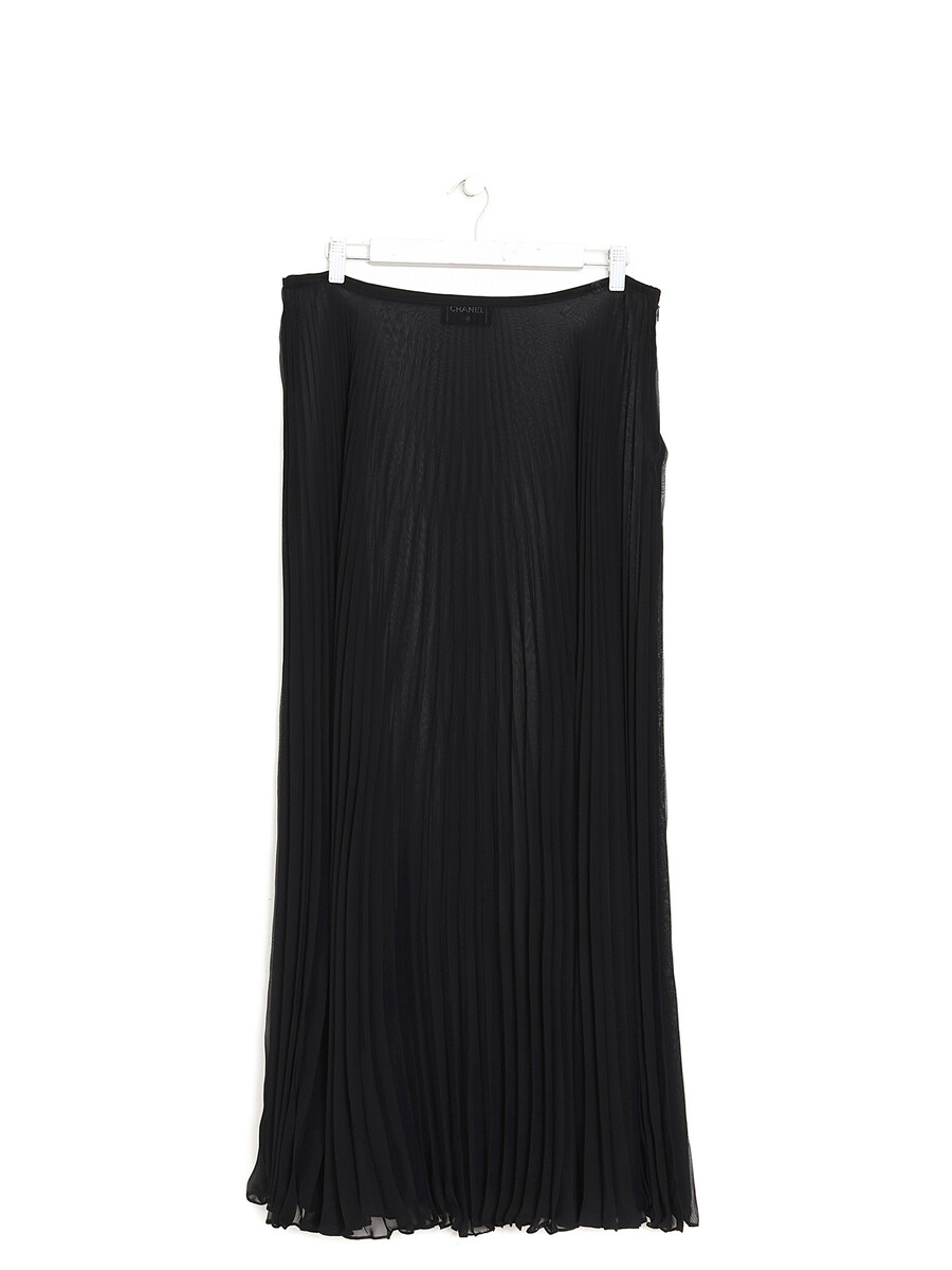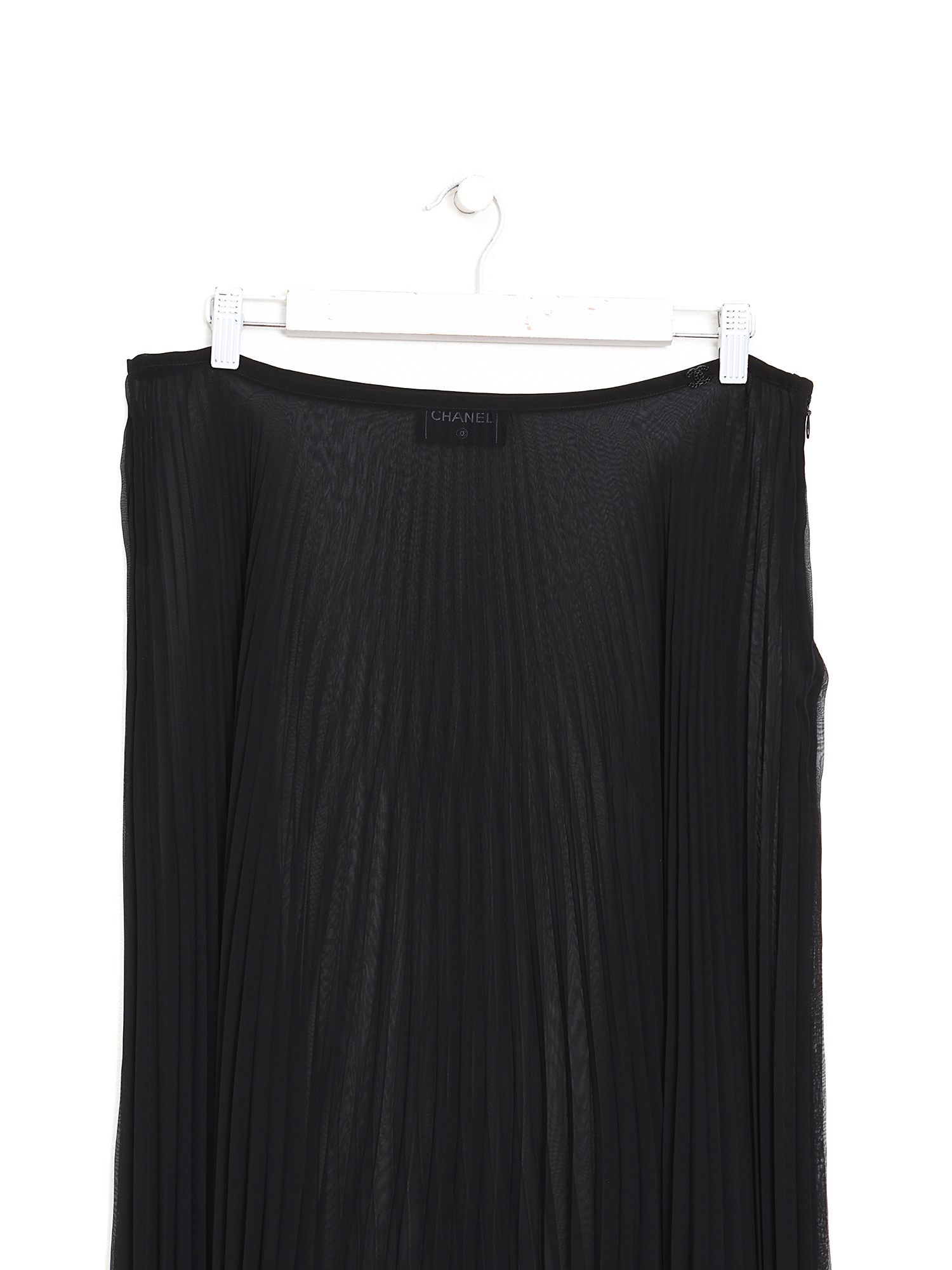 Sheer black mid-length pleated skirt featuring a double C logo rhinestone embellishment at the waist. Zipper closure at the side.