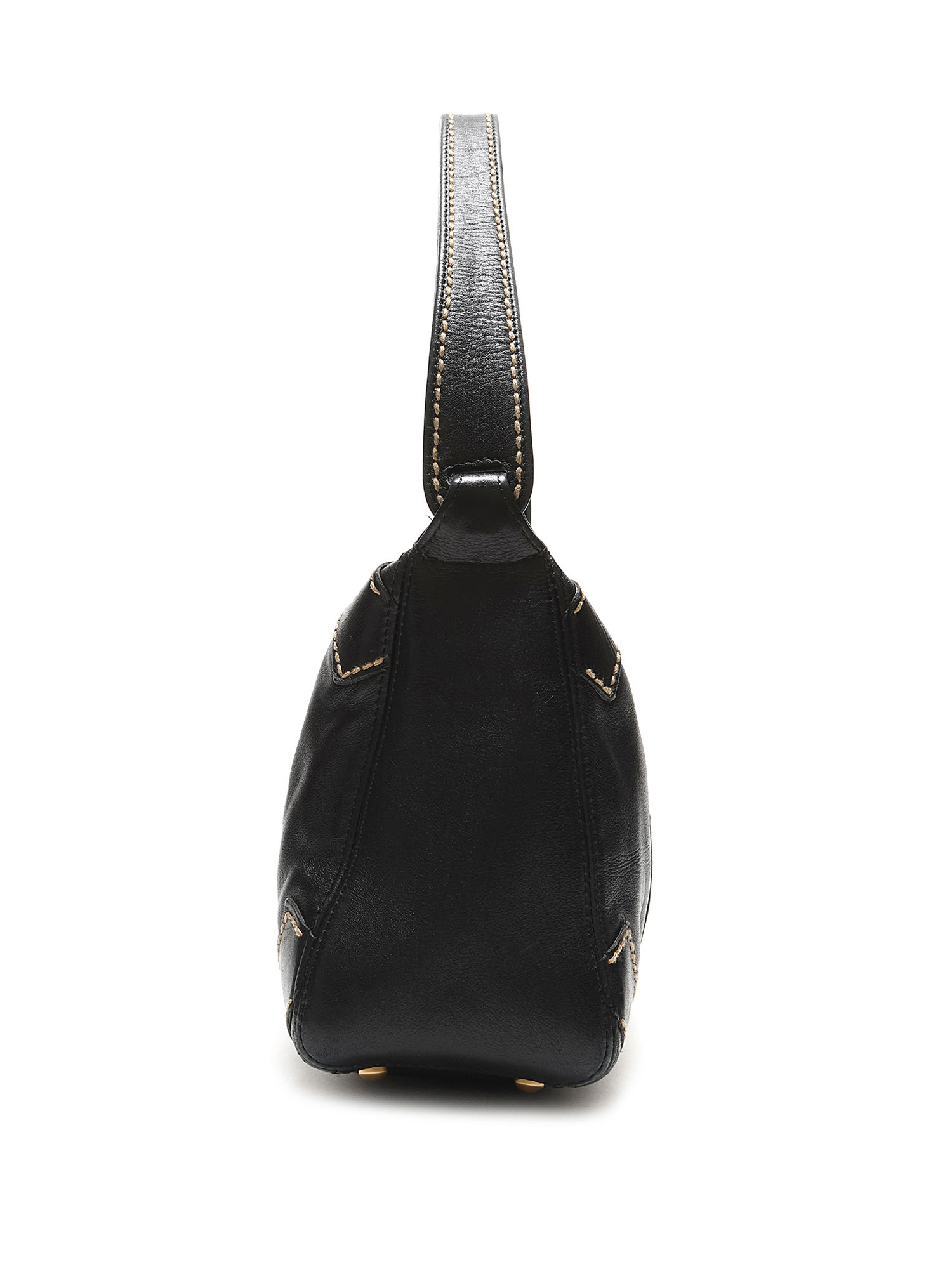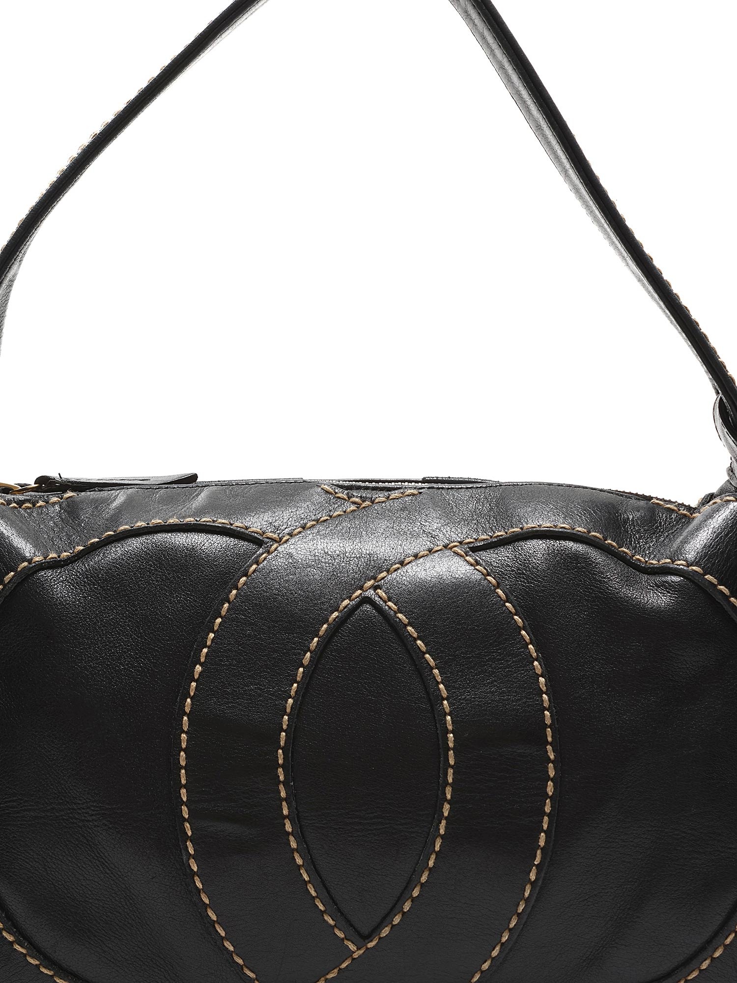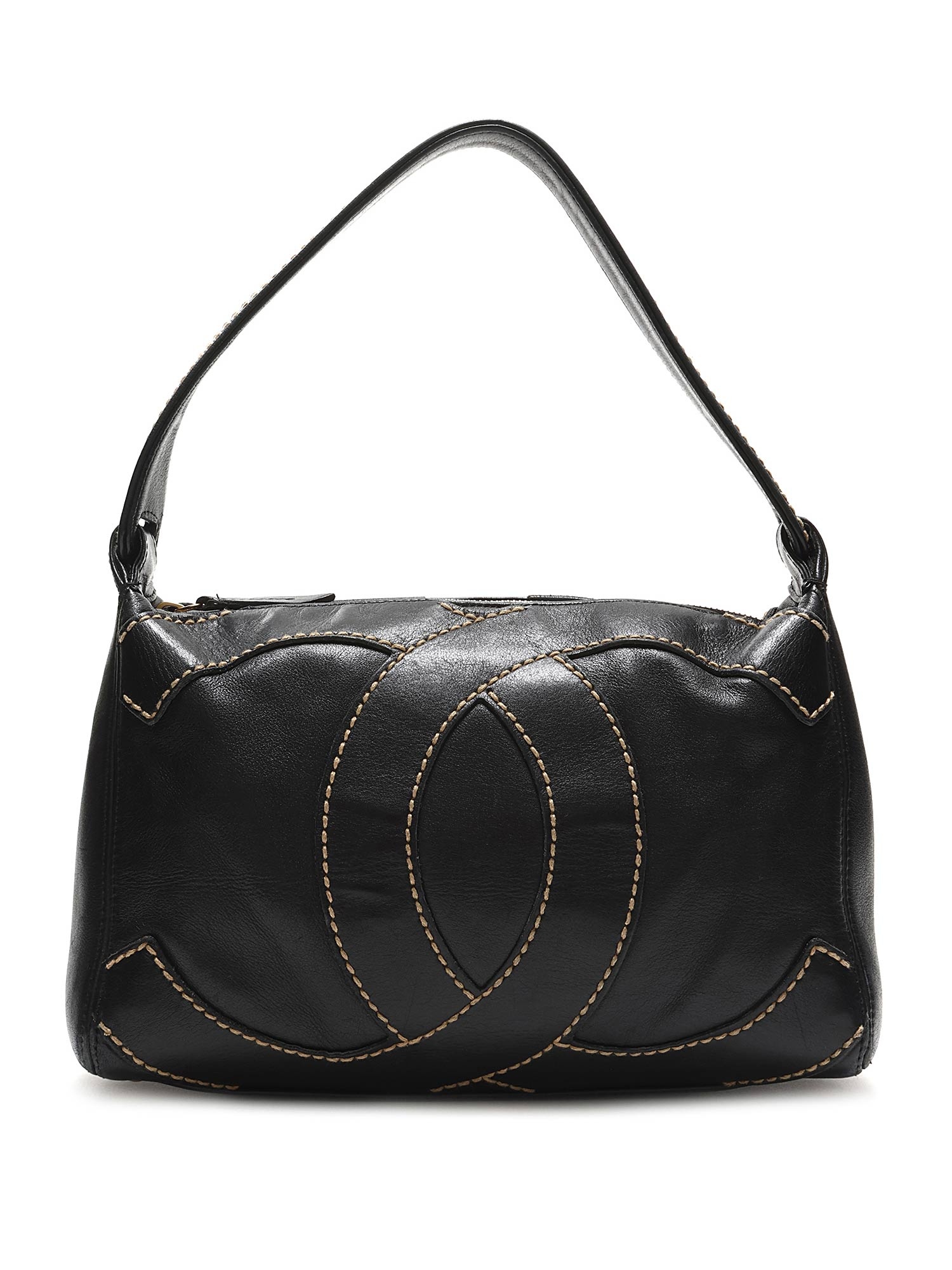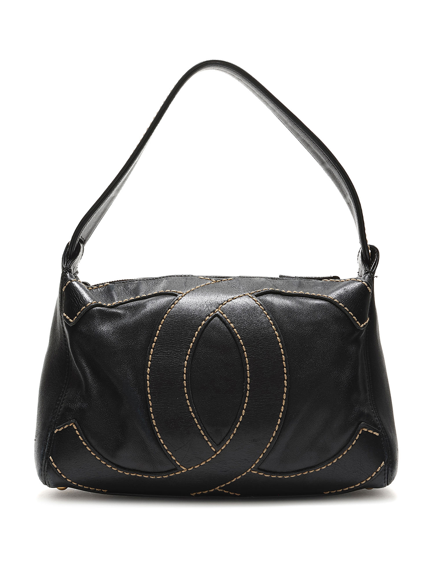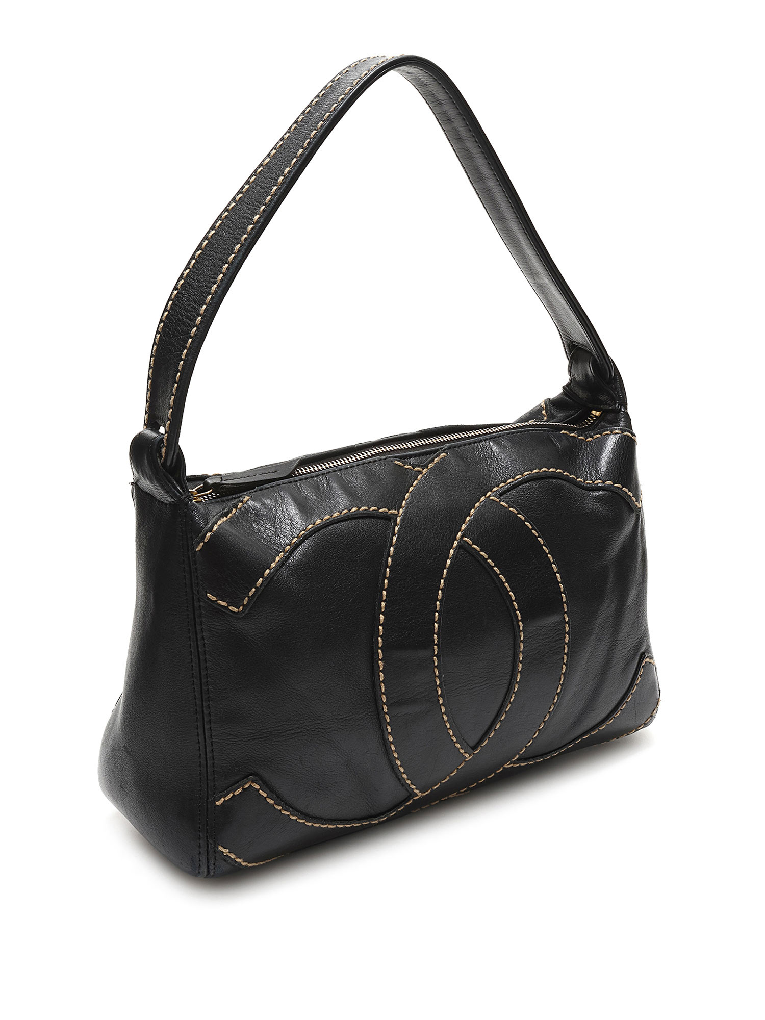 Black grained leather shoulder bag. CC logo on the front and back with beige contrast stitching. Fixed handle. Top zip closure. Includes dust bag.