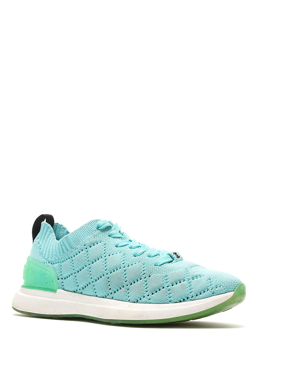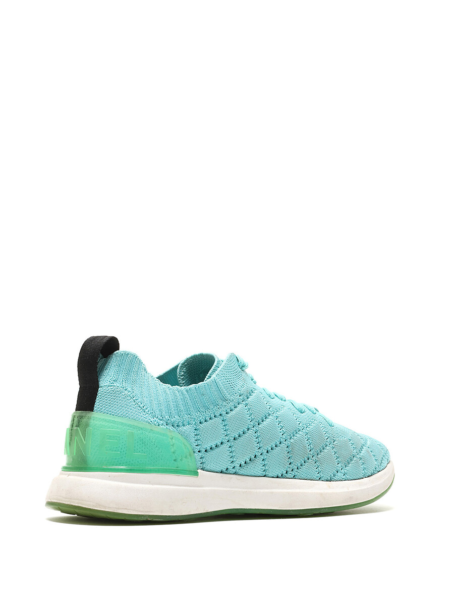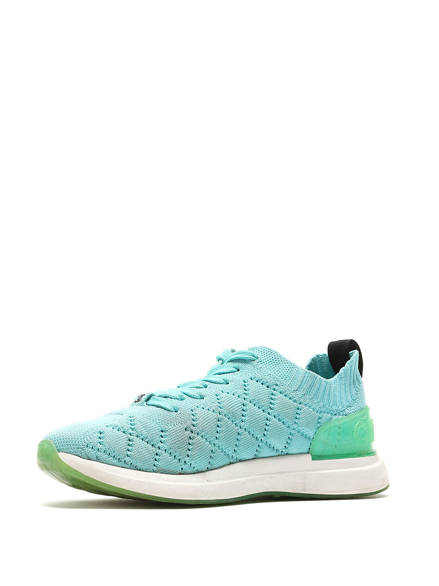 Quilted turquoise low-top espadrilles with green accents. Lace-up closure. Round toe. Rubber sole.