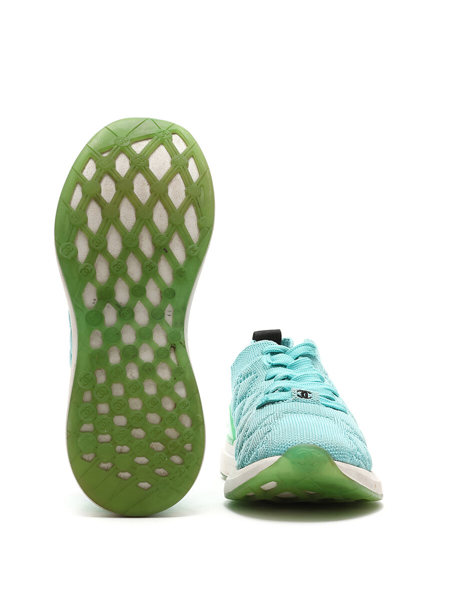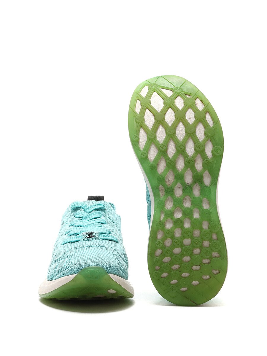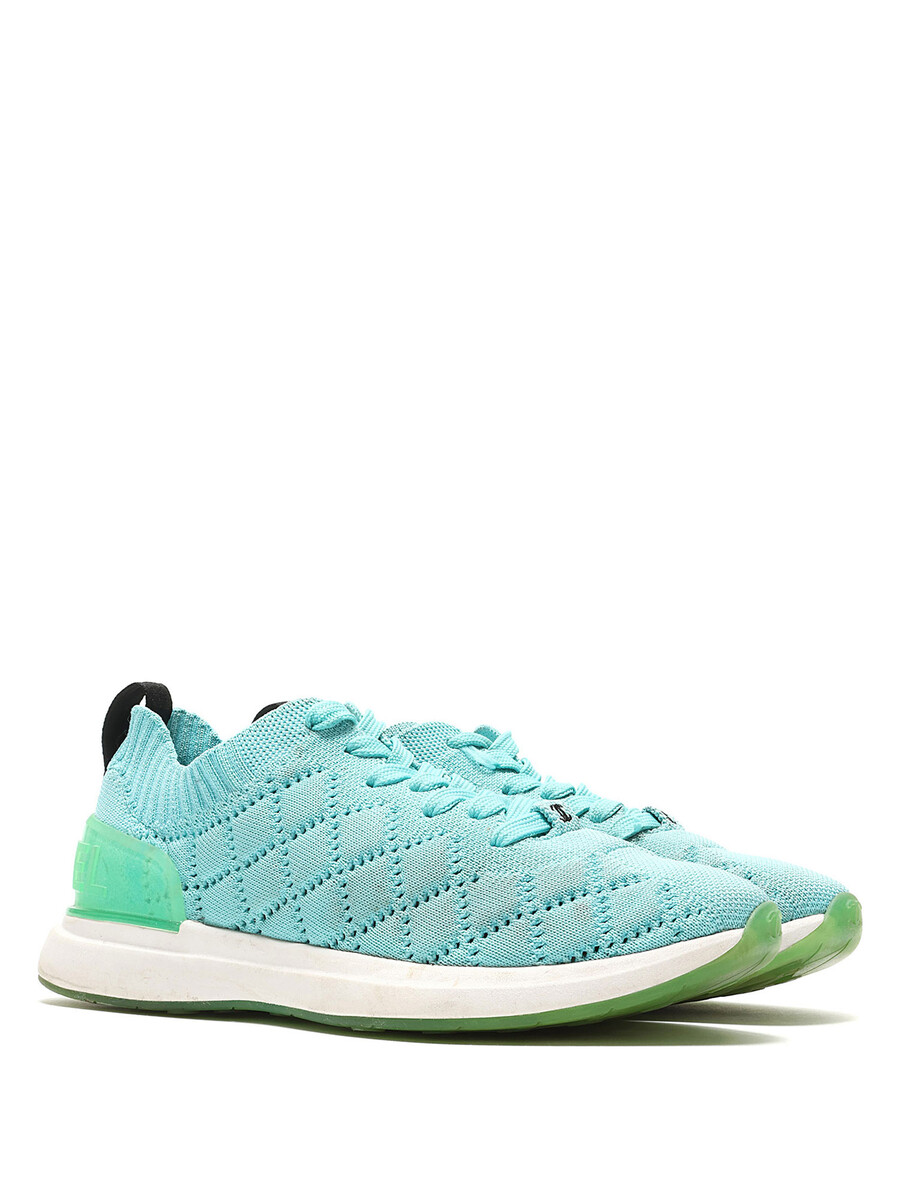 Quilted turquoise low-top espadrilles with green accents. Lace-up closure. Round toe. Rubber sole.