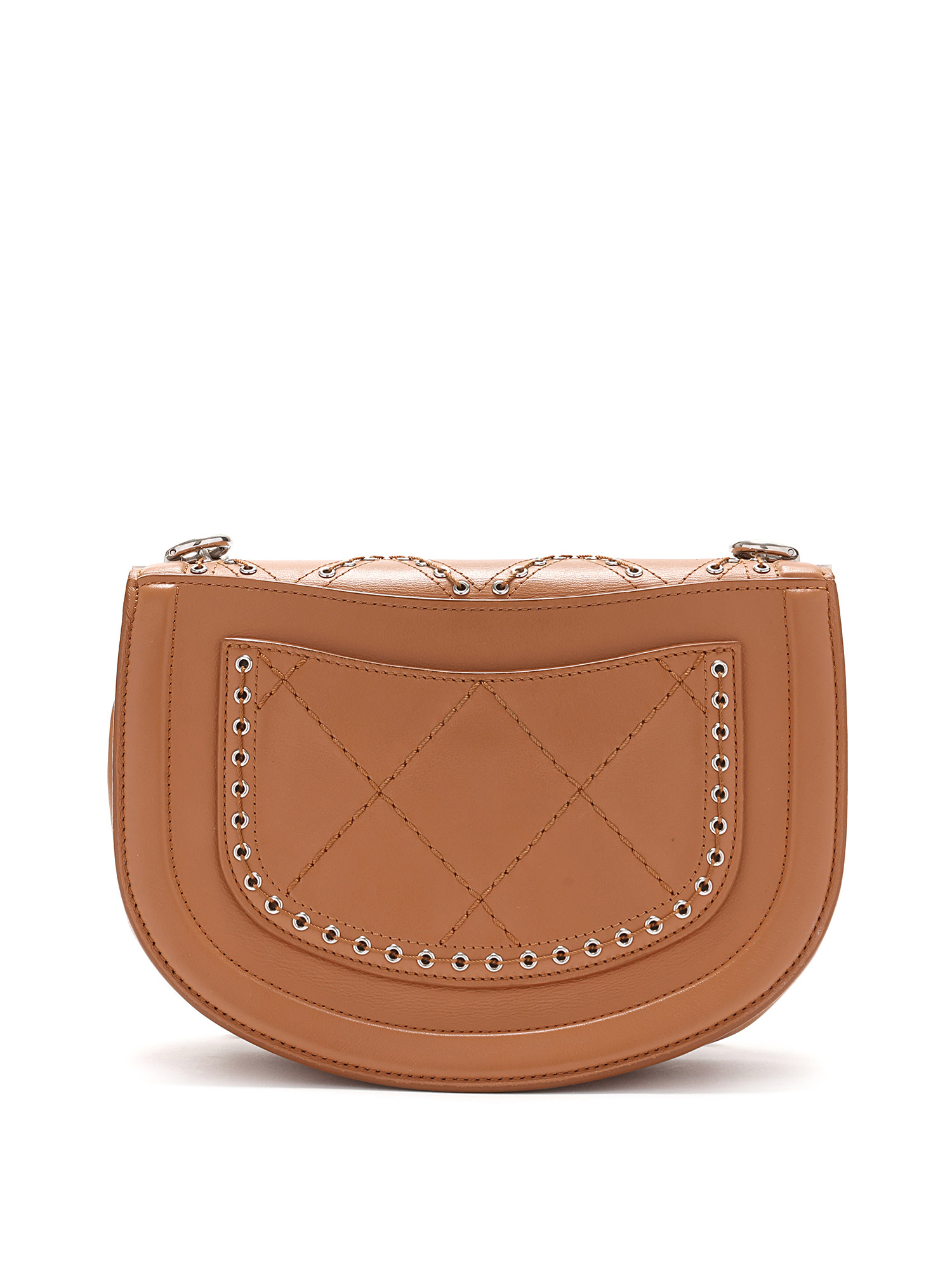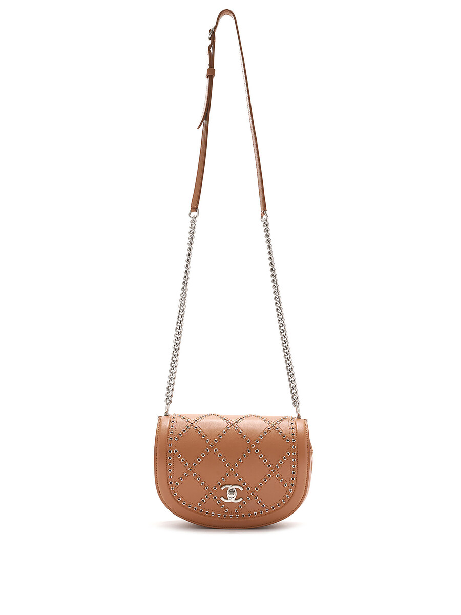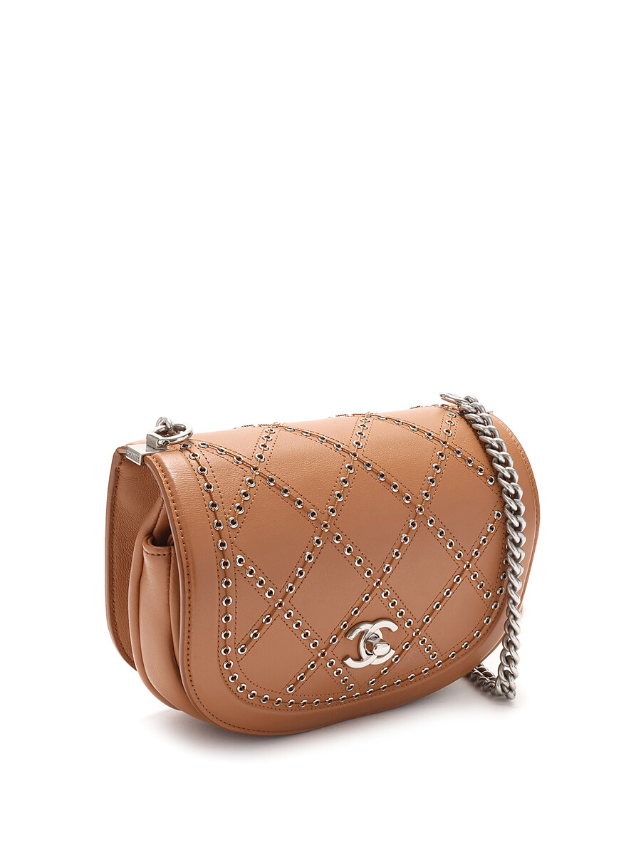 Luxurious leather shoulder bag featuring a tan diamond quilted pattern. Turn-lock closure with adjustable chain and leather strap. Silver-tone hardware.