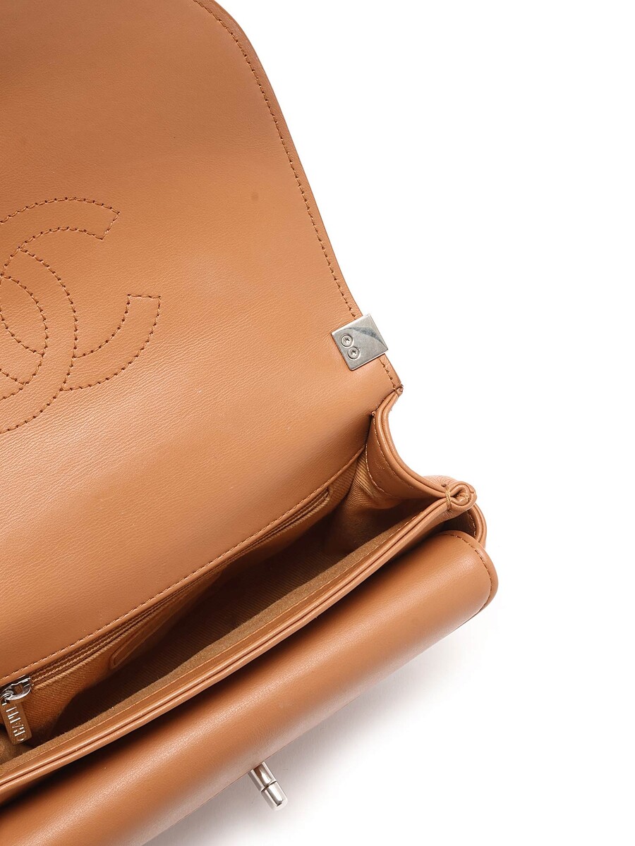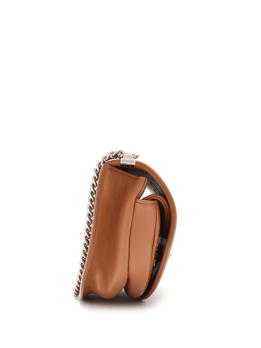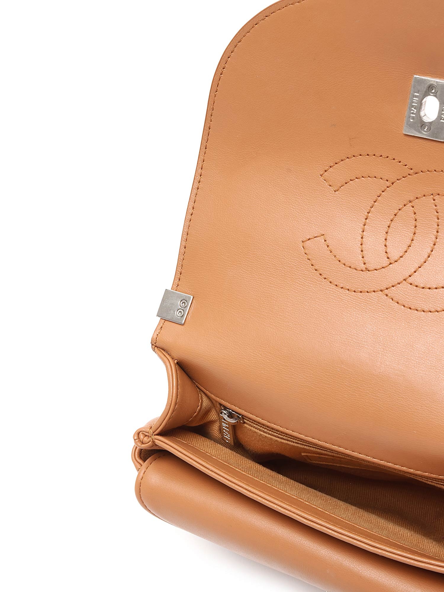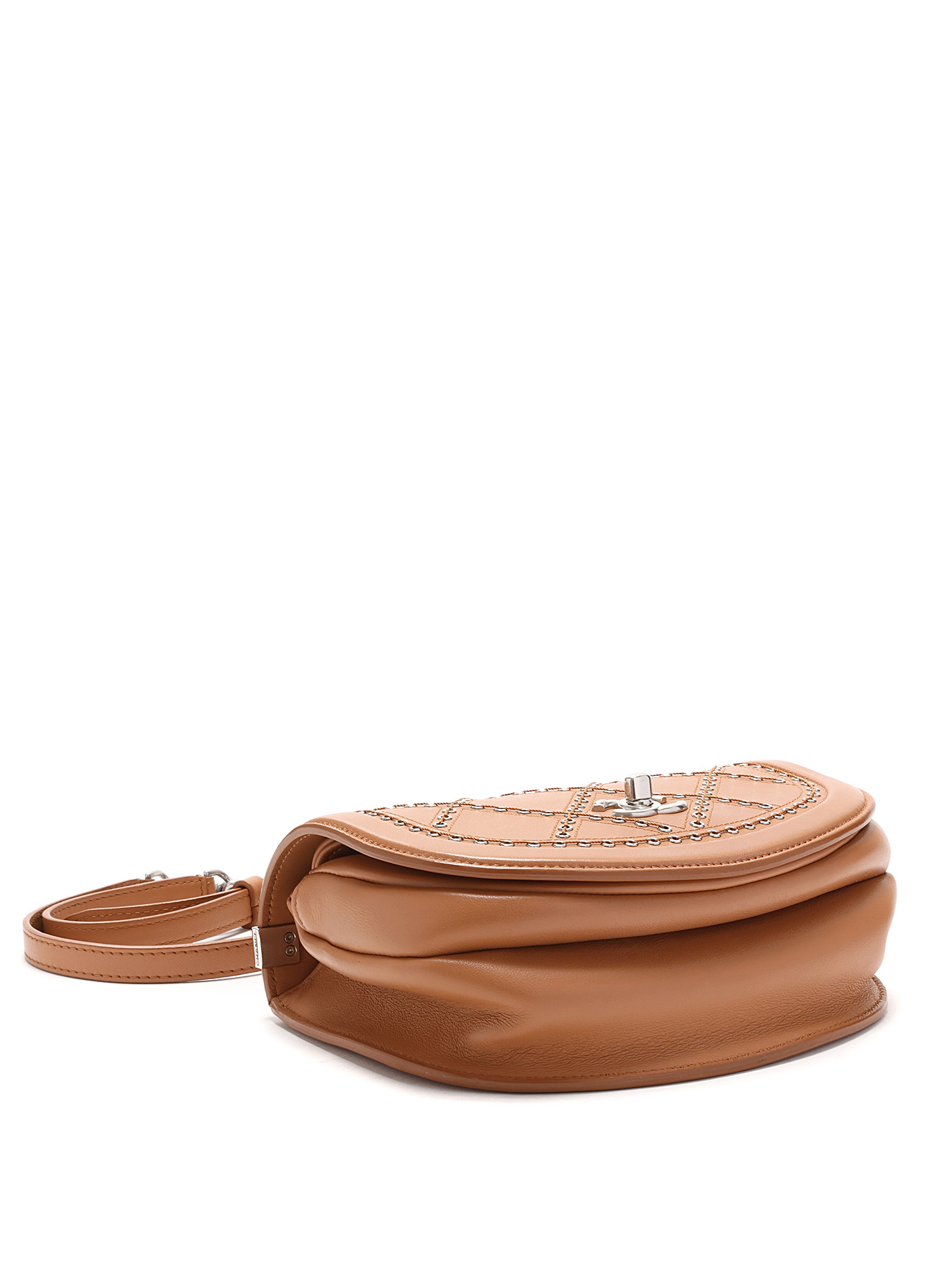 Luxurious leather shoulder bag featuring a tan diamond quilted pattern. Turn-lock closure with adjustable chain and leather strap. Silver-tone hardware.