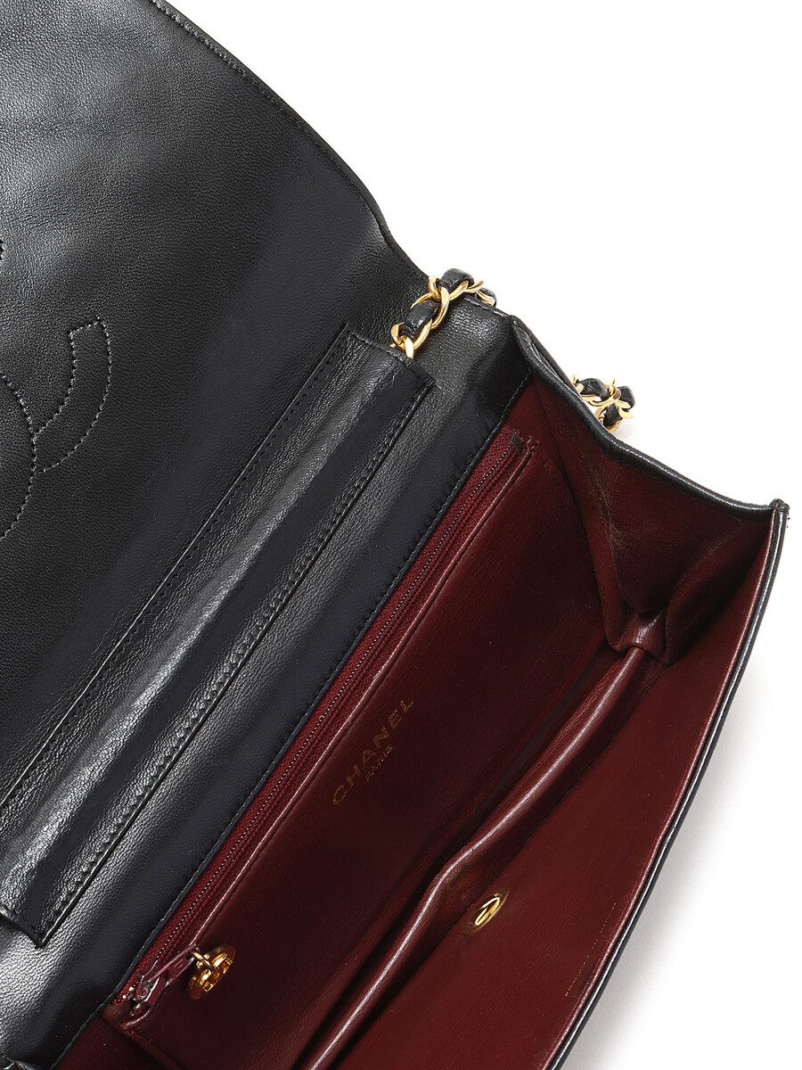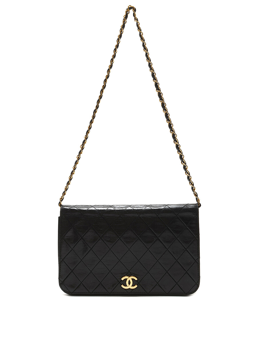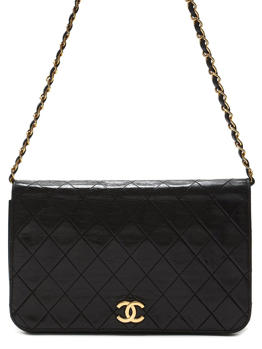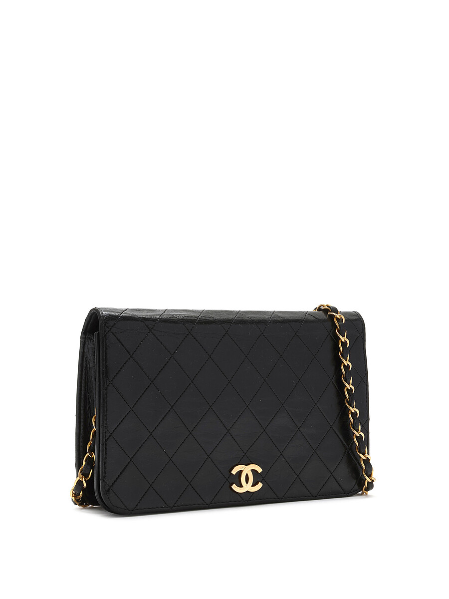 Quilted black lambskin flap shoulder bag. Interwoven leather and chain shoulder strap. CC logo plaque on flap. Push-lock closure. Gold-tone hardware. With box.