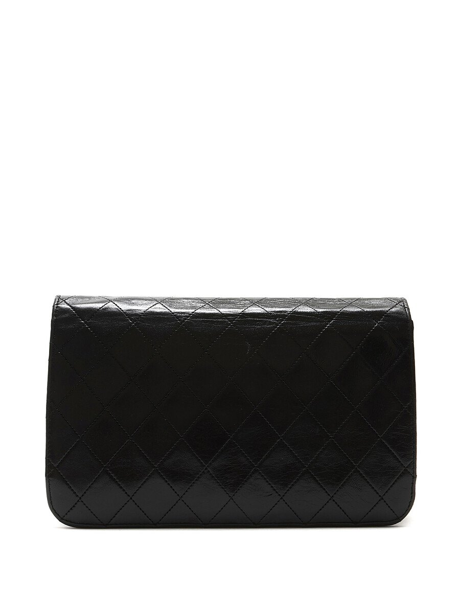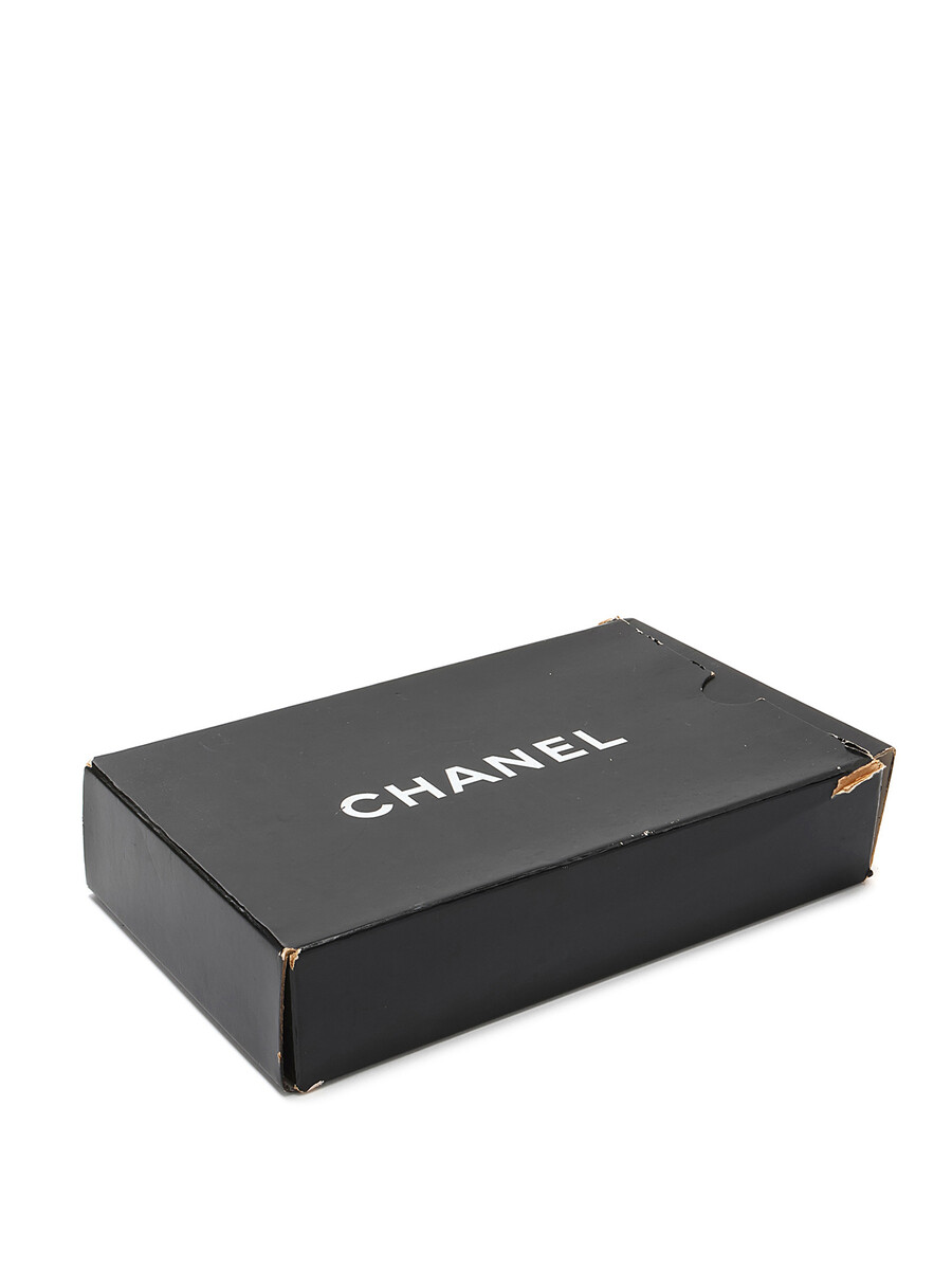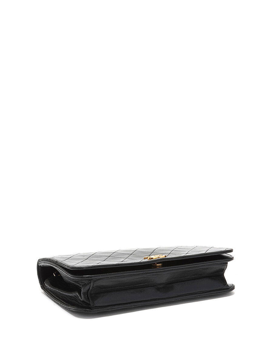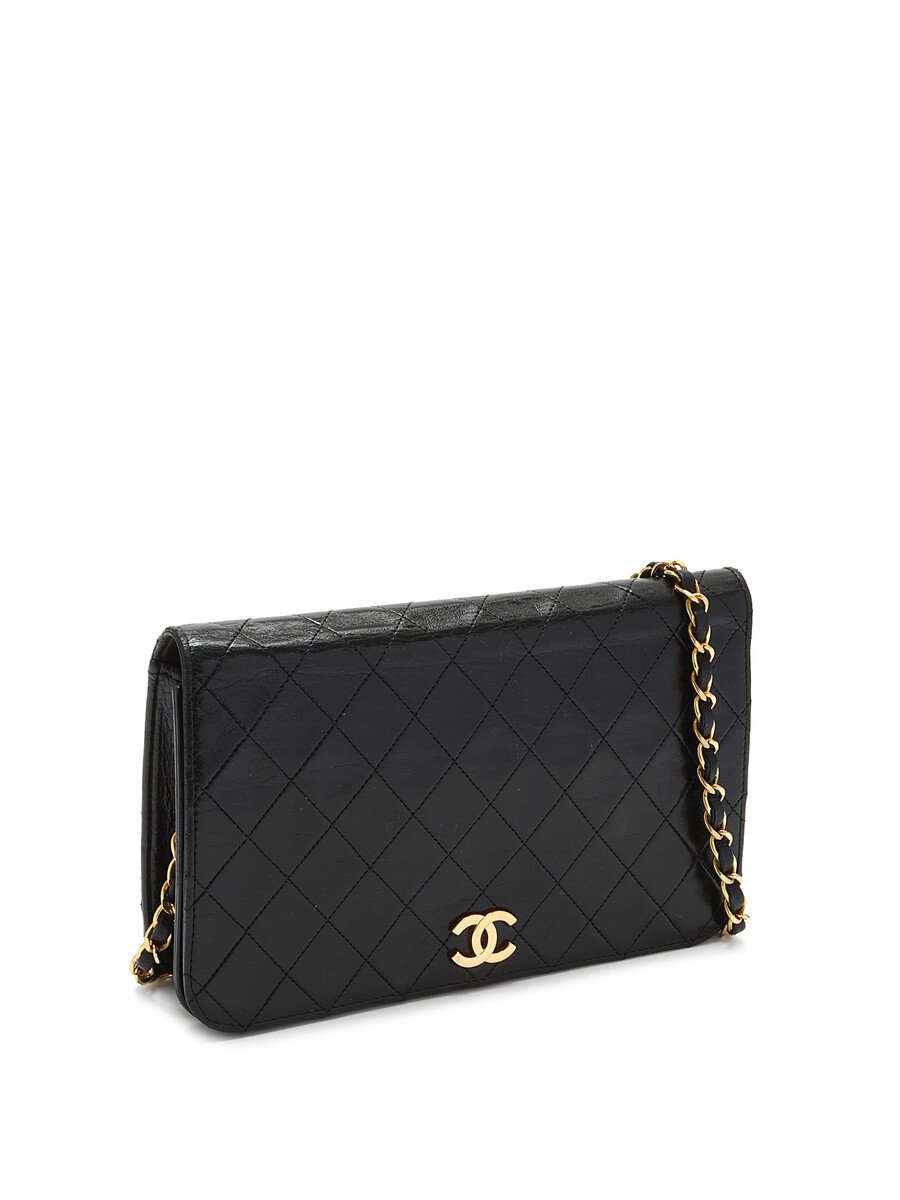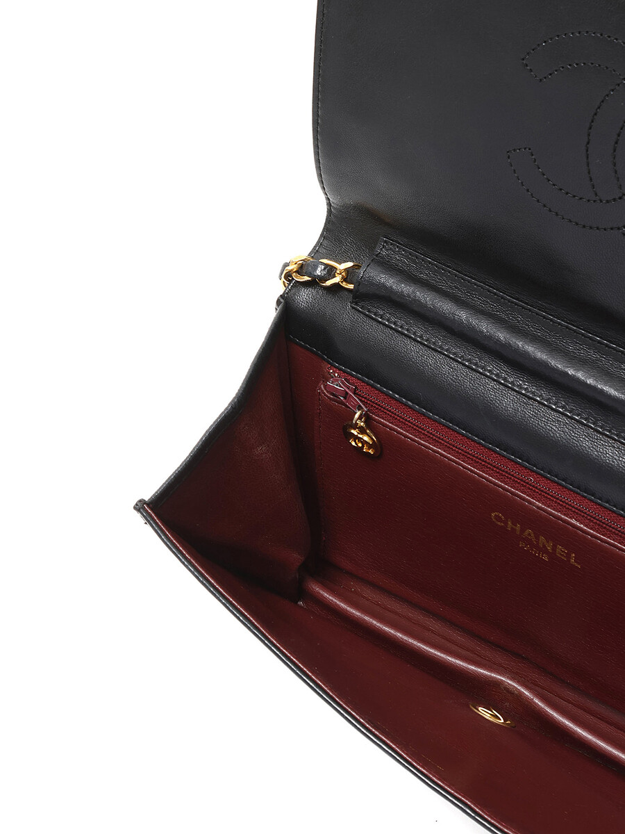 Quilted black lambskin flap shoulder bag. Interwoven leather and chain shoulder strap. CC logo plaque on flap. Push-lock closure. Gold-tone hardware. With box.