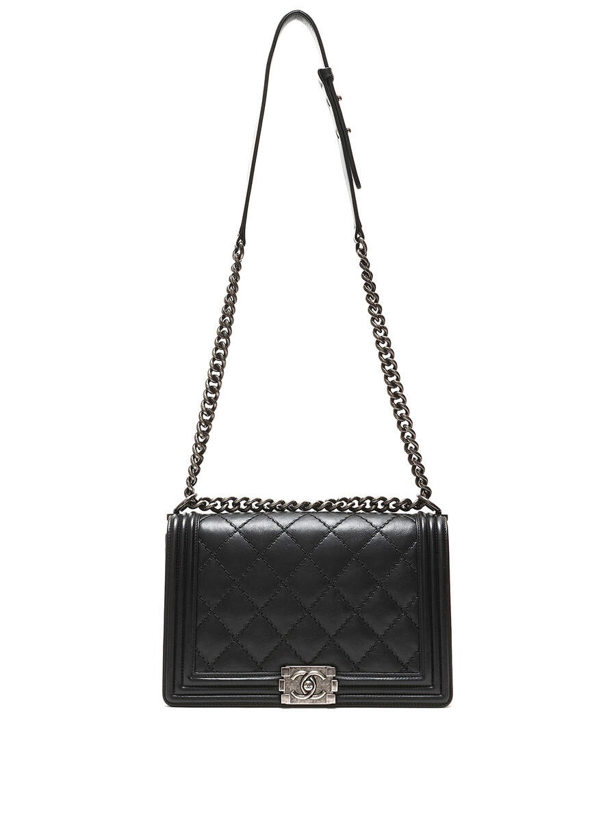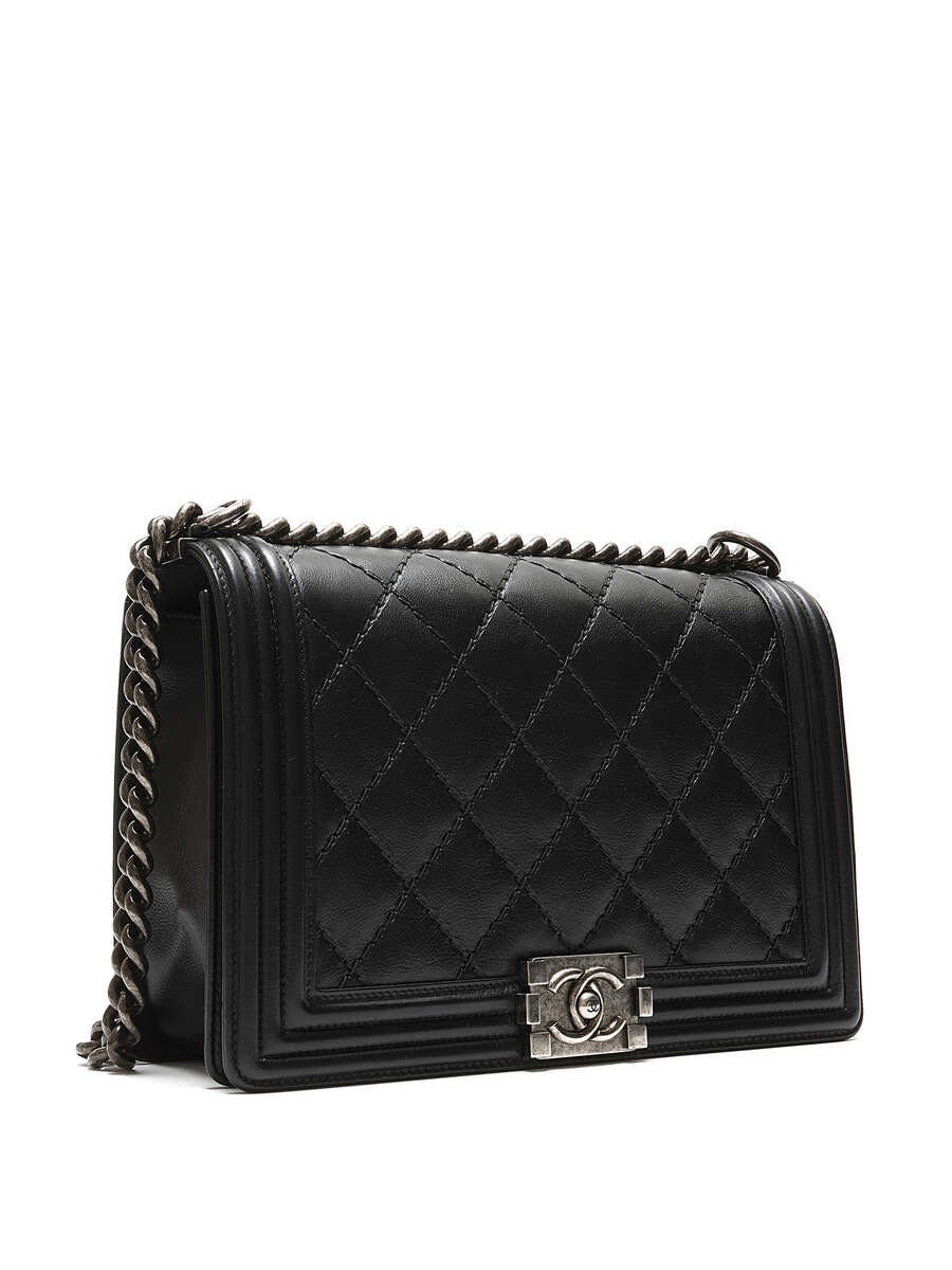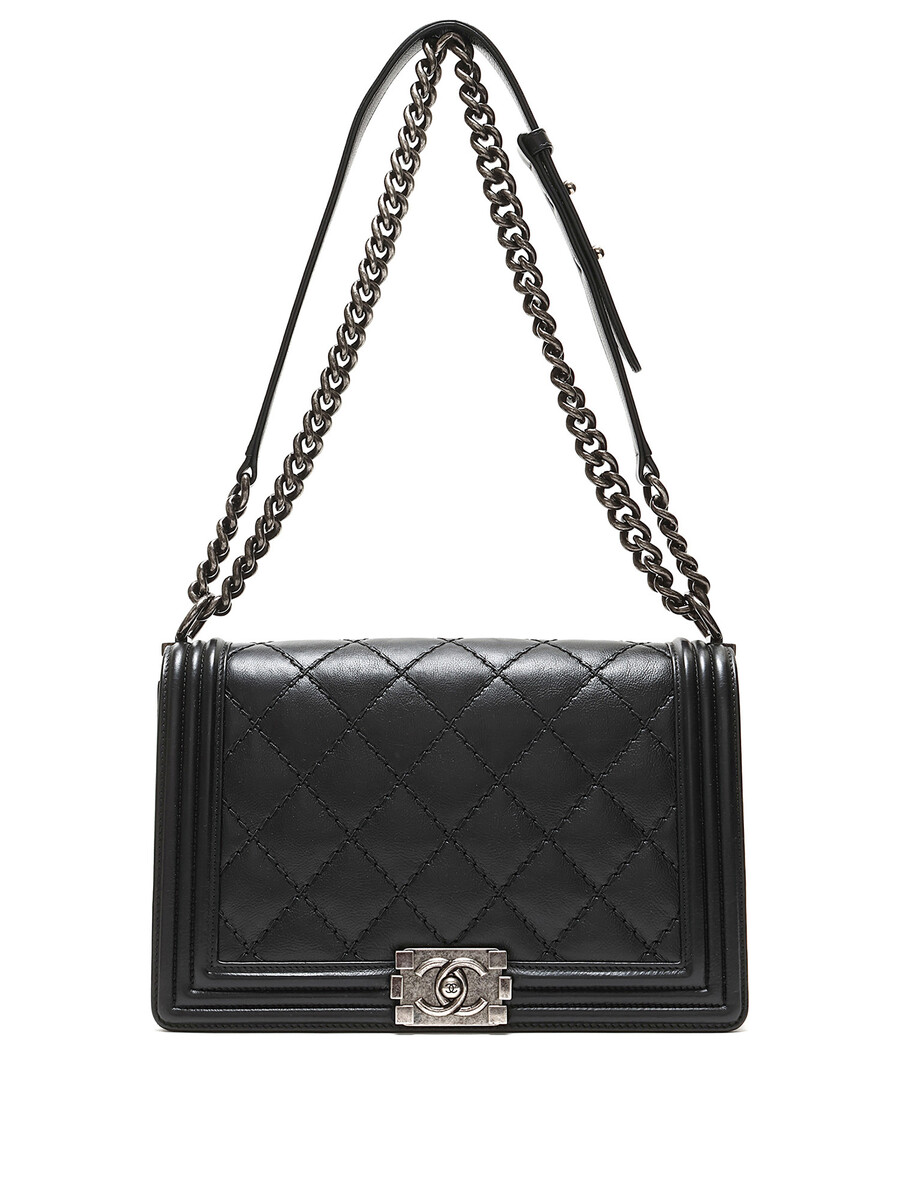 Signature quilted black leather bag featuring iconic 'Boy' clasp in steel grey metal on the flap. Convertible leather and gourmette chain strap.