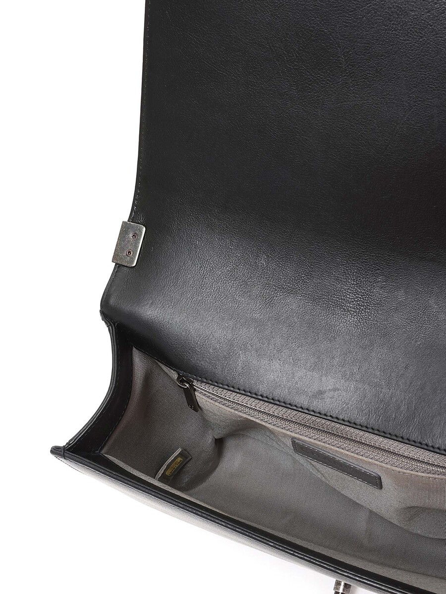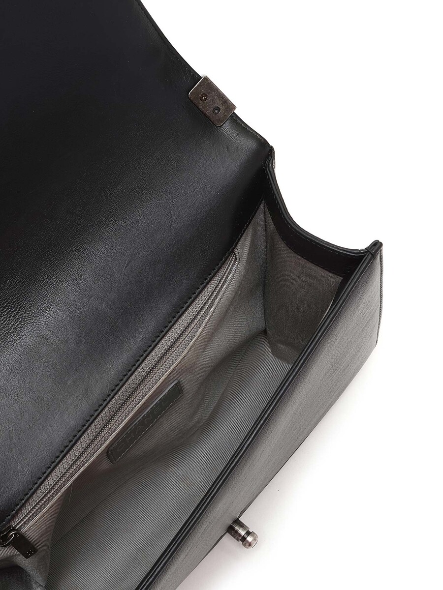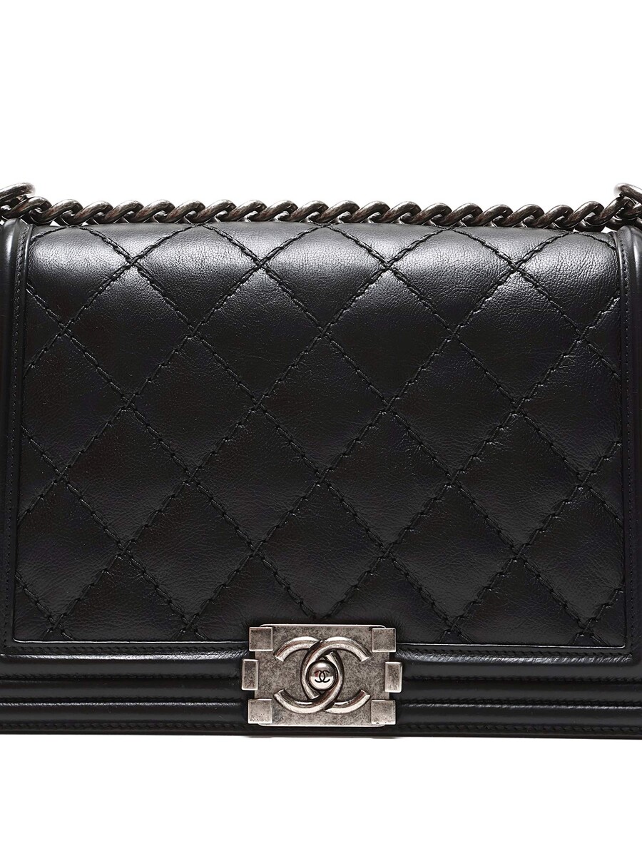 Signature quilted black leather bag featuring iconic 'Boy' clasp in steel grey metal on the flap. Convertible leather and gourmette chain strap.