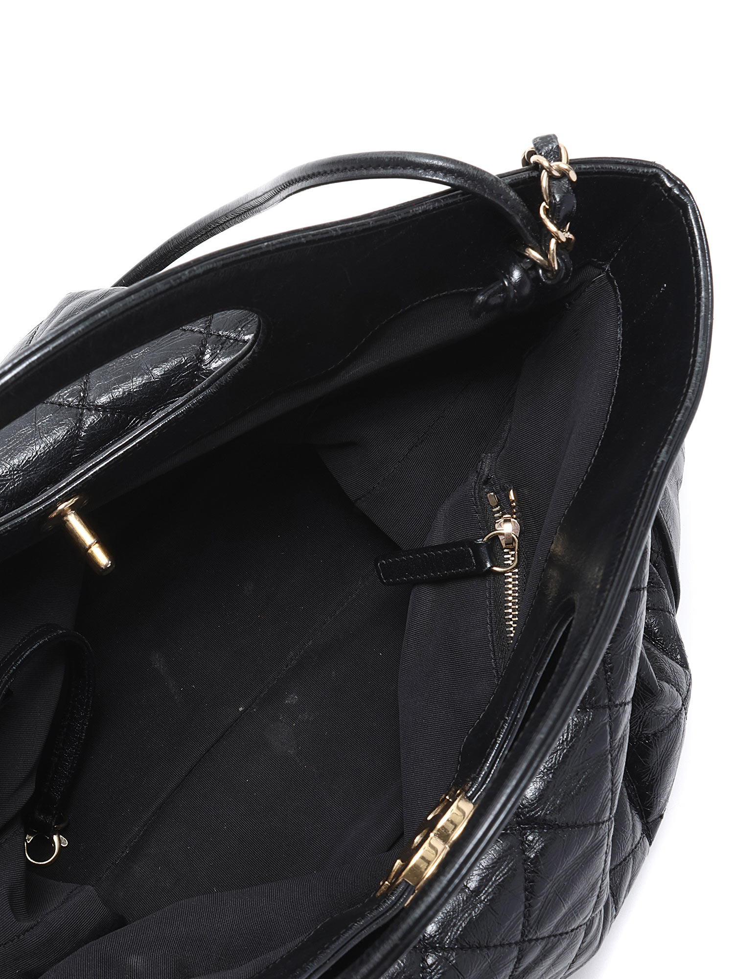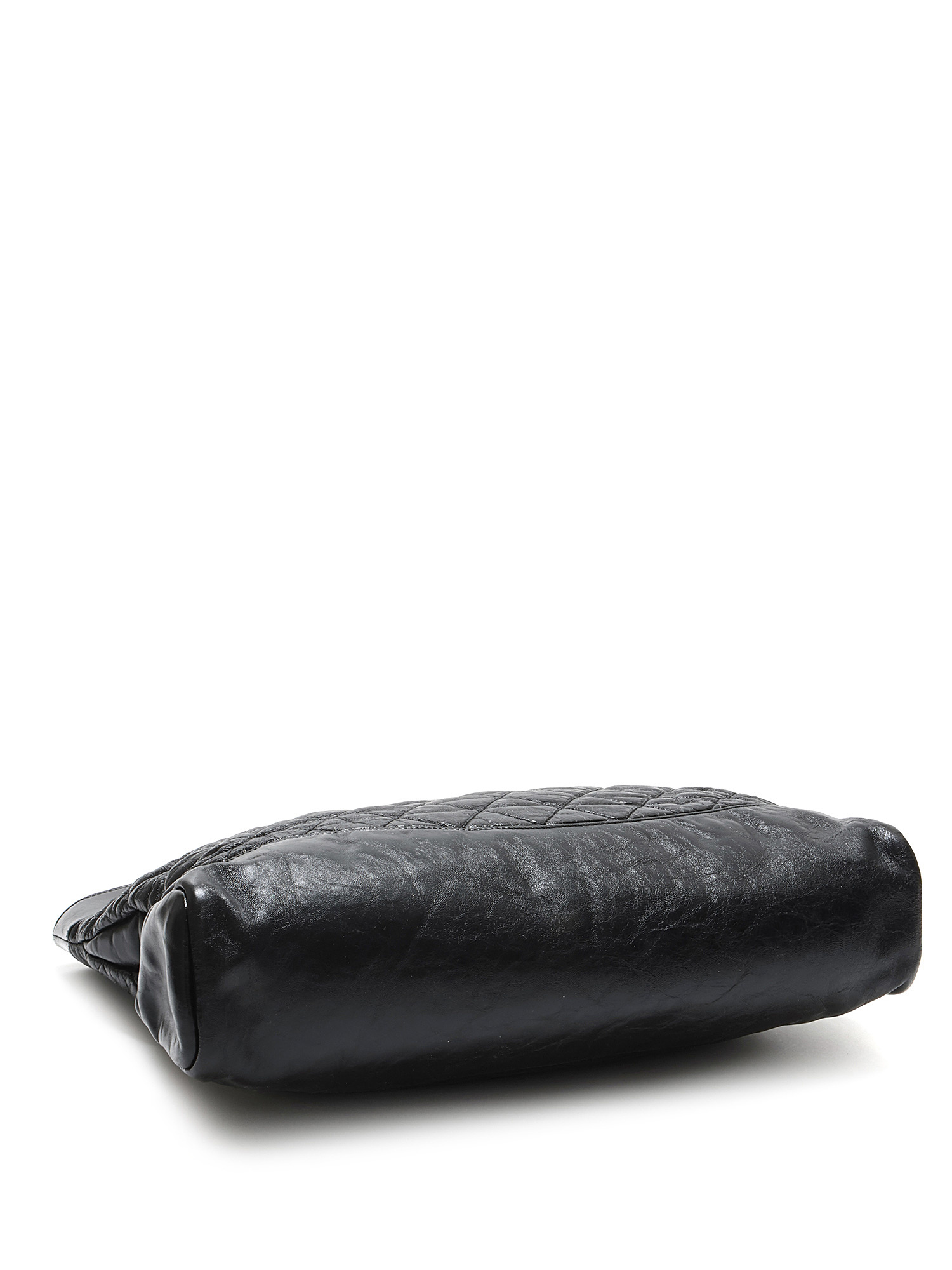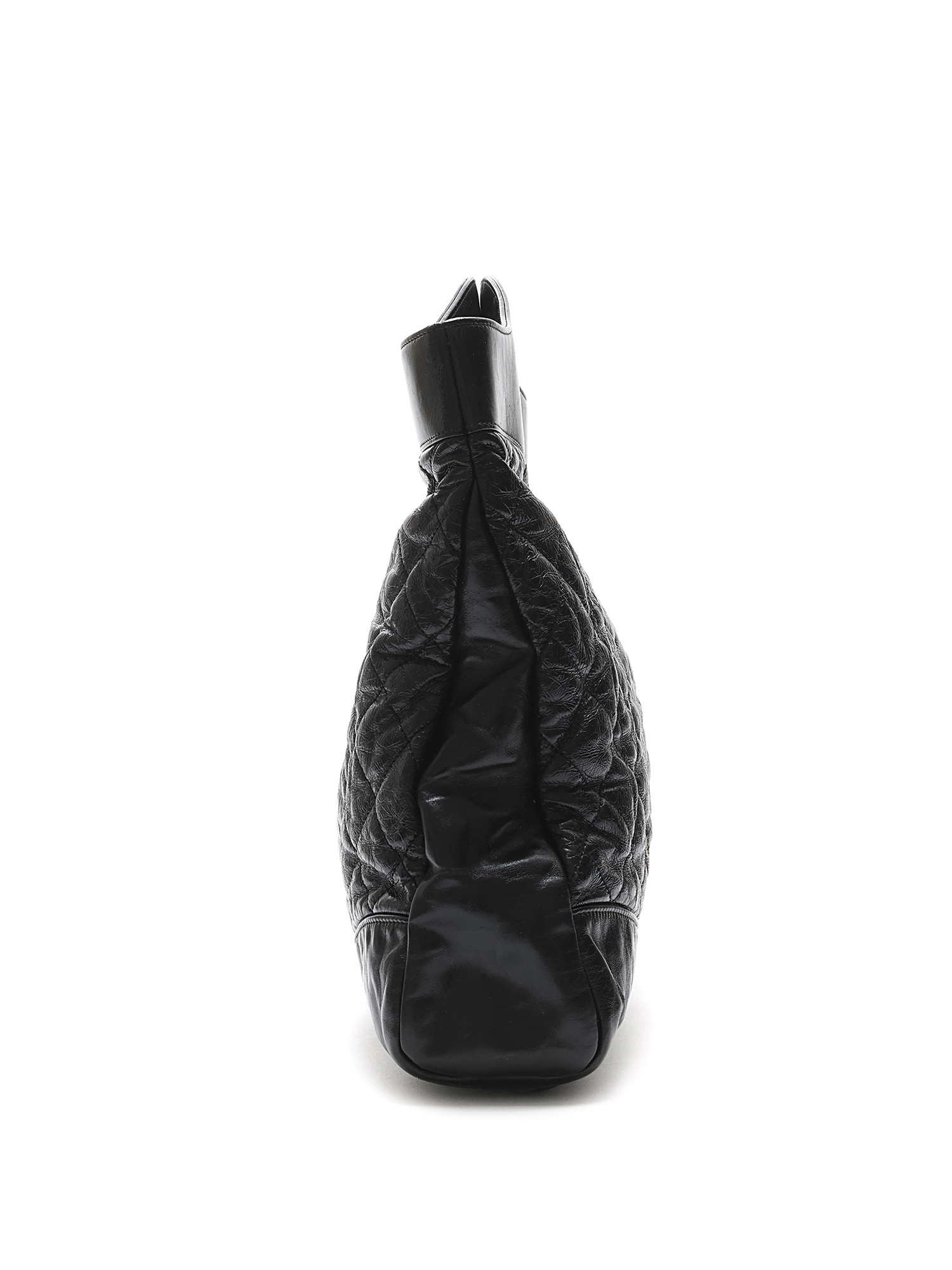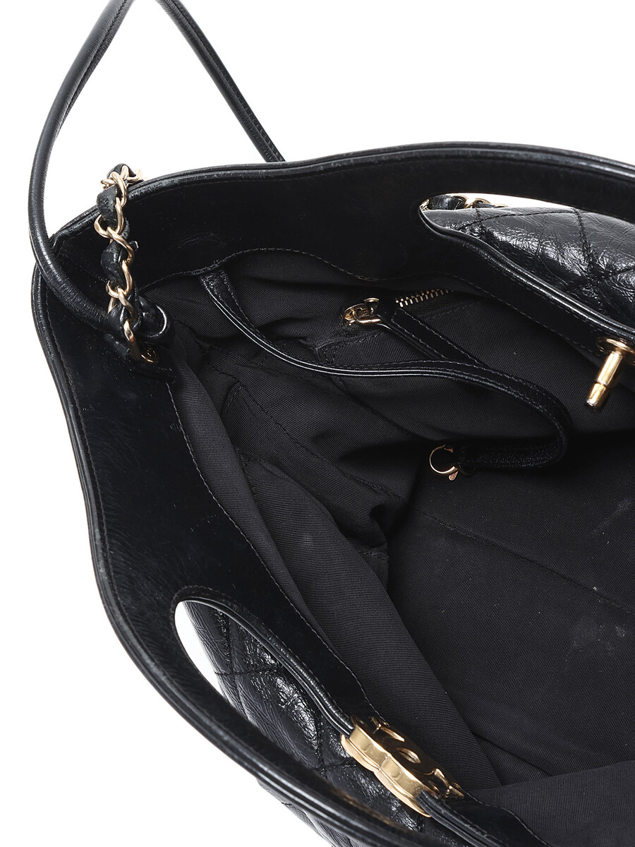 Quilted leather sheath bag in black. Twist-lock closure. Integrated handles. Gold-tone metal hardware. Leather and chain shoulder strap.
