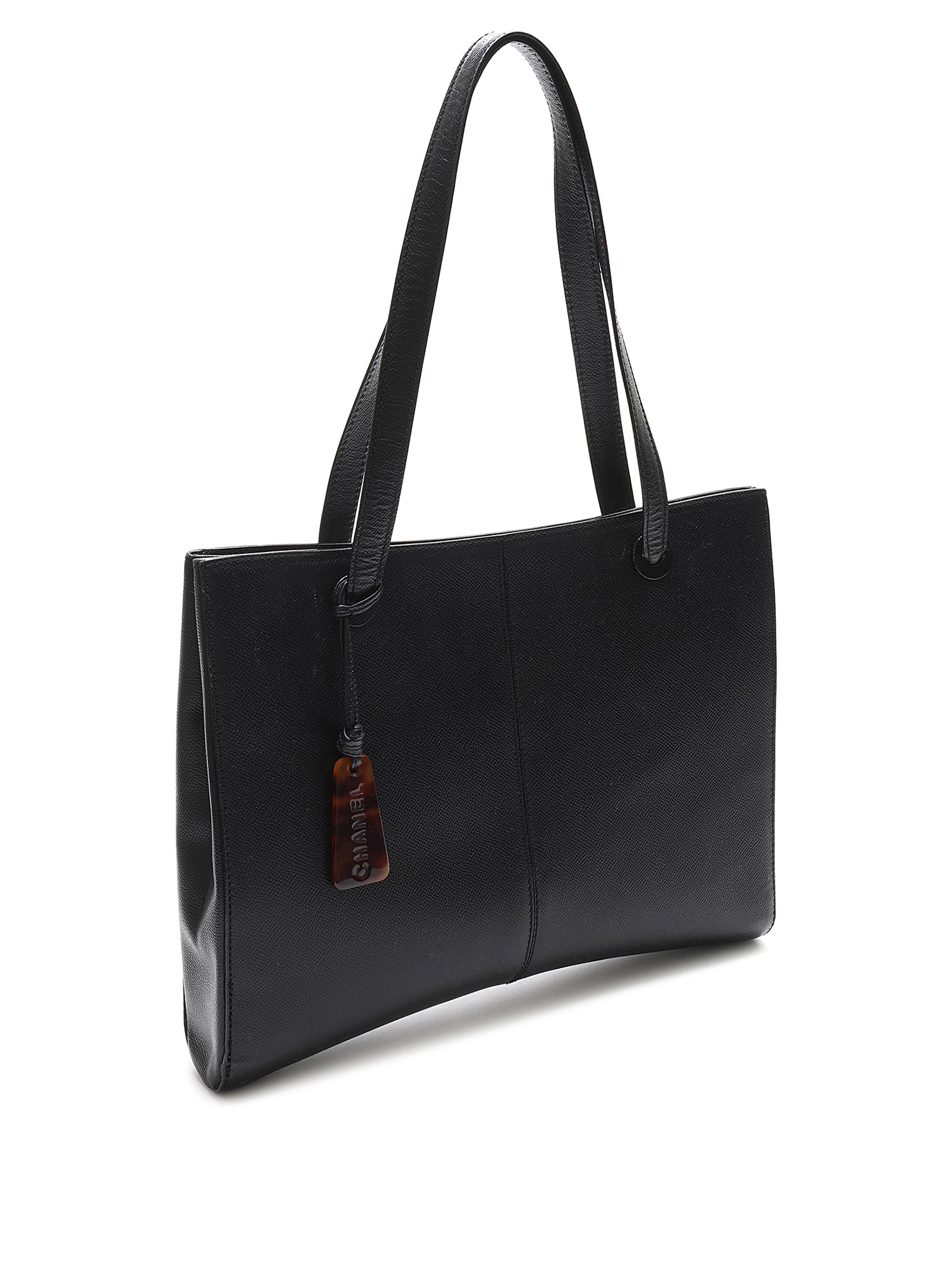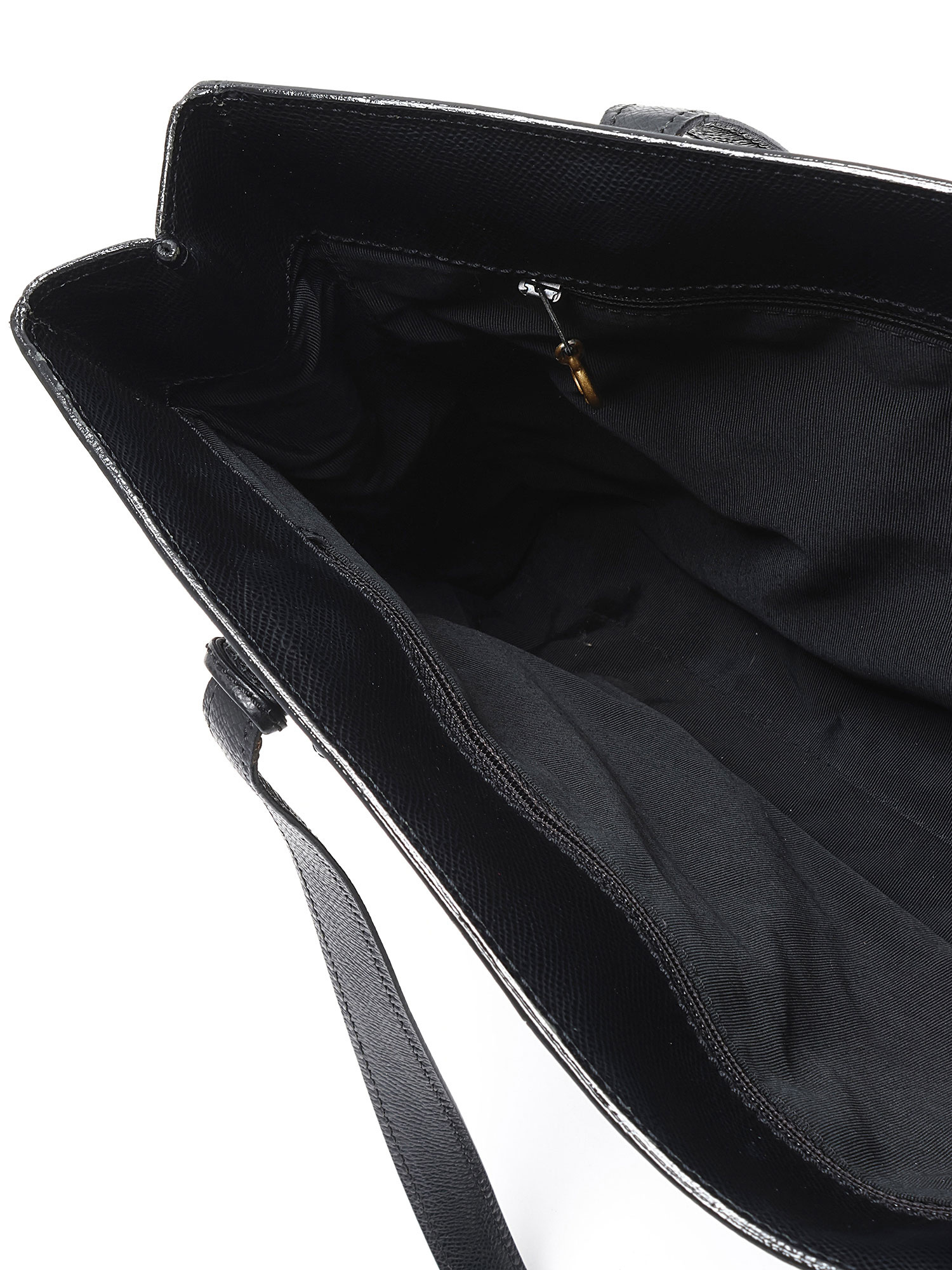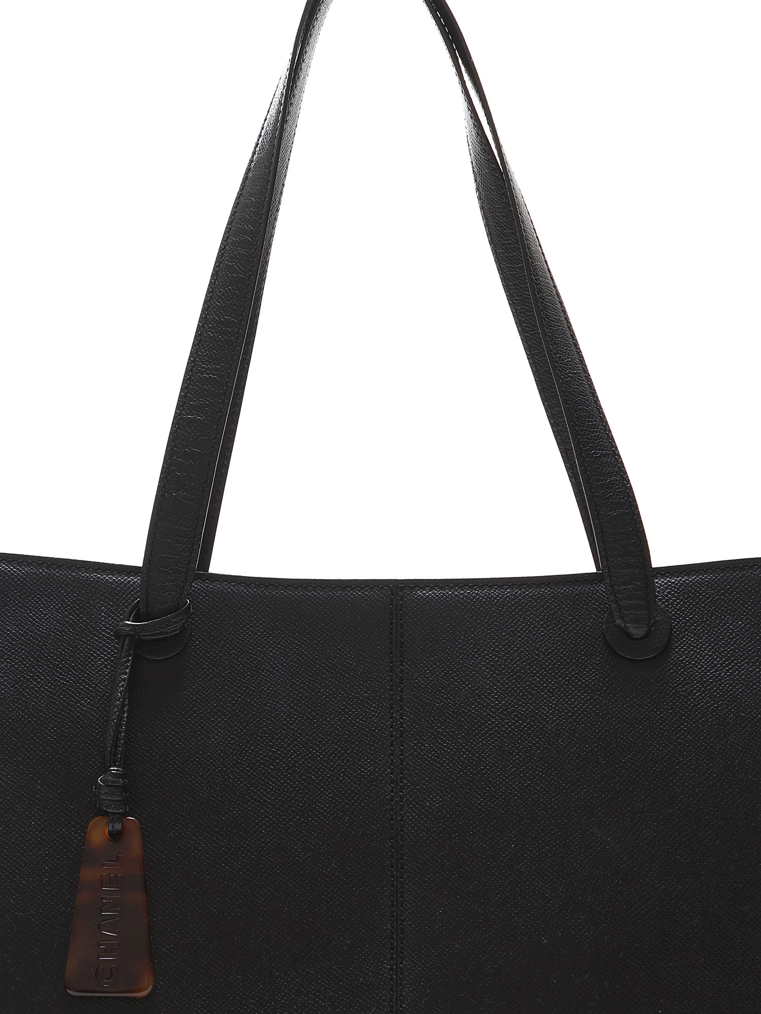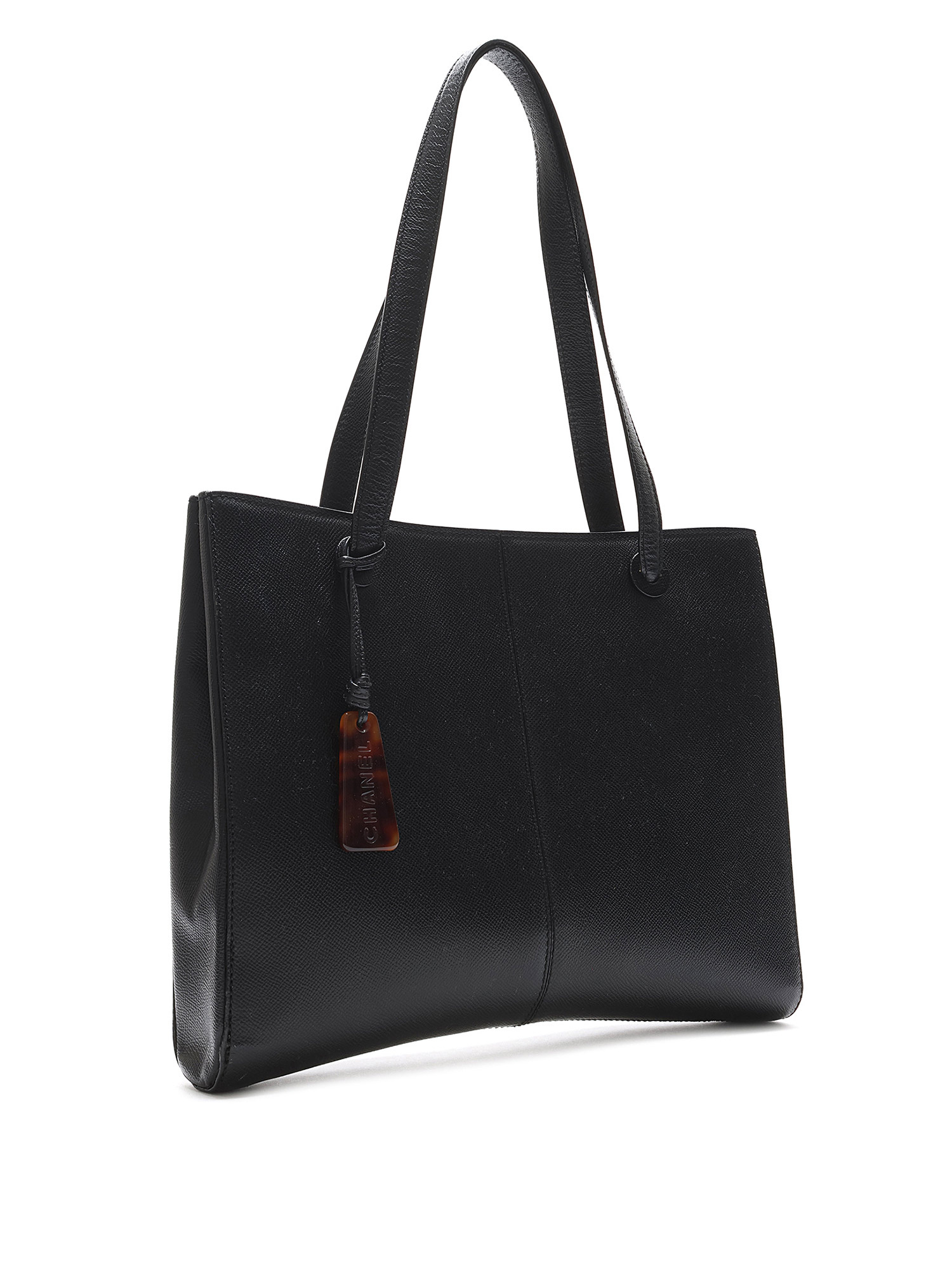 Timeless black textured leather classic tote bag. Magnetic closure. Leather handles with gold-tone hardware. Tortoiseshell acetate logo charm.