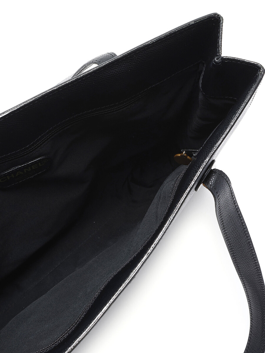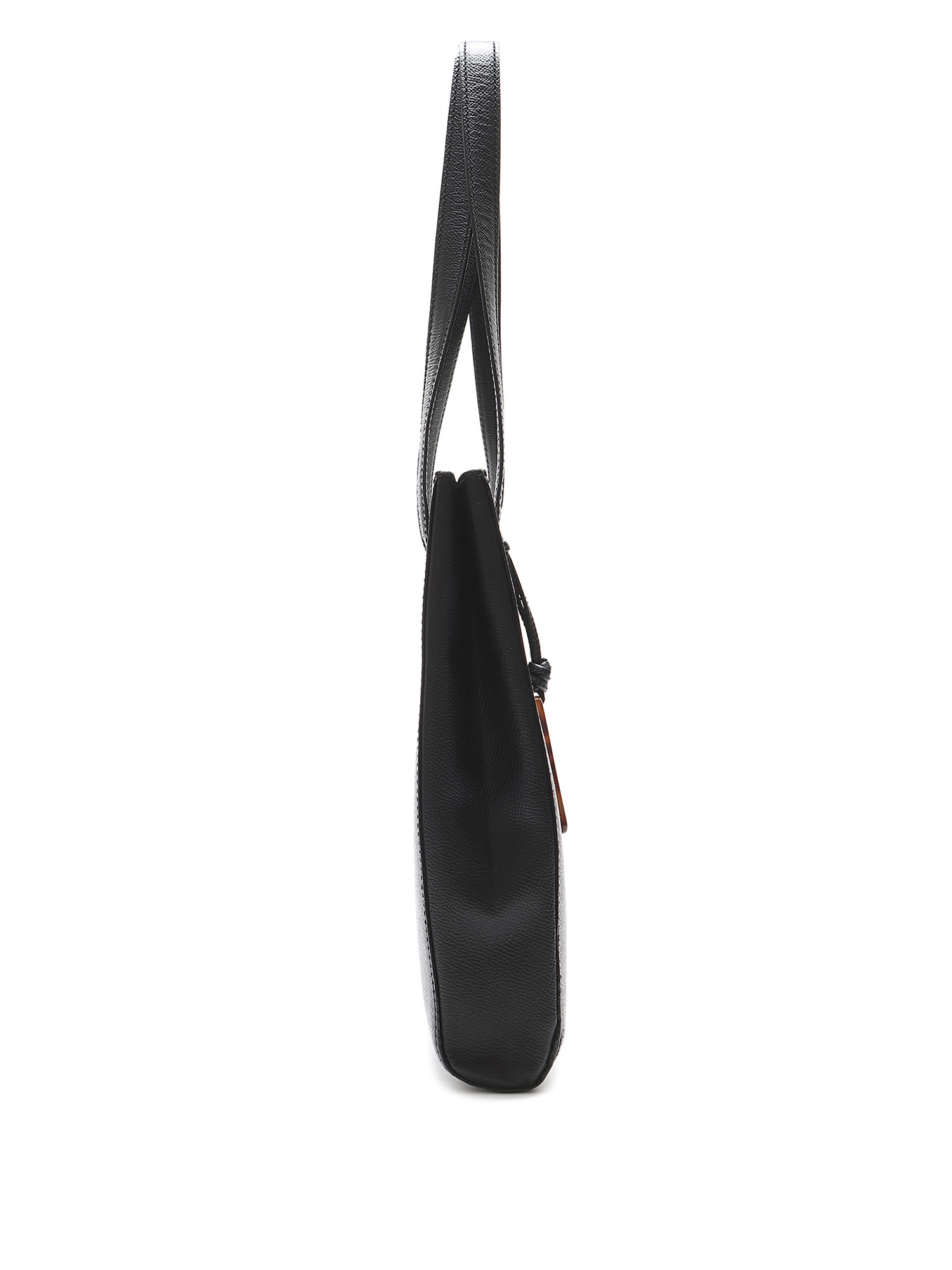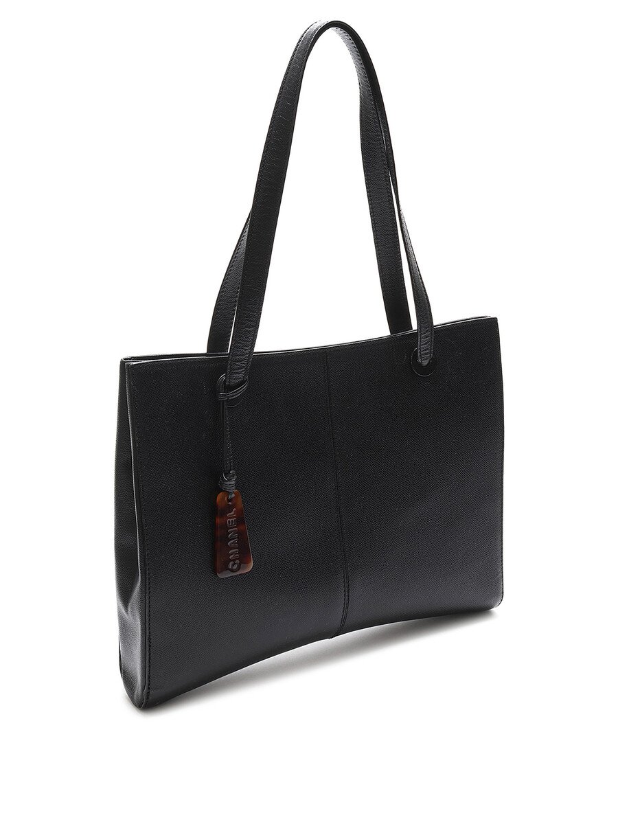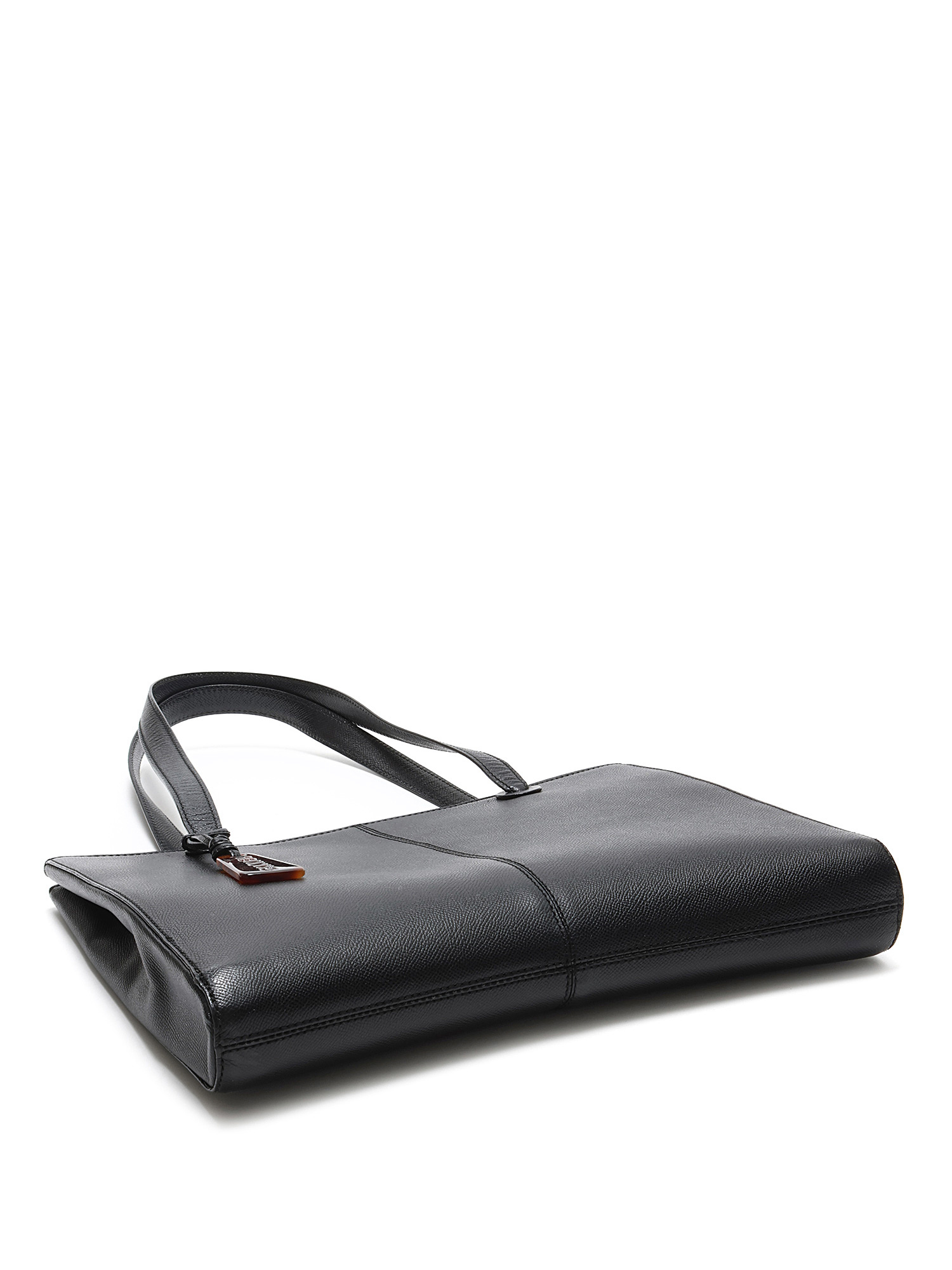 Timeless black textured leather classic tote bag. Magnetic closure. Leather handles with gold-tone hardware. Tortoiseshell acetate logo charm.