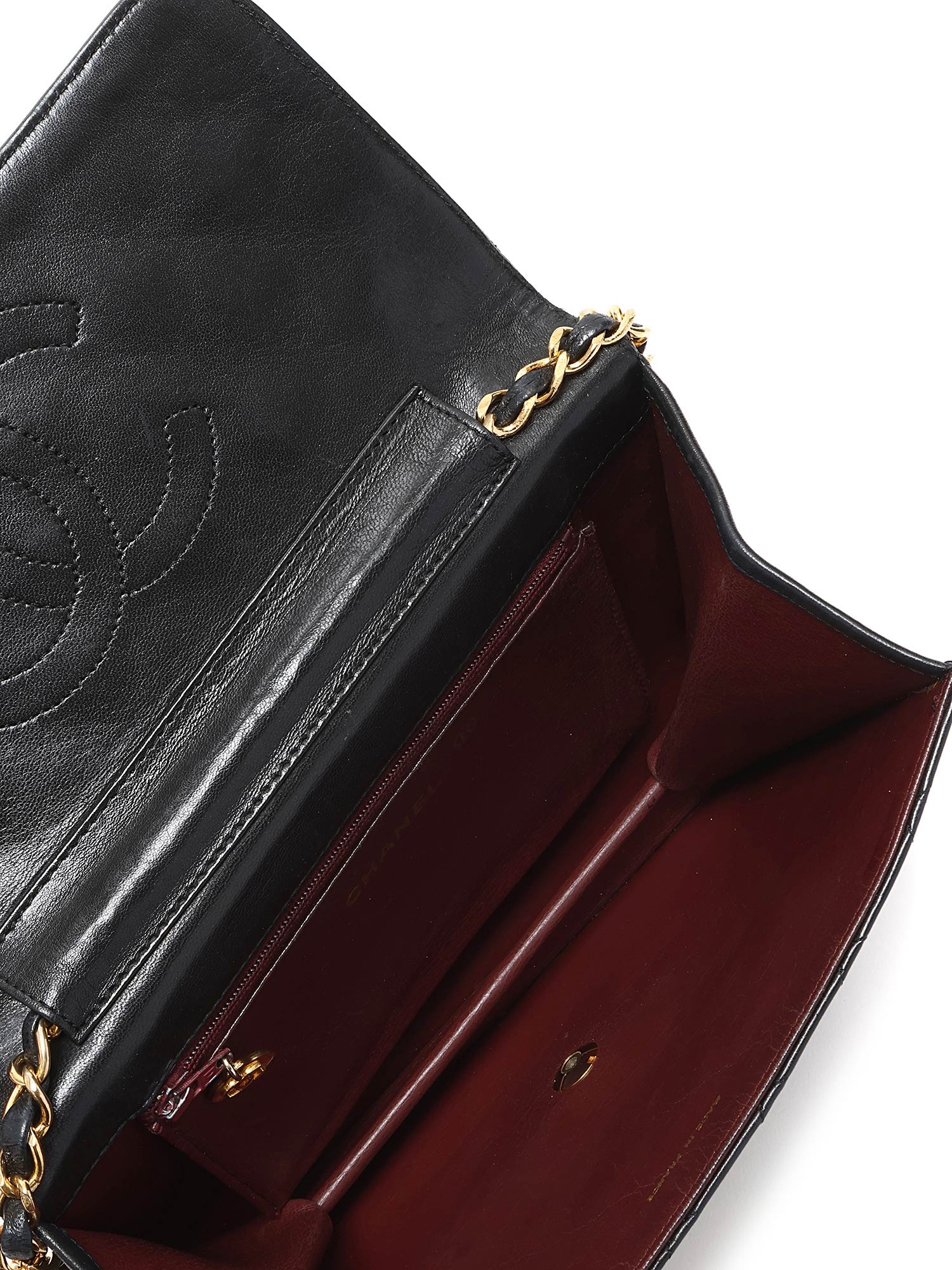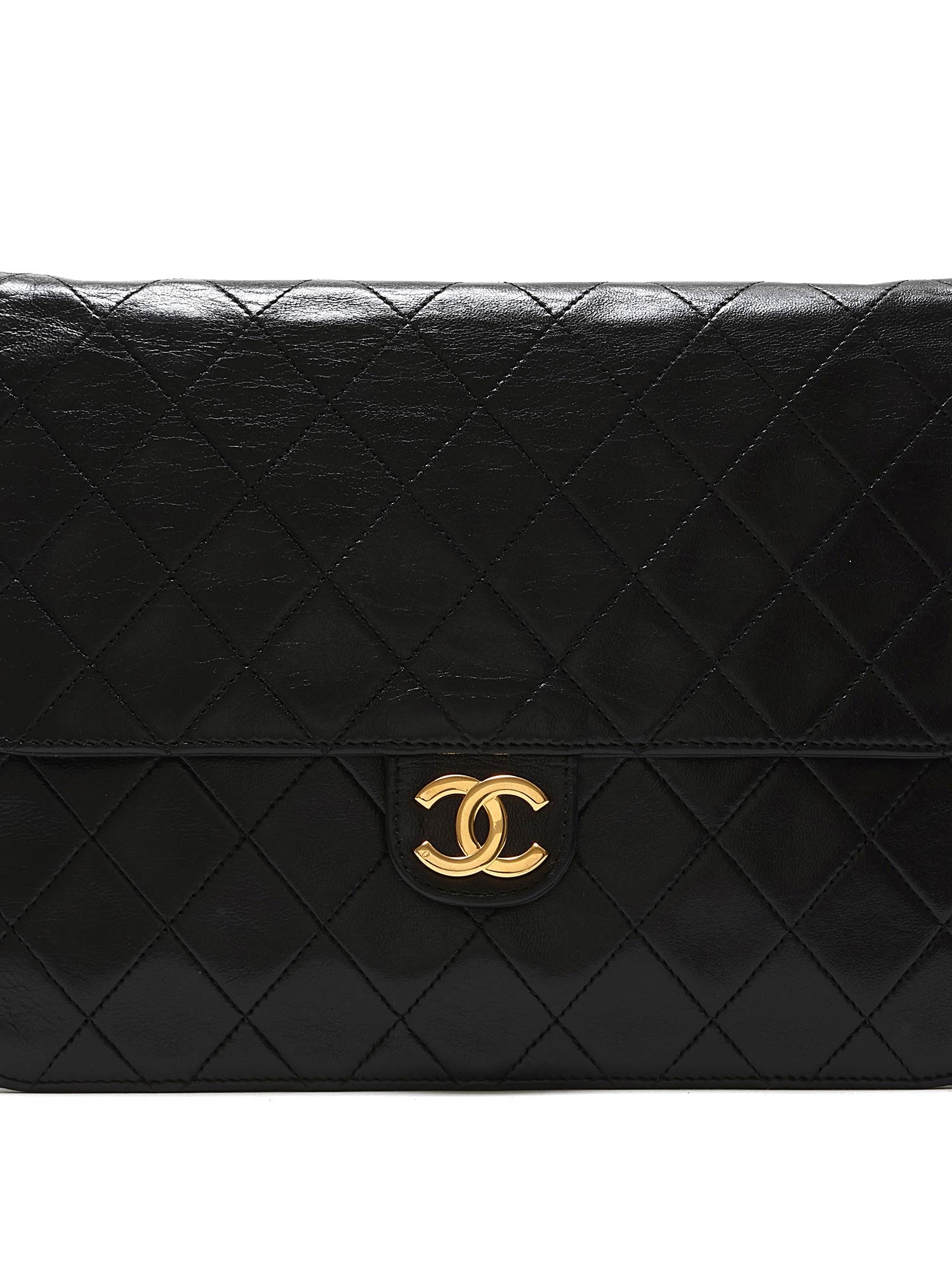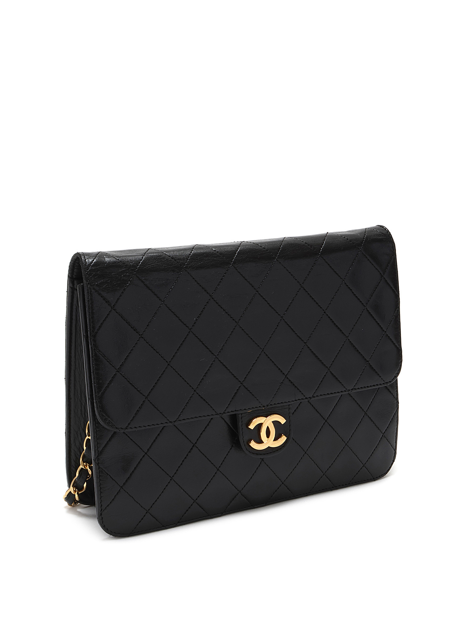 Iconic diamond-quilted black leather handbag with CC logo and interwoven leather and chain shoulder strap. Gold-tone hardware and CC turn-lock closure.