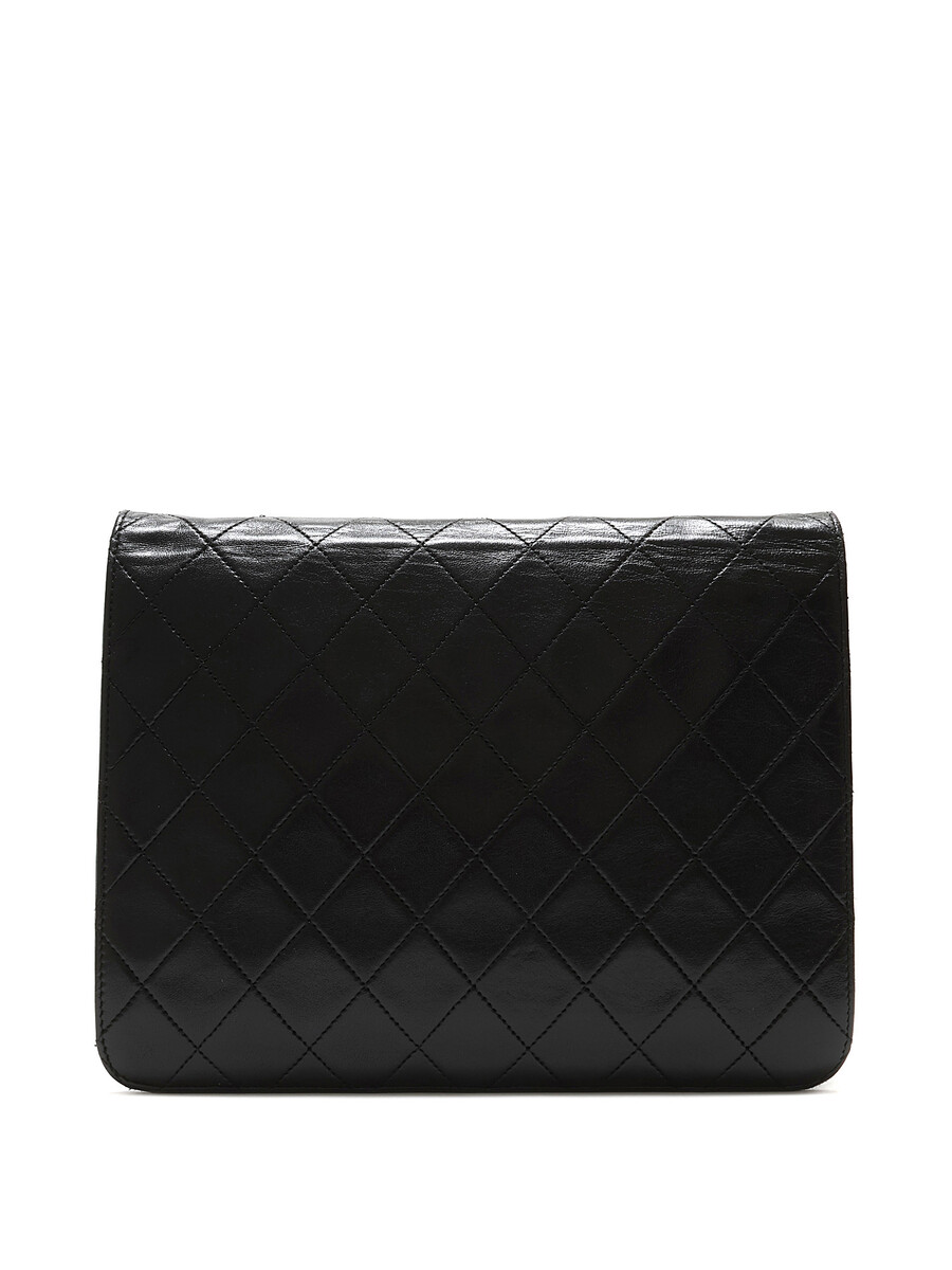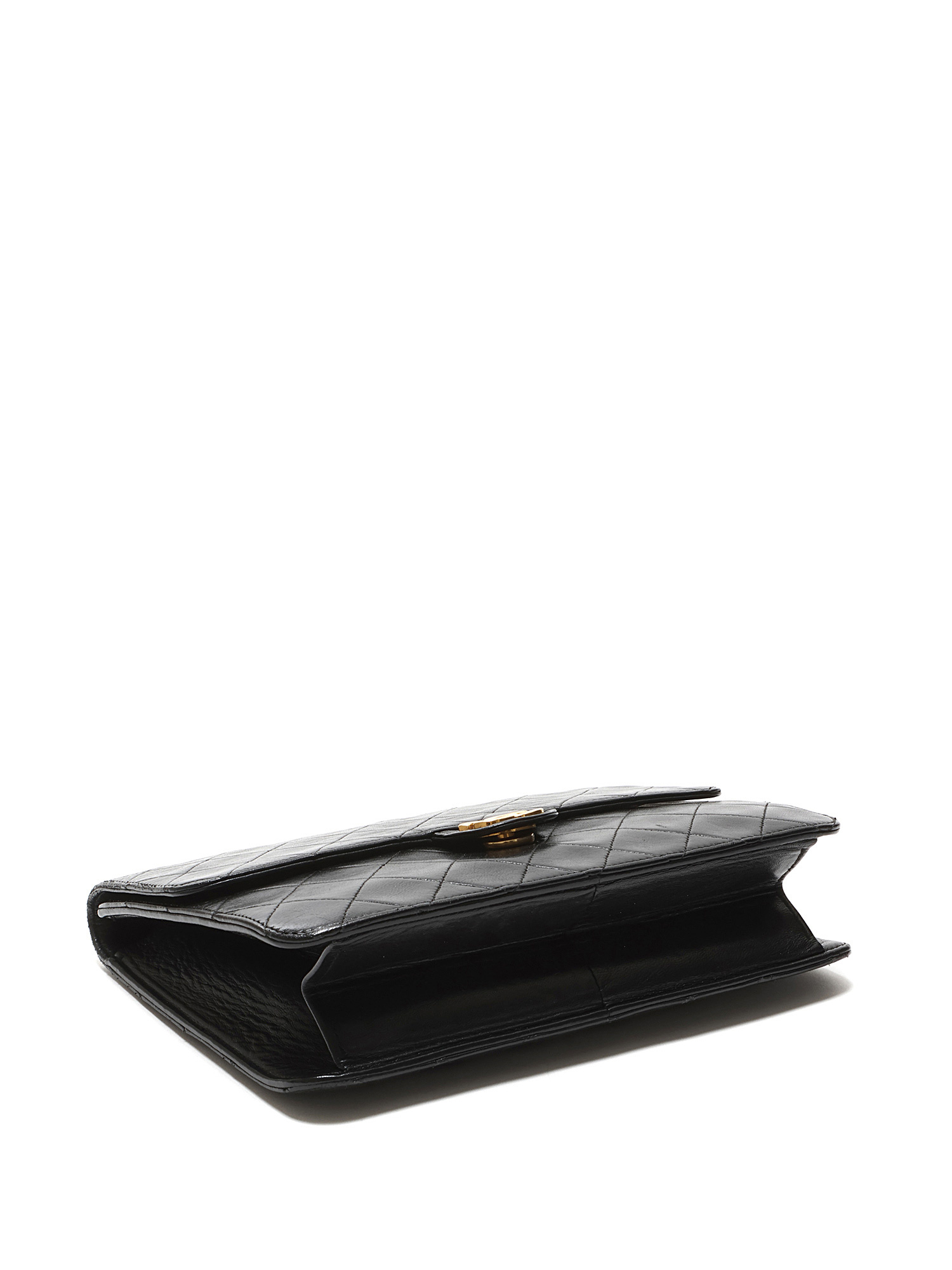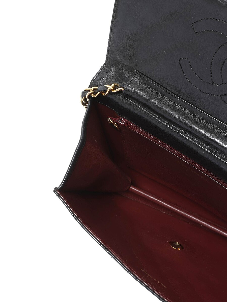 Iconic diamond-quilted black leather handbag with CC logo and interwoven leather and chain shoulder strap. Gold-tone hardware and CC turn-lock closure.