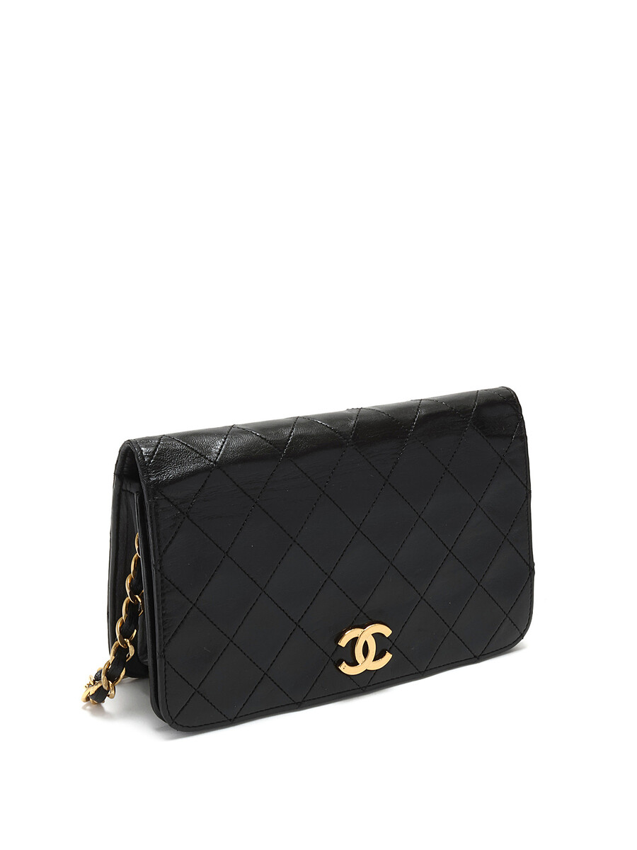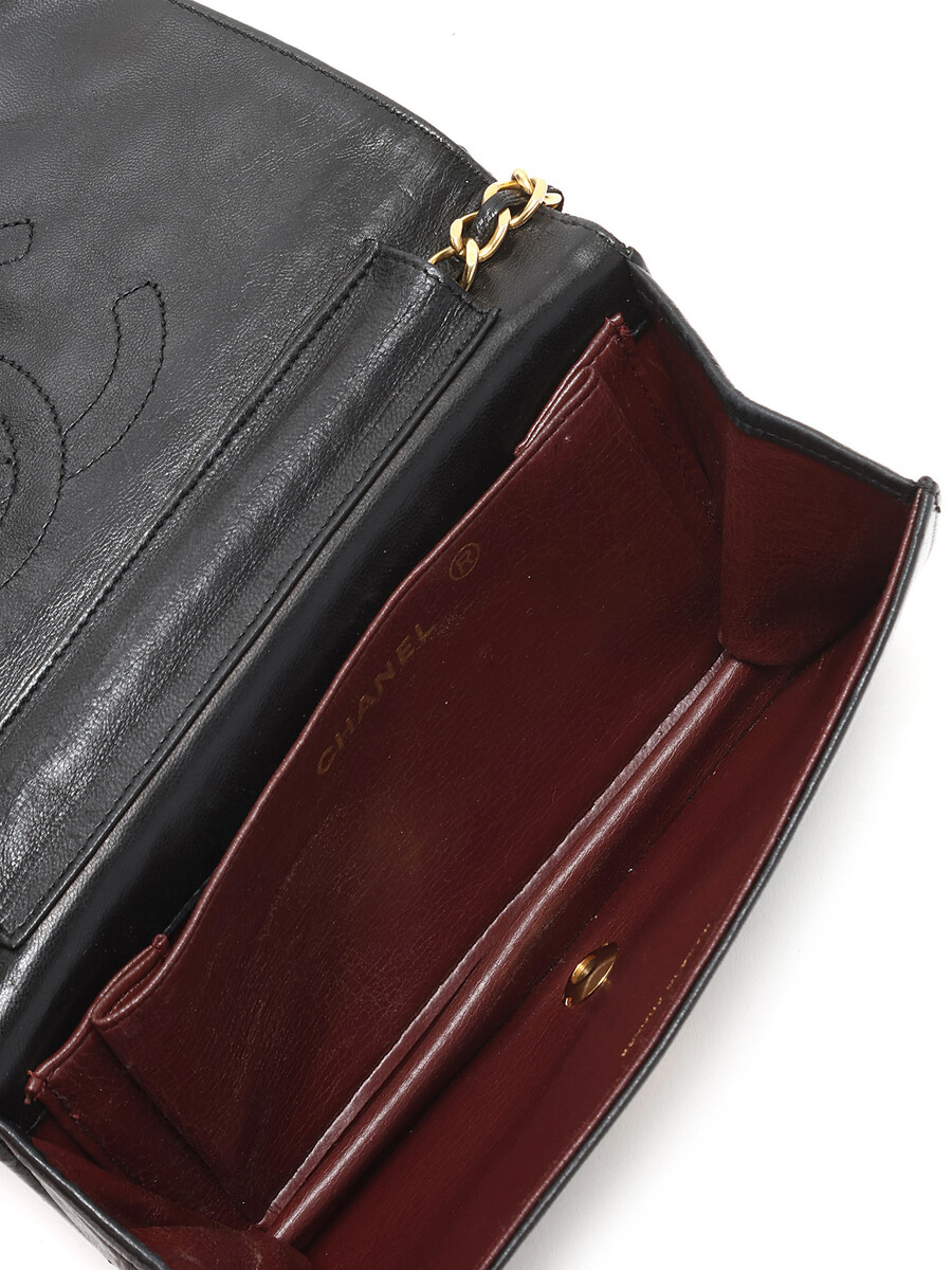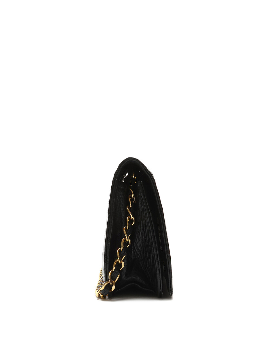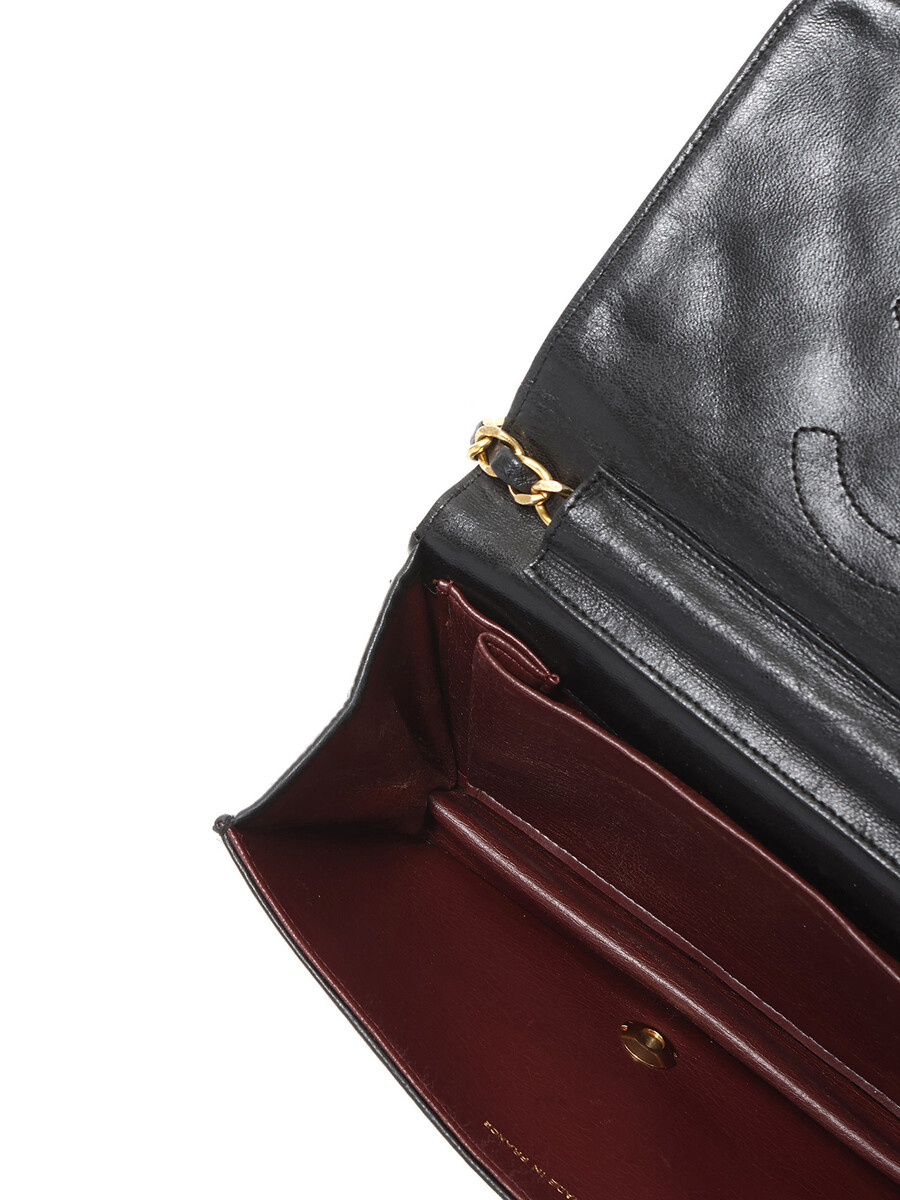 Quilted lambskin wallet on chain in black. Gold-tone hardware featuring a leather intertwined chain strap.